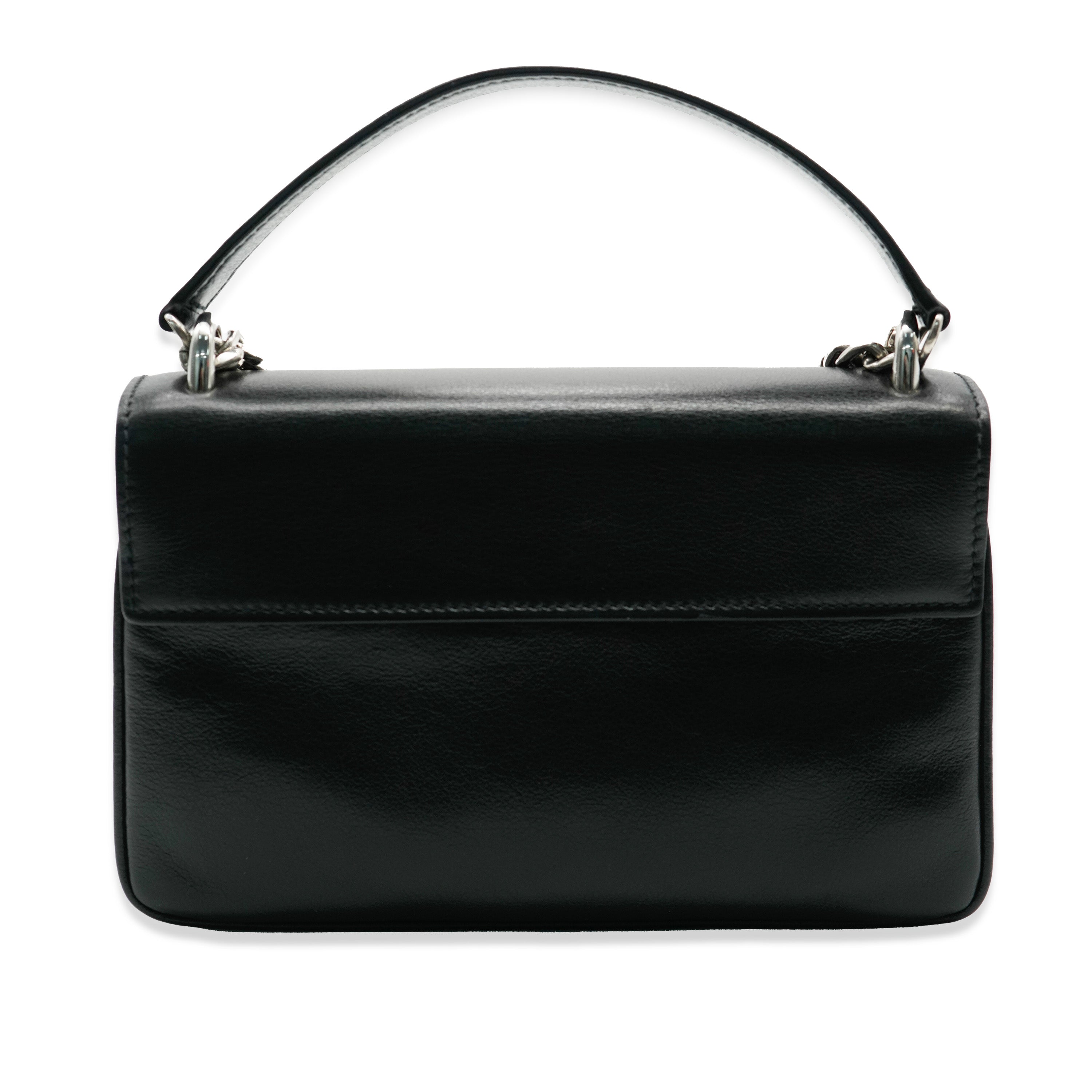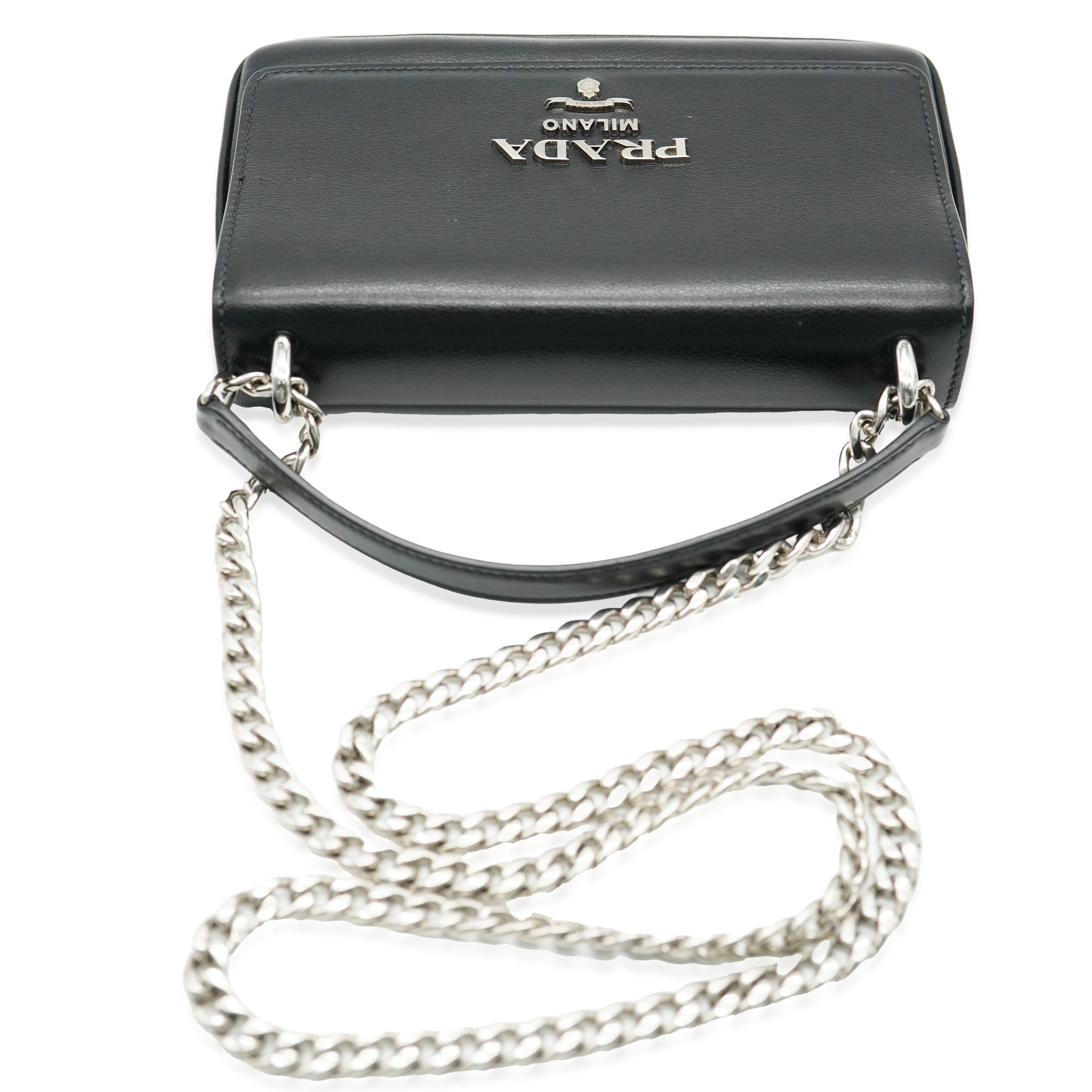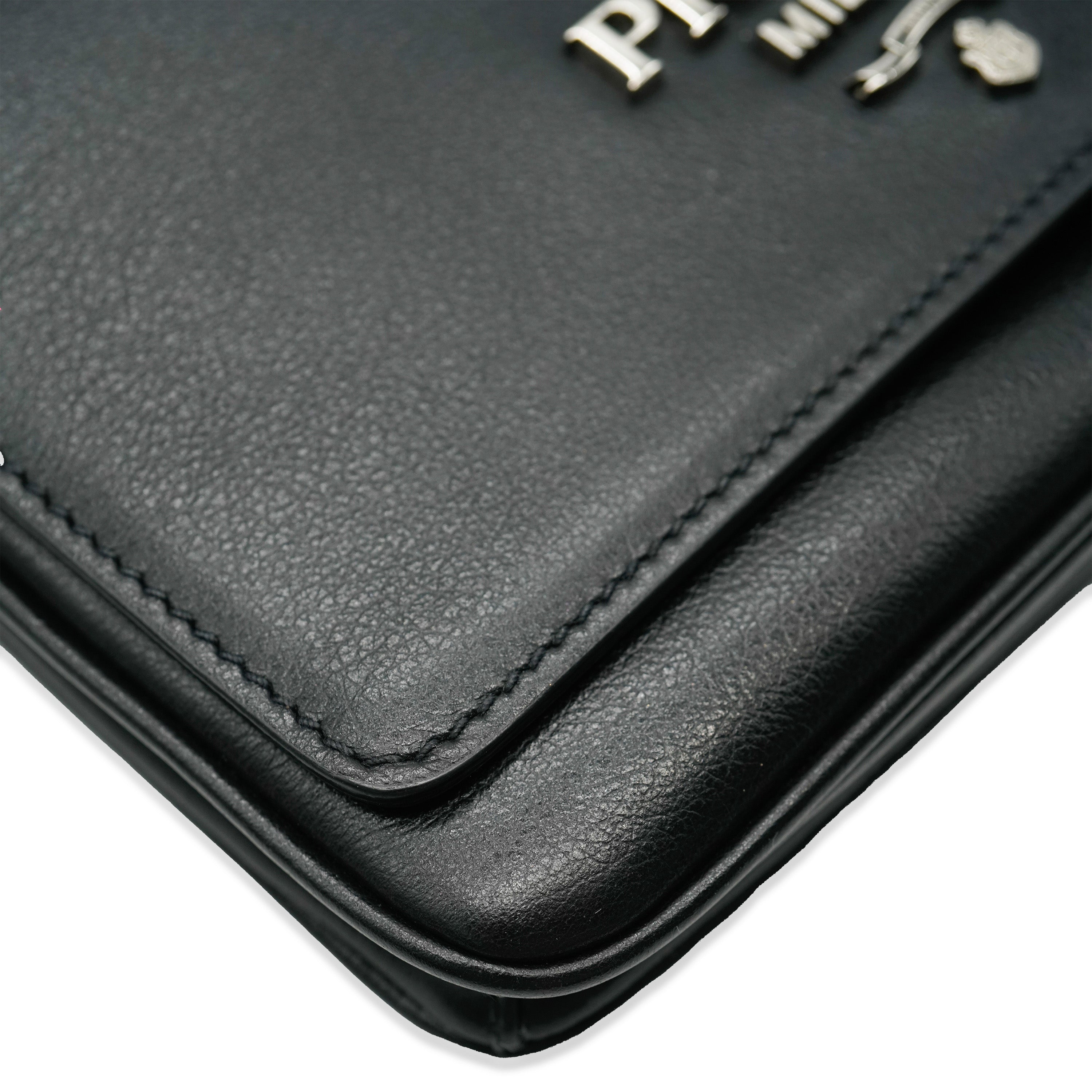 ¿Te apasiona la calidad? ¡Te encantará el bolso bandolera con cadena y solapa con logotipo de piel de becerro negra de PRADA! Este bolso en muy buen estado, fabricado en Italia, cuenta con un elegante exterior negro de lujosa piel de becerro. Con unas medidas de 20 x 13 x 2,5 cm, es compacto pero lo suficientemente espacioso como para guardar tus objetos esenciales. La longitud del asa de 30 cm y la correa de 45 cm ofrecen opciones de transporte versátiles. Completa tu atuendo y eleva tu estilo con esta impresionante pieza llamativa.