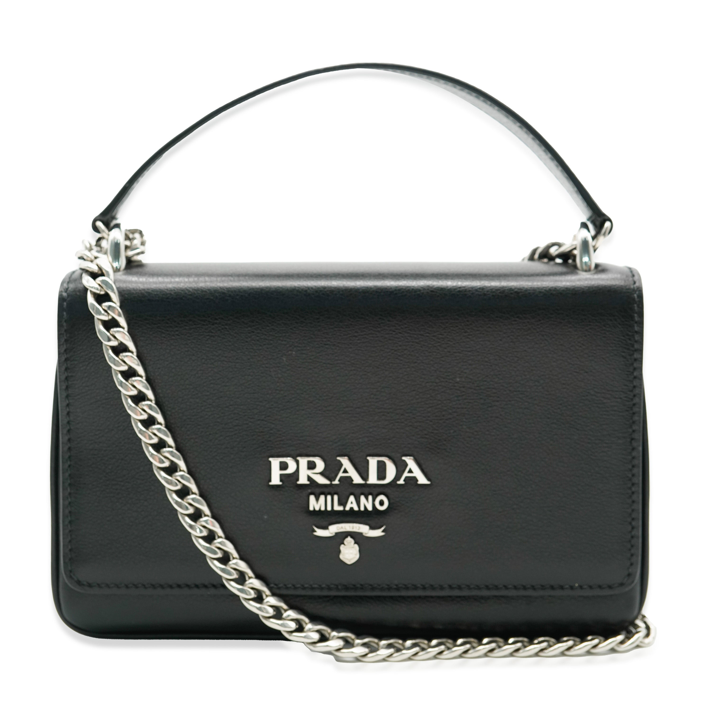 PRADA - Bolso bandolera con solapa y cadena de piel de becerro negra con logotipo