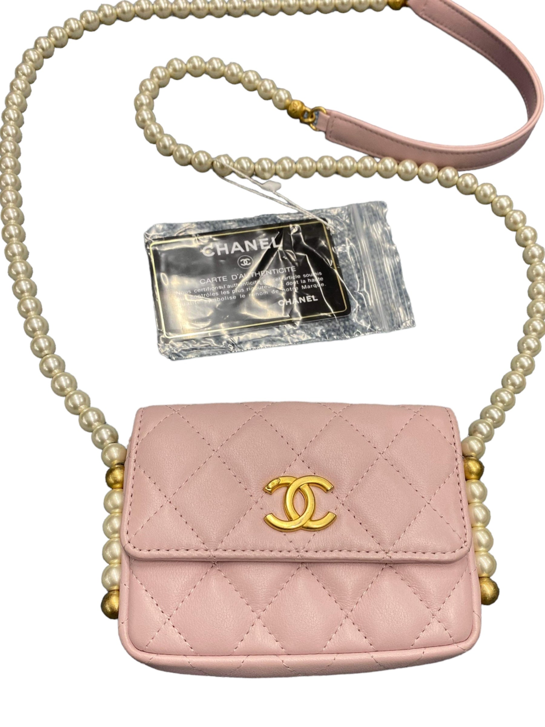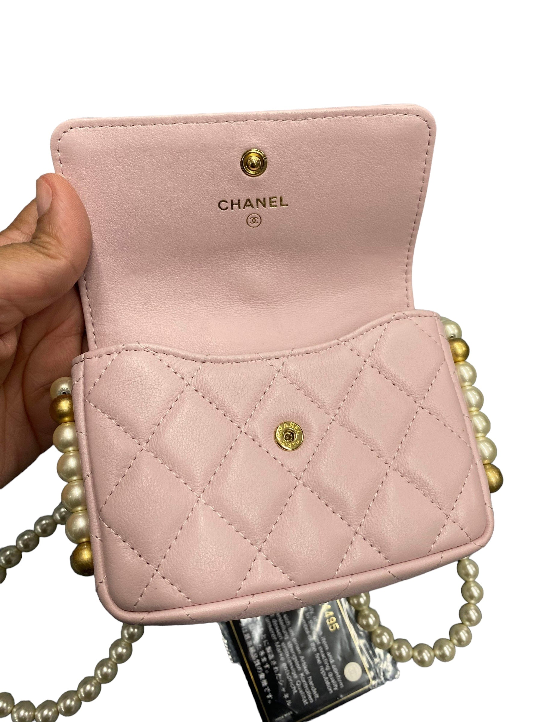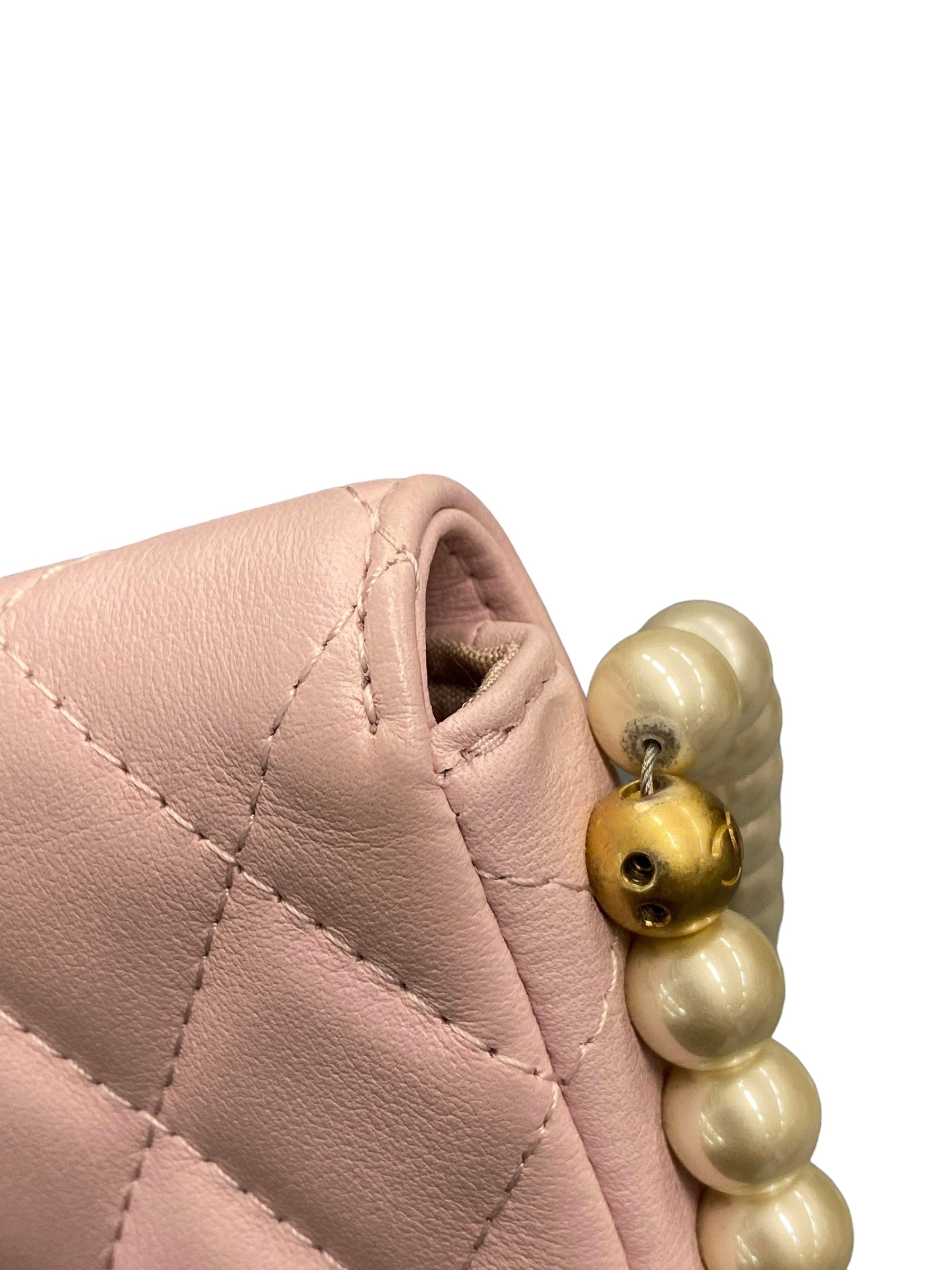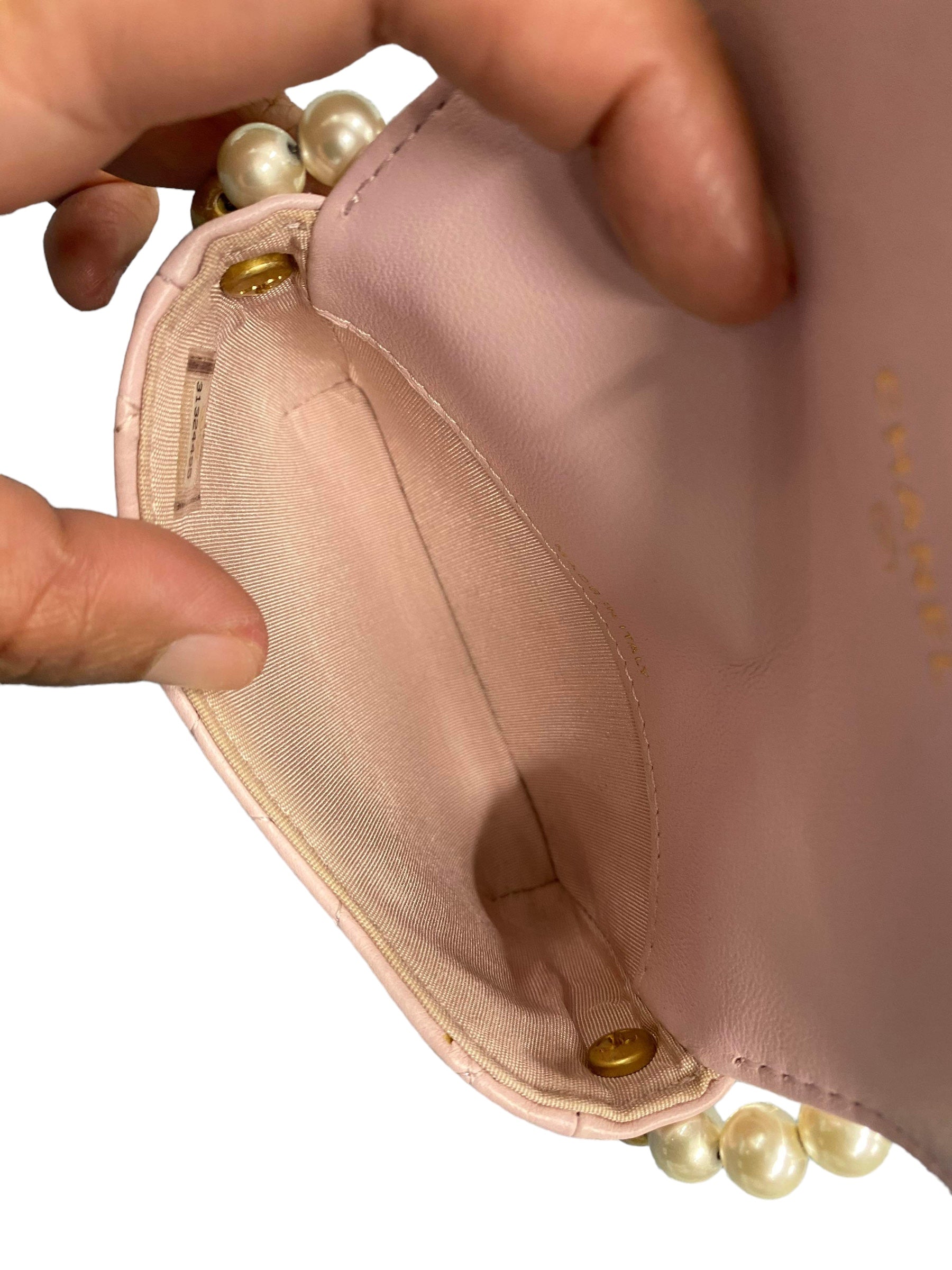 Impresionante cartera pequeña con cadena CHANEL 21S Classic Pearl en rosa claro. Esta codiciada pieza está elaborada por expertos en piel de becerro y terminada con herrajes dorados cepillados. Su cadena de perlas de imitación agrega un toque de elegancia y, al mismo tiempo, brinda comodidad con su correa de hombro de cuero. No se pierda esta belleza rara y atemporal. Incluye el juego completo.