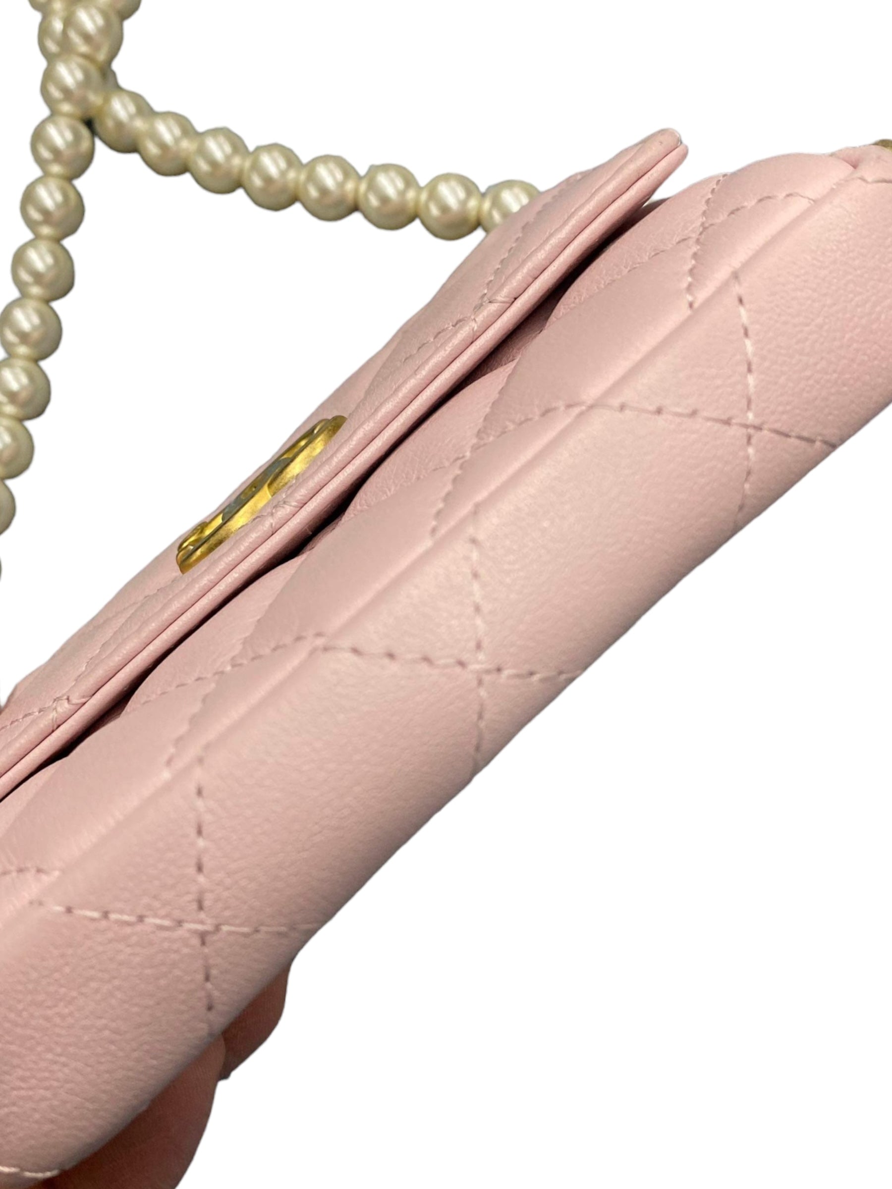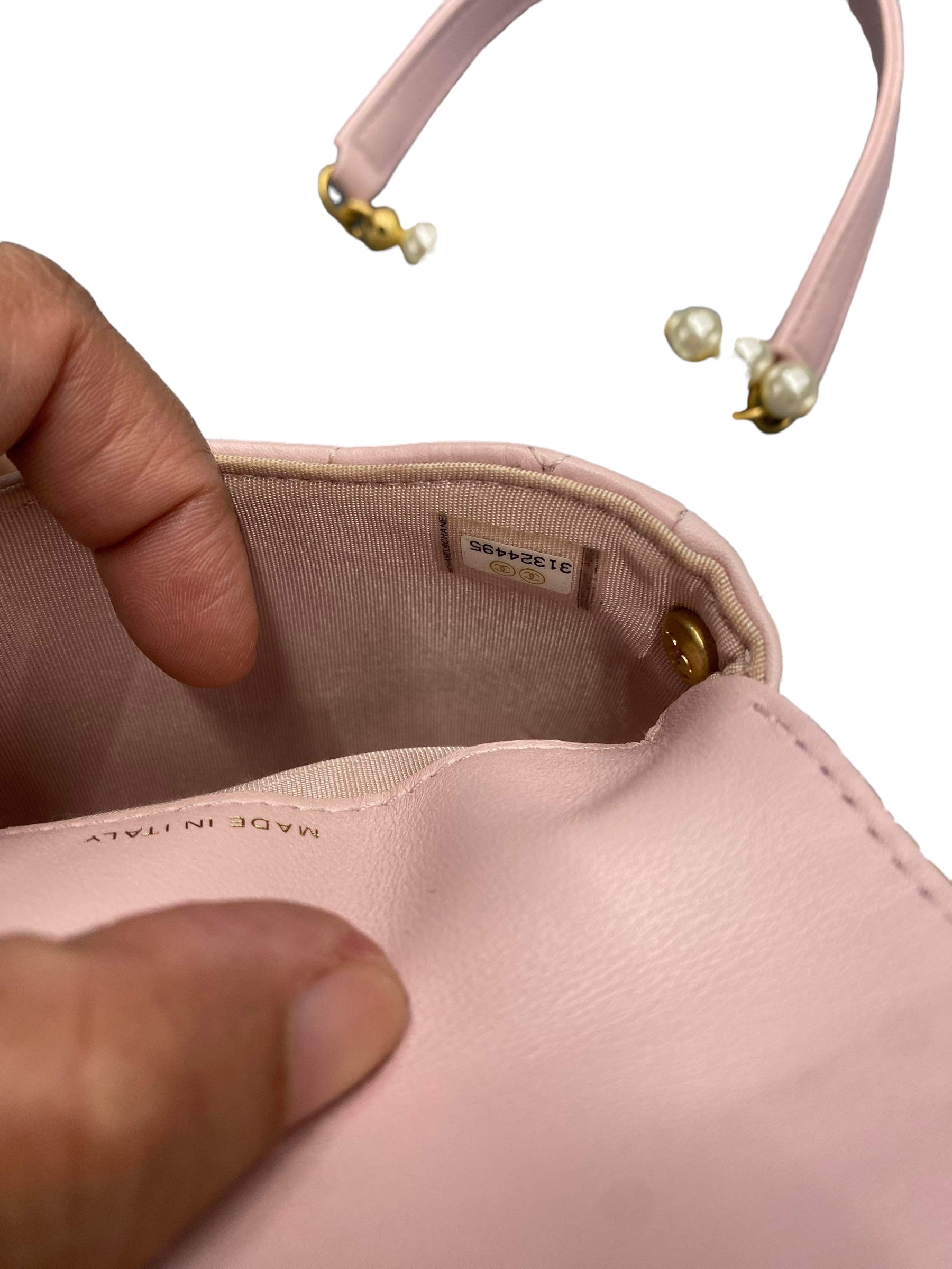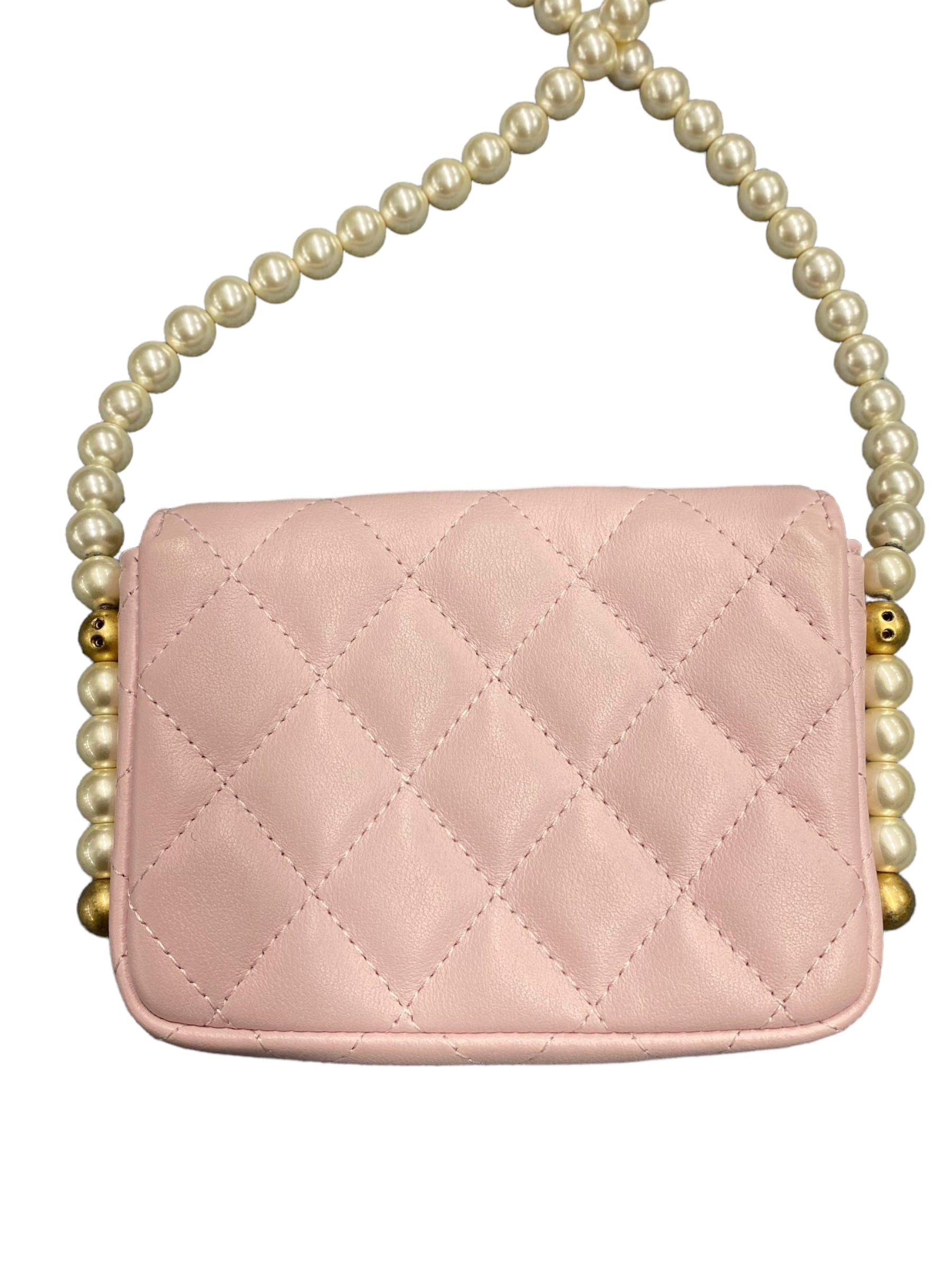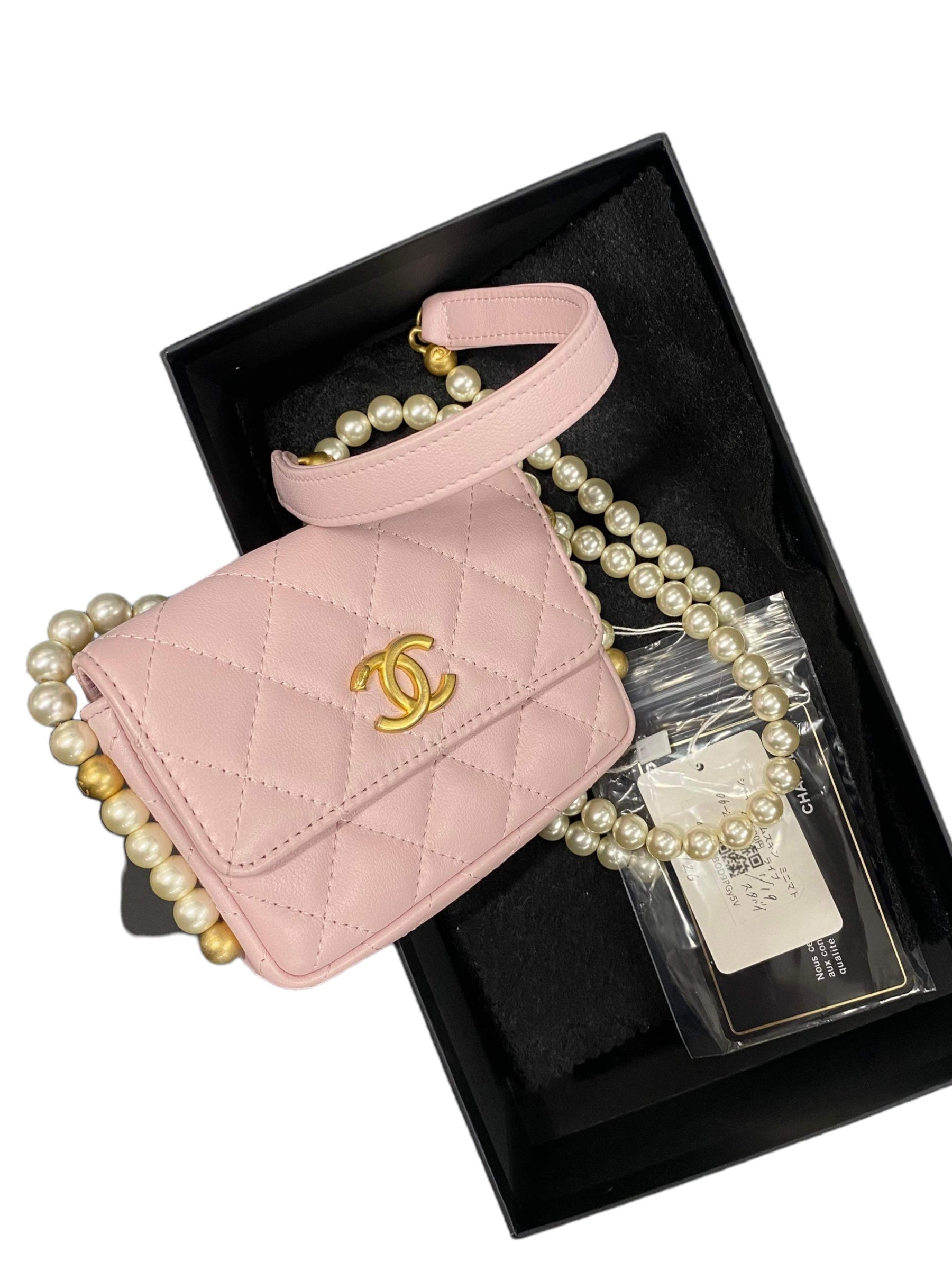 Impresionante cartera pequeña con cadena CHANEL 21S Classic Pearl en rosa claro. Esta codiciada pieza está elaborada por expertos en piel de becerro y terminada con herrajes dorados cepillados. Su cadena de perlas de imitación agrega un toque de elegancia y, al mismo tiempo, brinda comodidad con su correa de hombro de cuero. No se pierda esta belleza rara y atemporal. Incluye el juego completo.