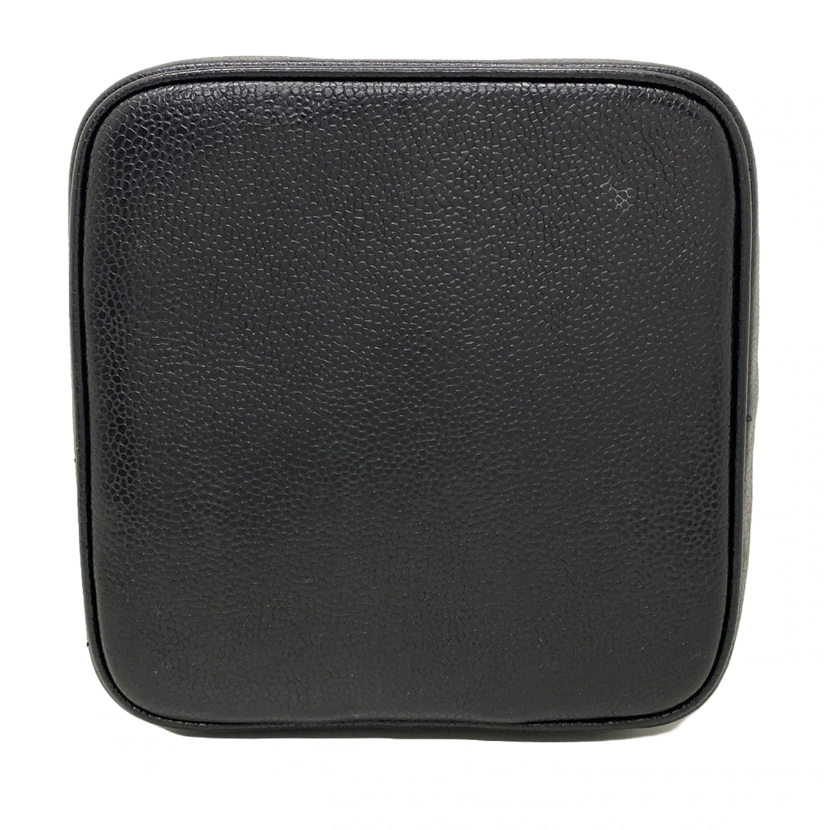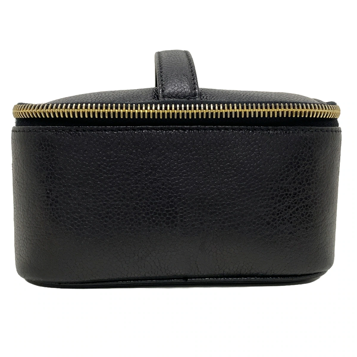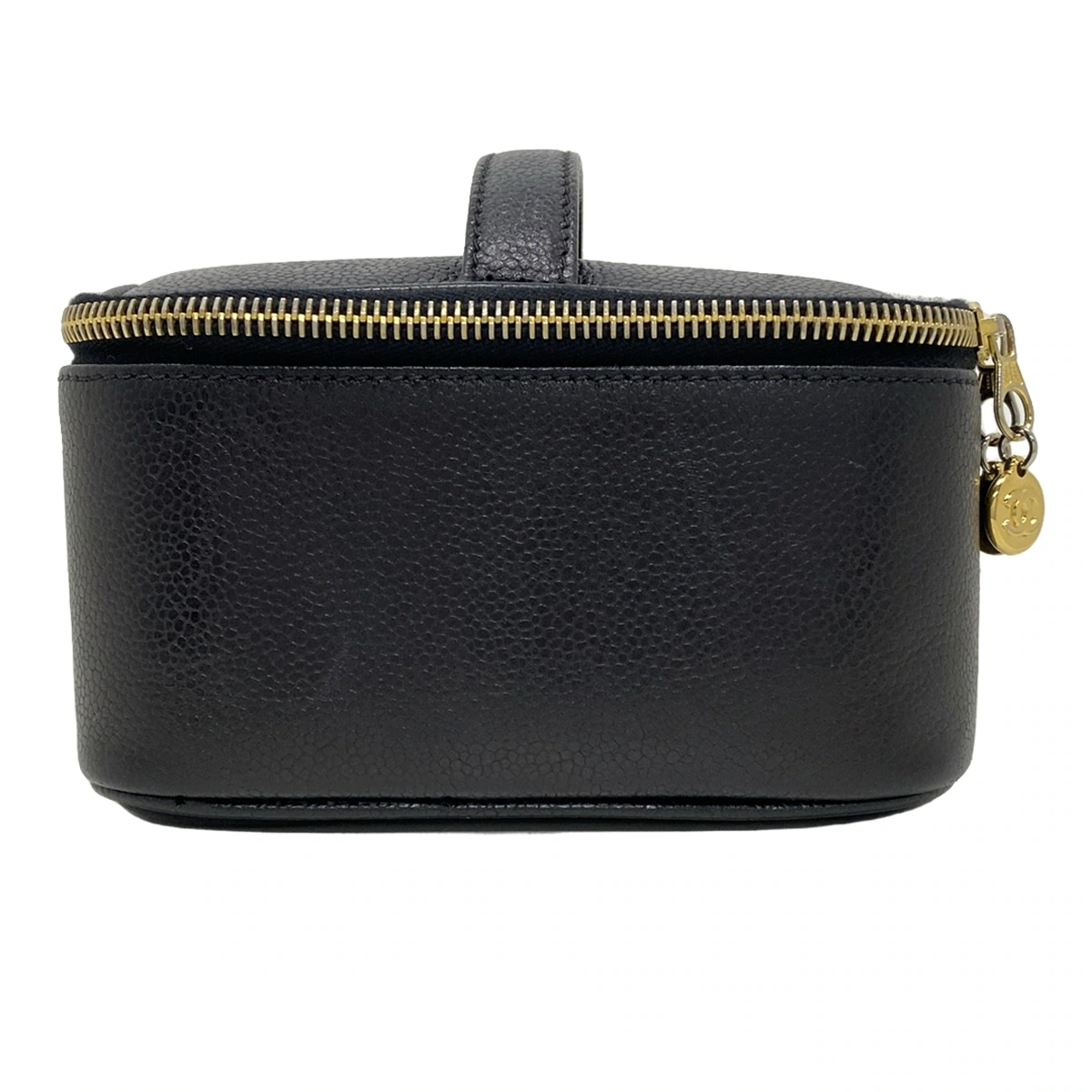 Descubra el lujoso bolso Vanity Bag de CHANEL en elegante piel de caviar negra. Este bolso portátil cuenta con un espacioso compartimento interior y un exterior duradero con mínimas señales de uso. Perfecto para llevar sus artículos esenciales con estilo y sofisticación. Eleve su colección de accesorios con esta icónica pieza. Medidas Alto: 3,54 pulgadas (9 cm) Ancho: 6,69 pulgadas (17 cm) Profundidad: 6,3 pulgadas