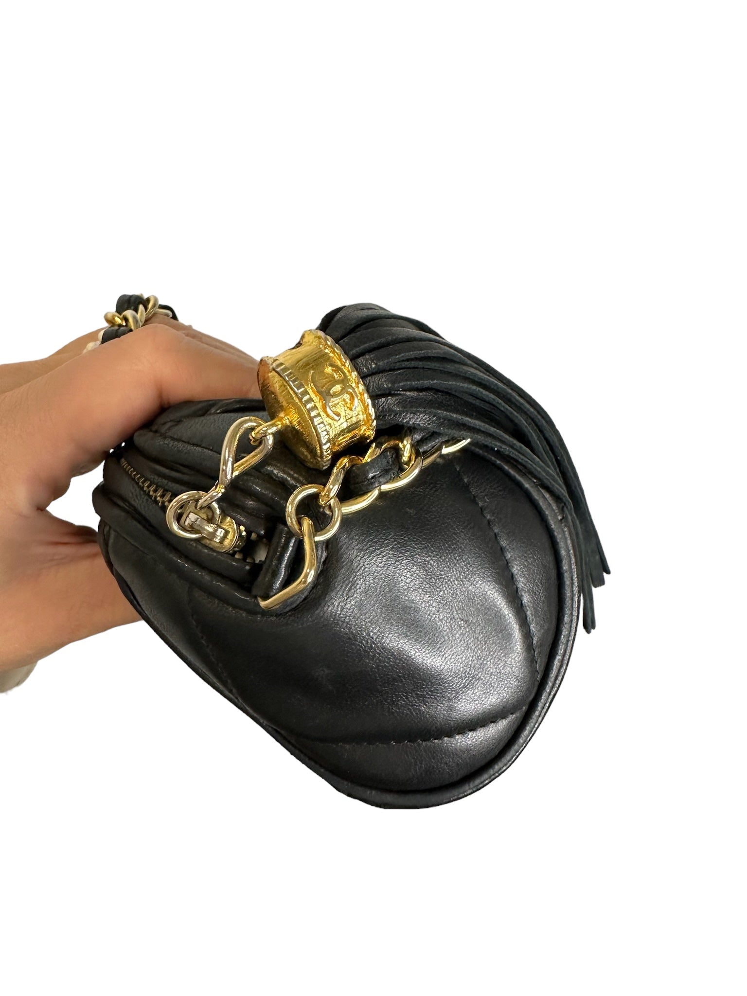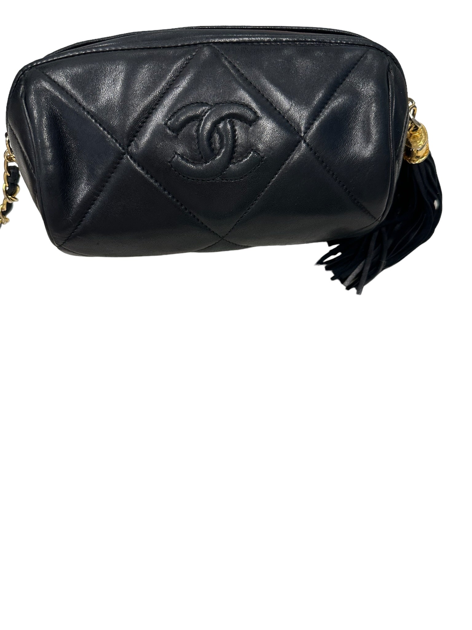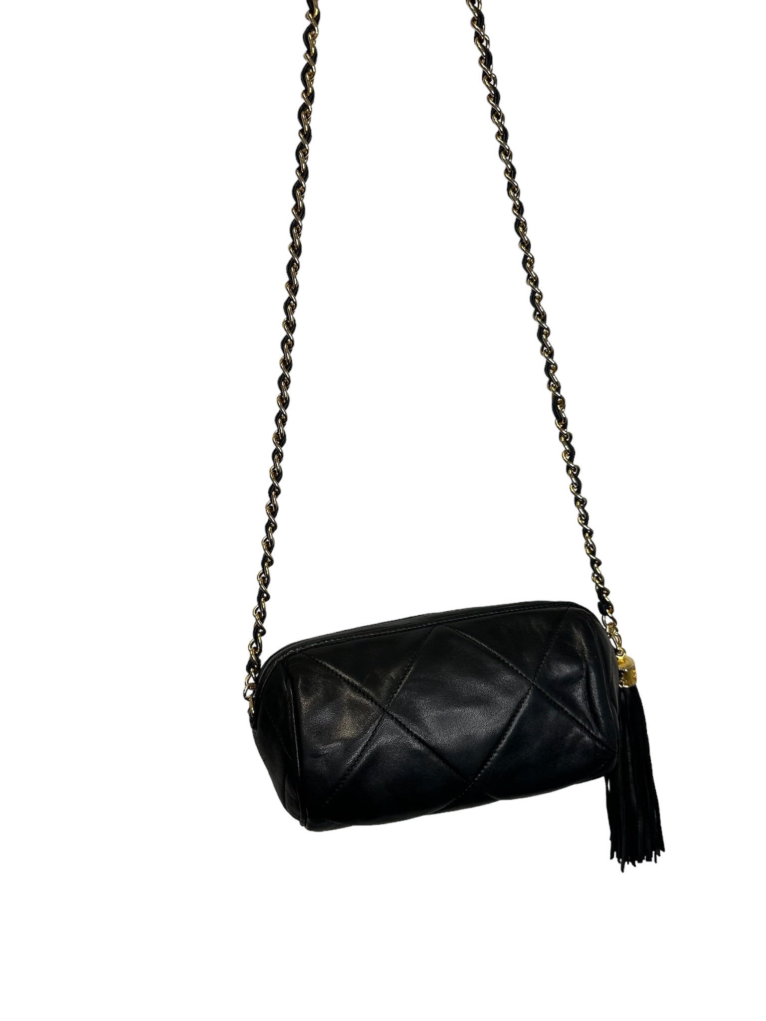 Realza tu estilo con el bolso CHANEL Vintage Black Quilted Lambskin Diamond CC Barrel. Con lujosos detalles en tono dorado, este icónico bolso añade un toque de sofisticación a cualquier atuendo. Fabricado en piel de cordero de alta calidad, irradia elegancia y atractivo atemporal.