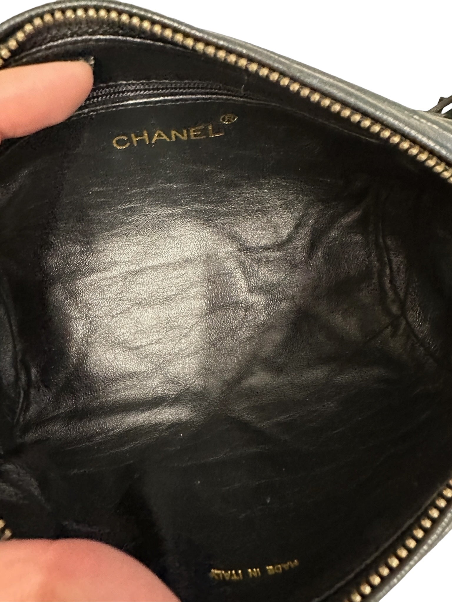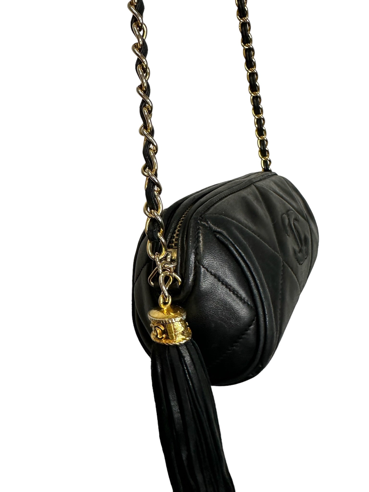 CHANEL - Bolso barril vintage CC de piel de cordero acolchada negra con diamantes