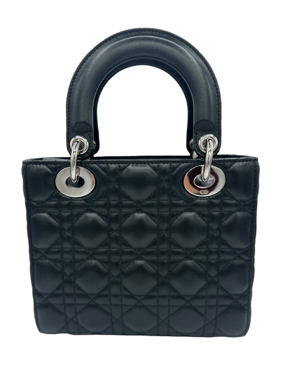 Este bolso de mano Lady Dior pequeño de cuero negro de Dior usado es una pieza atemporal que es perfecta para cualquier ocasión.