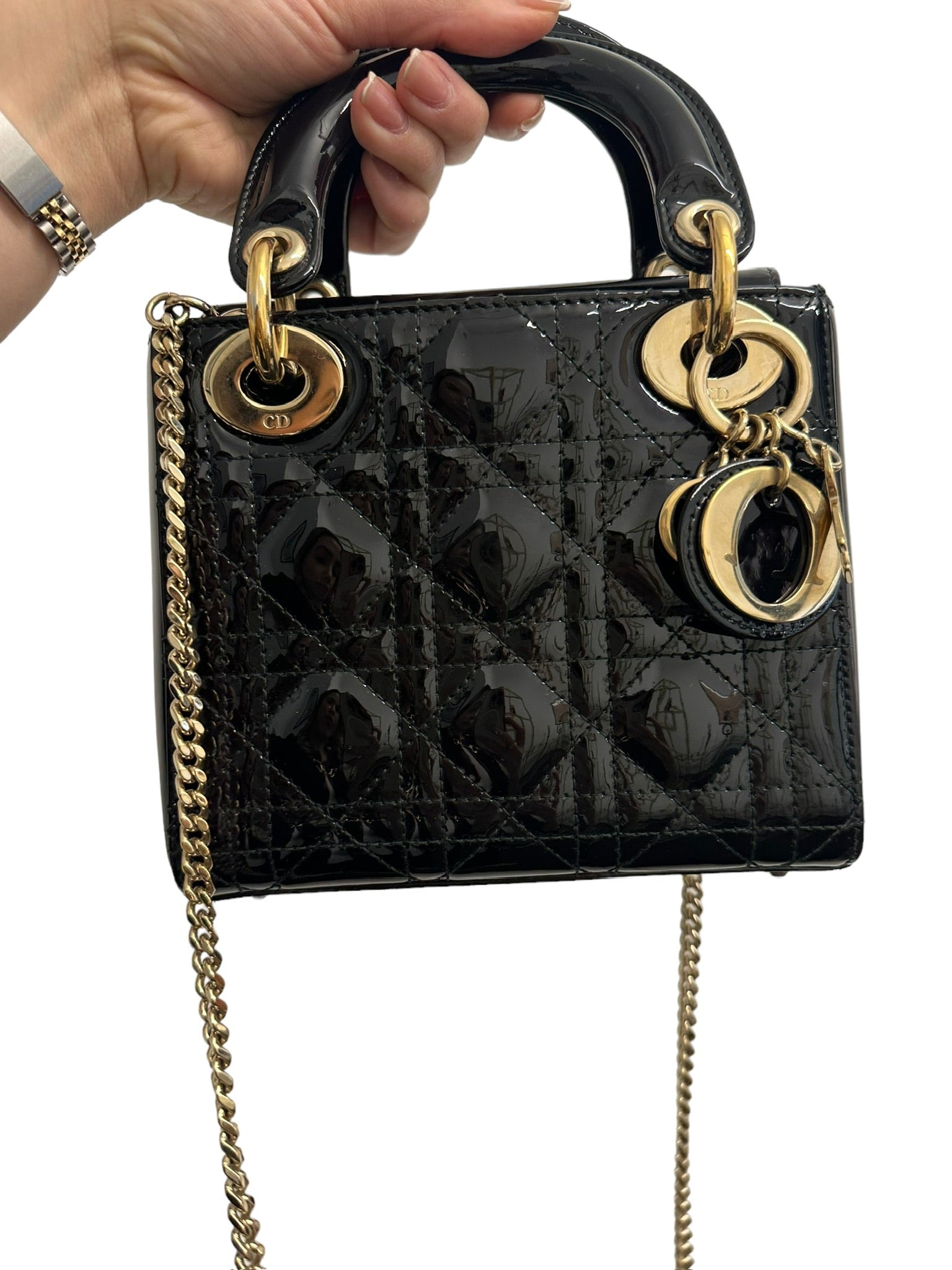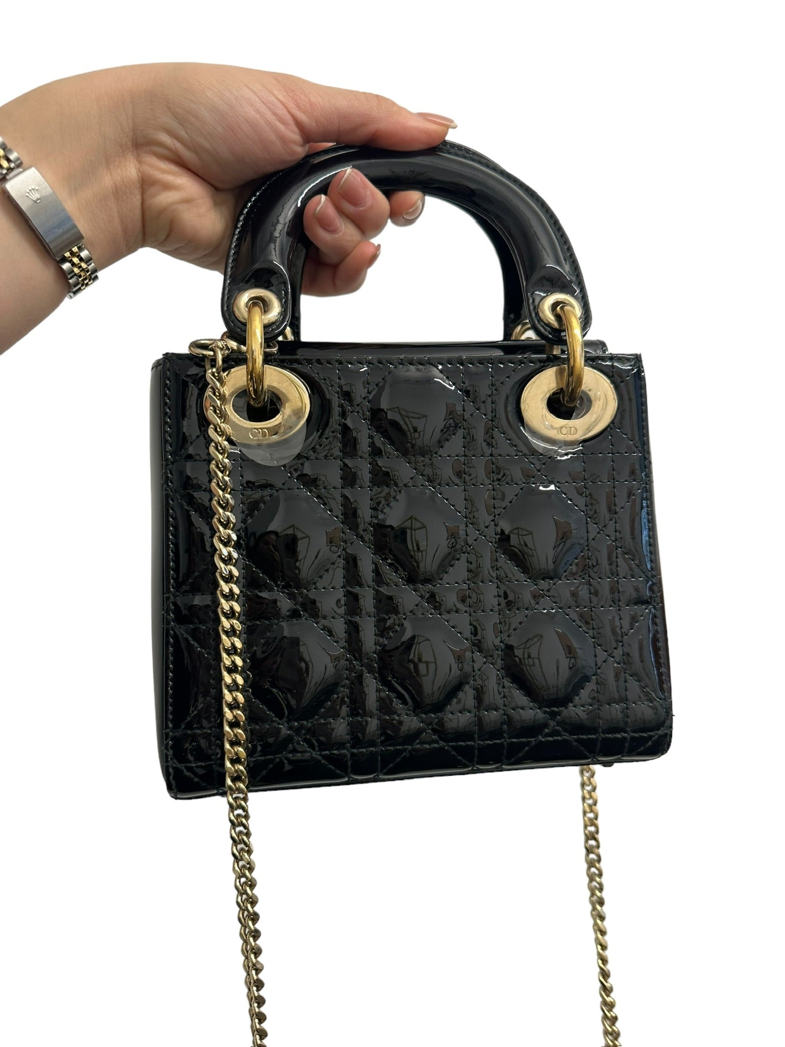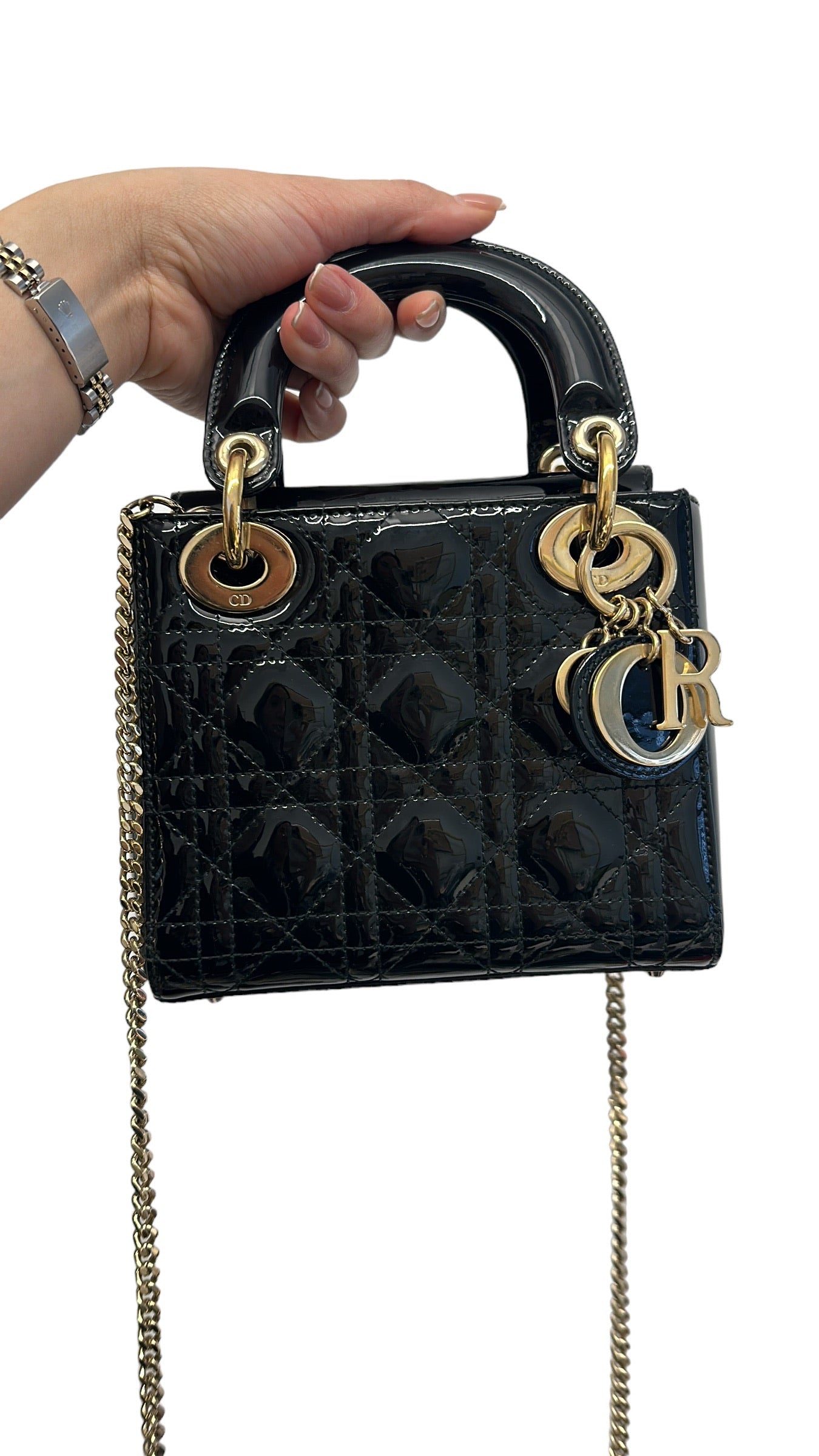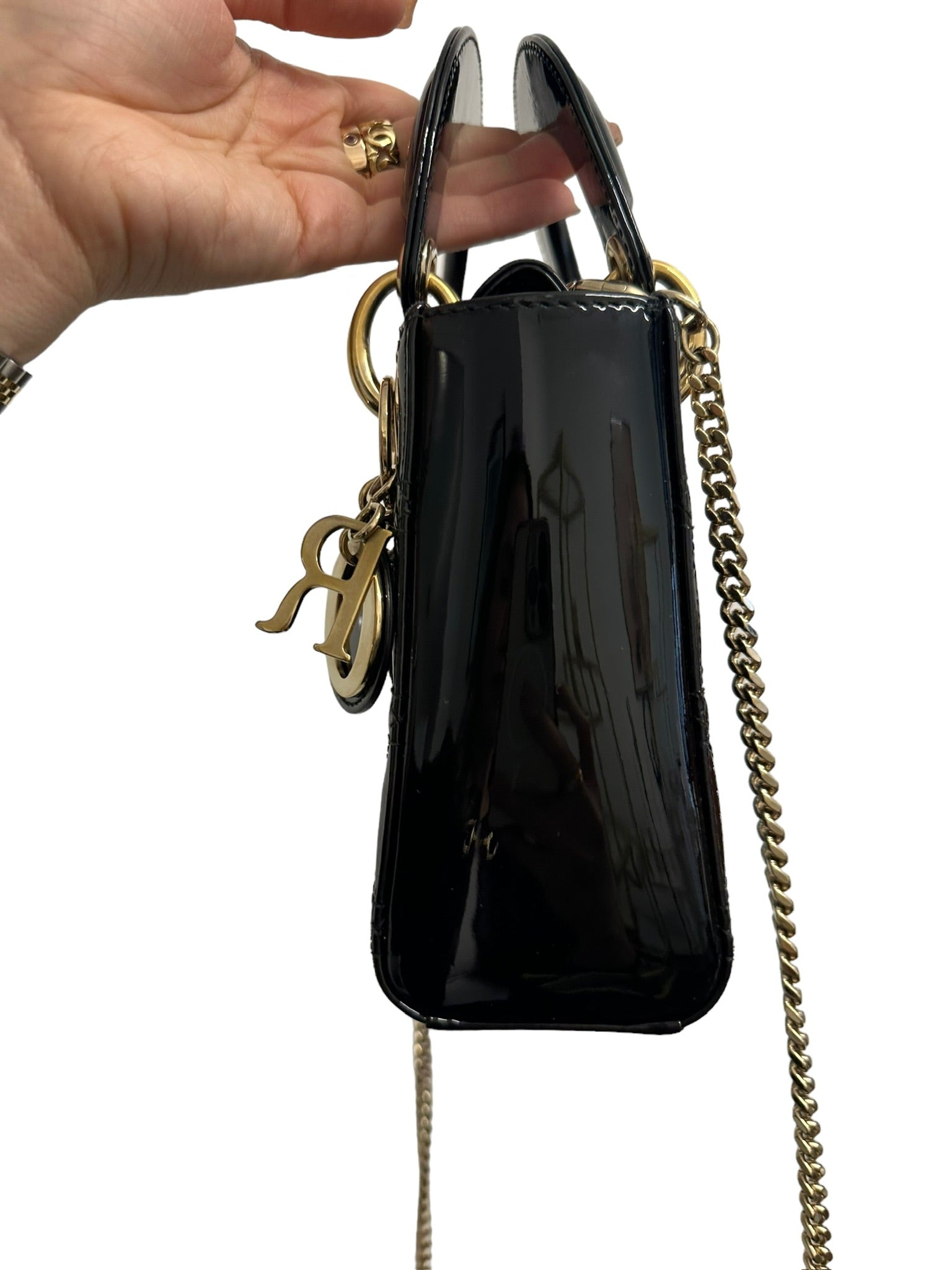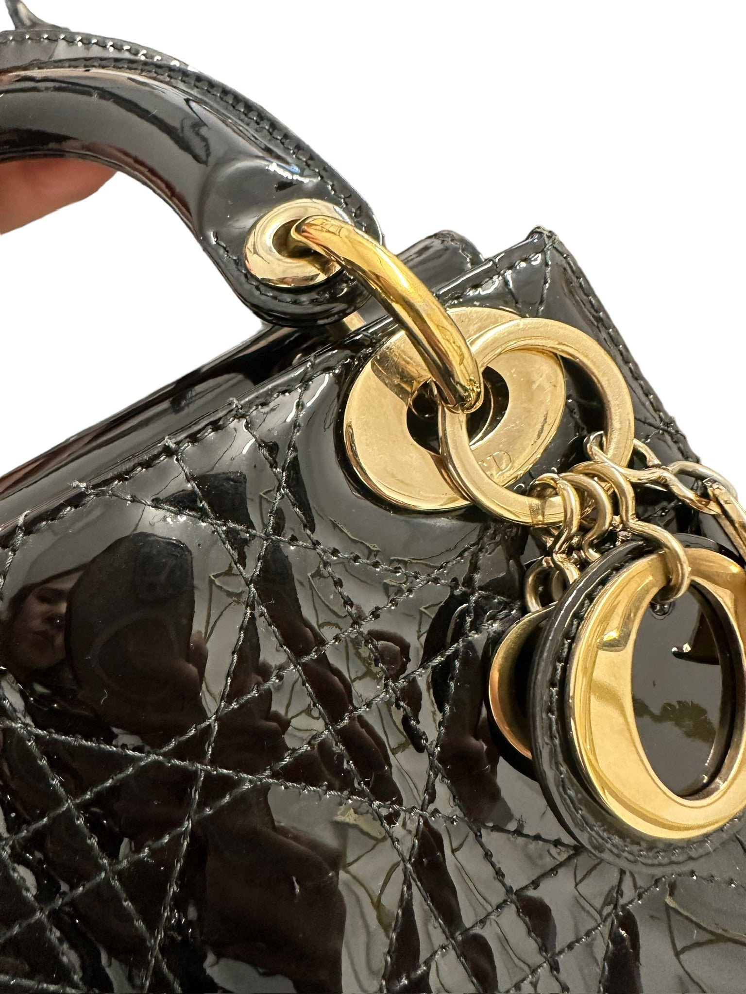 Experimente la moda de lujo con el bolso Lady Dior DIOR - Black Patent. El elegante diseño de charol se complementa con detalles dorados que añaden un toque elegante a cualquier atuendo. Realce su estilo y destaque con esta pieza atemporal.