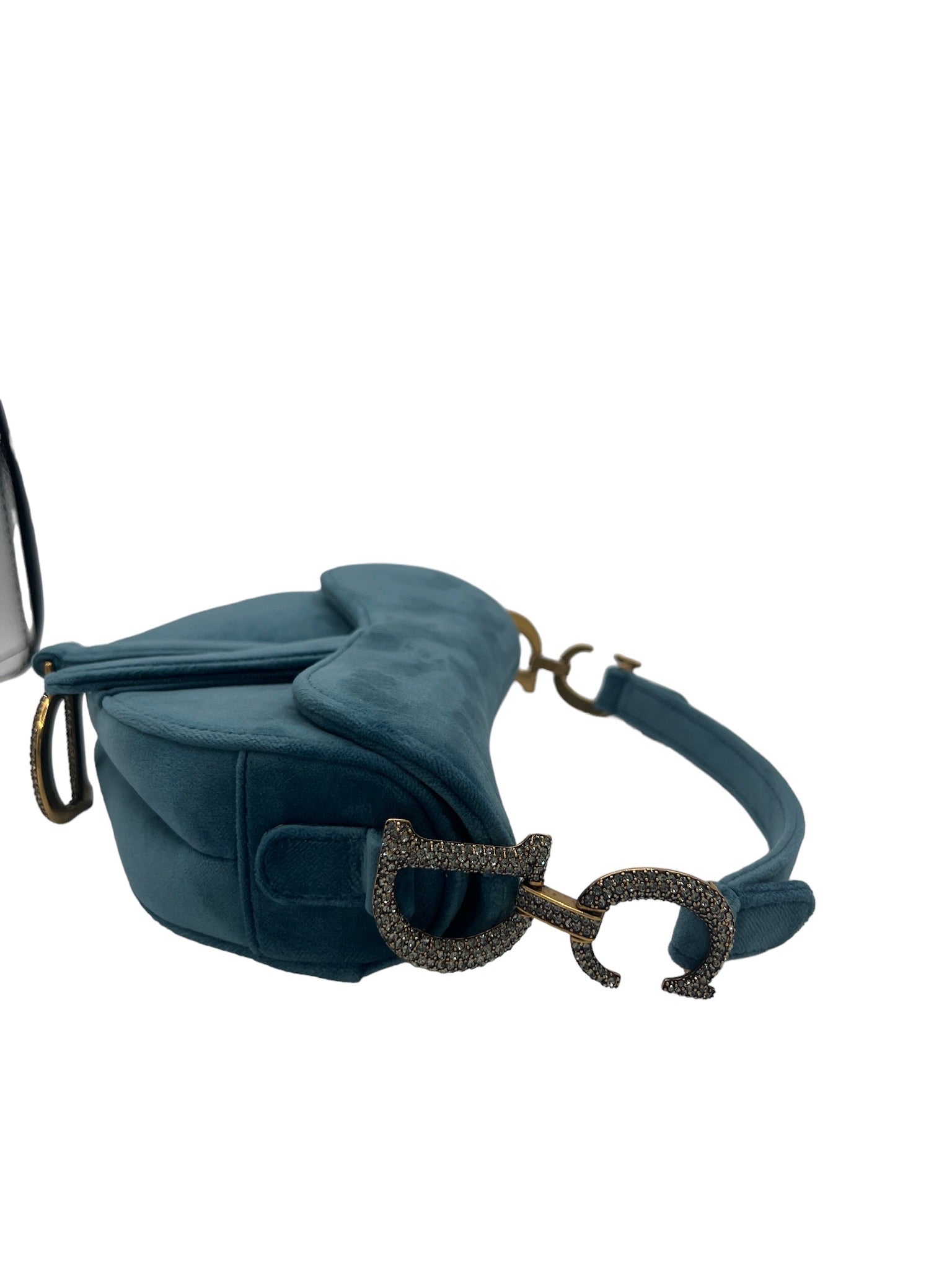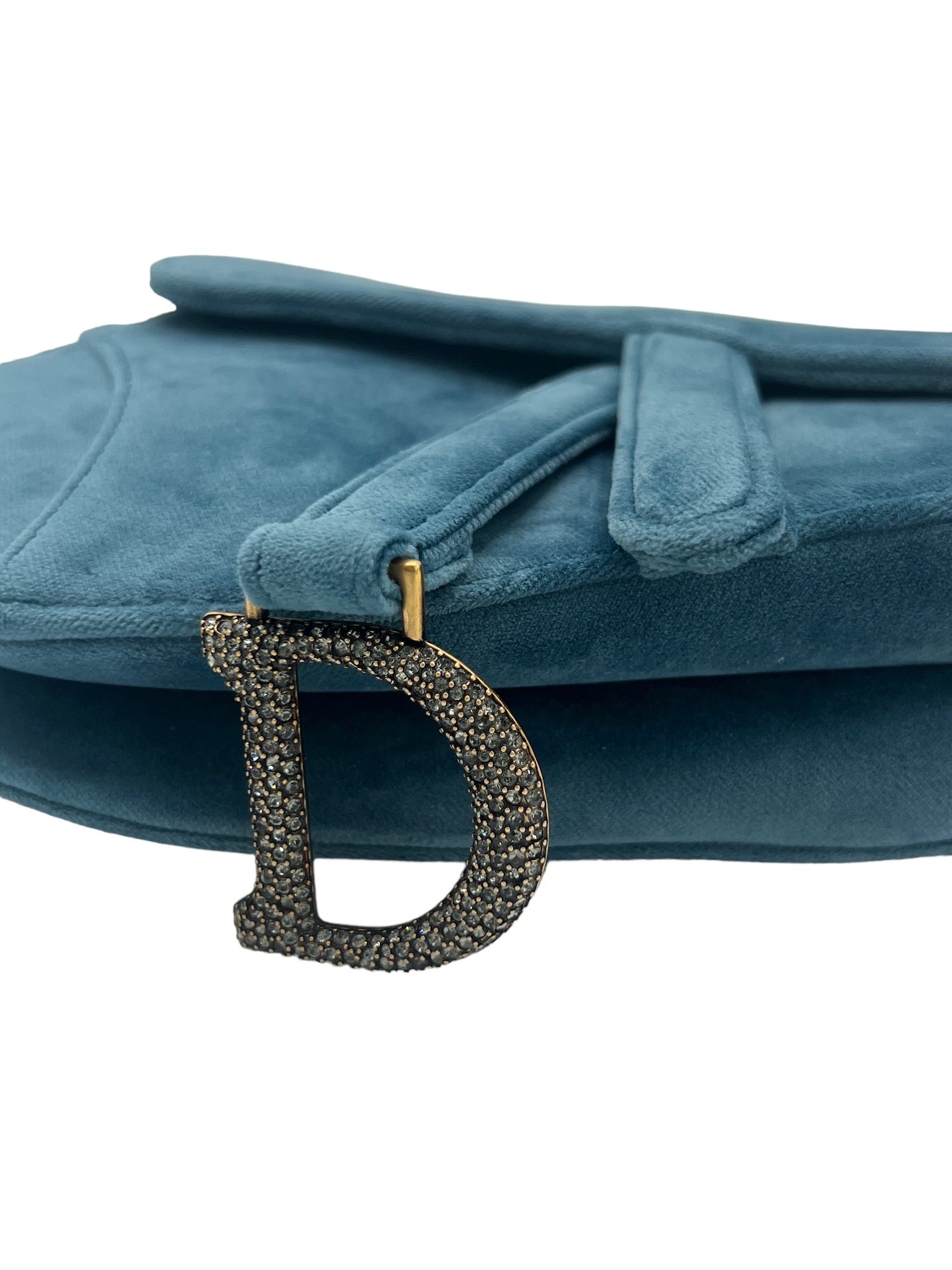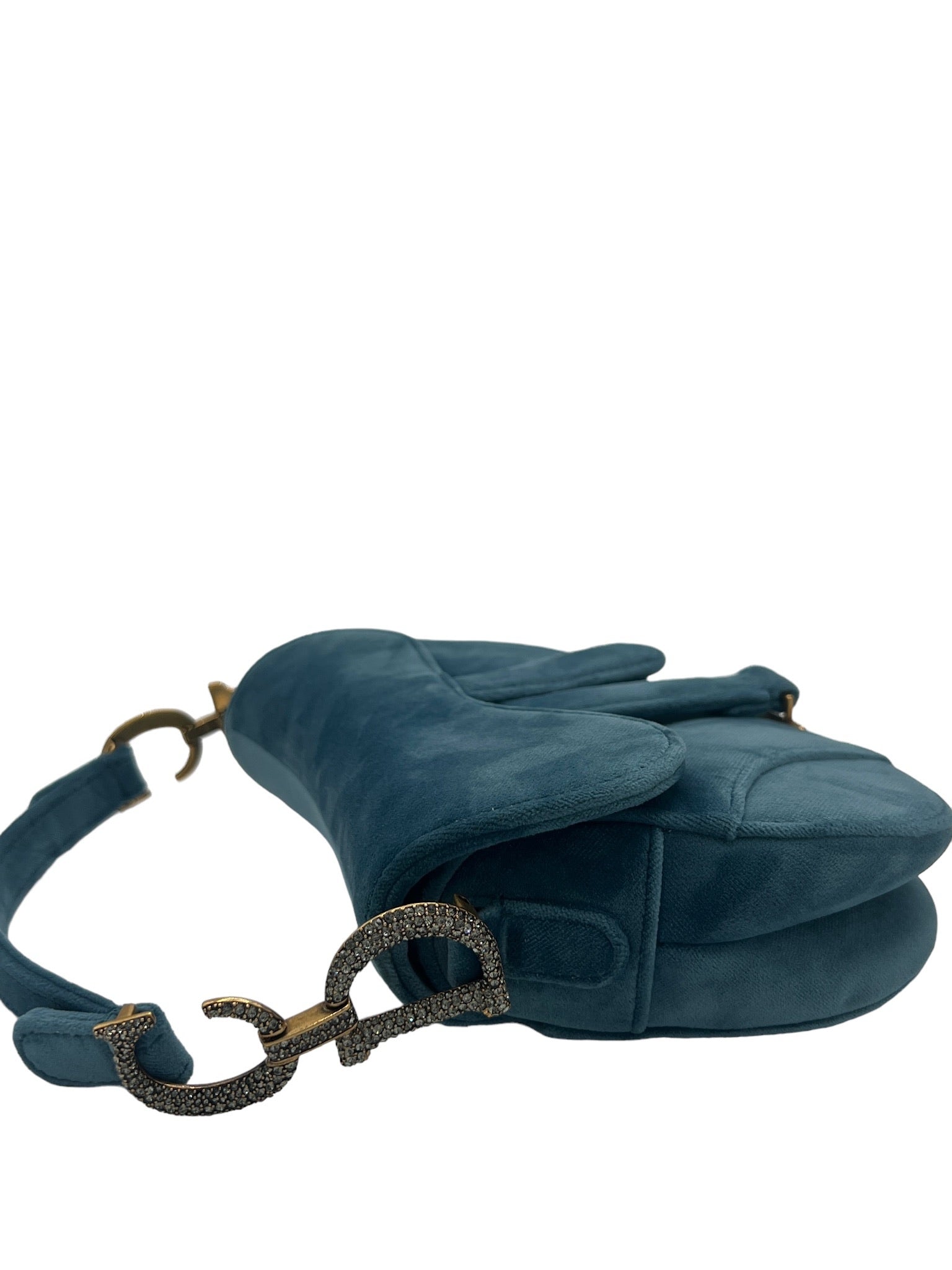 Este bolso de hombro Saddle con cristales de terciopelo azul de Dior usado es una sorprendente incorporación a su colección.