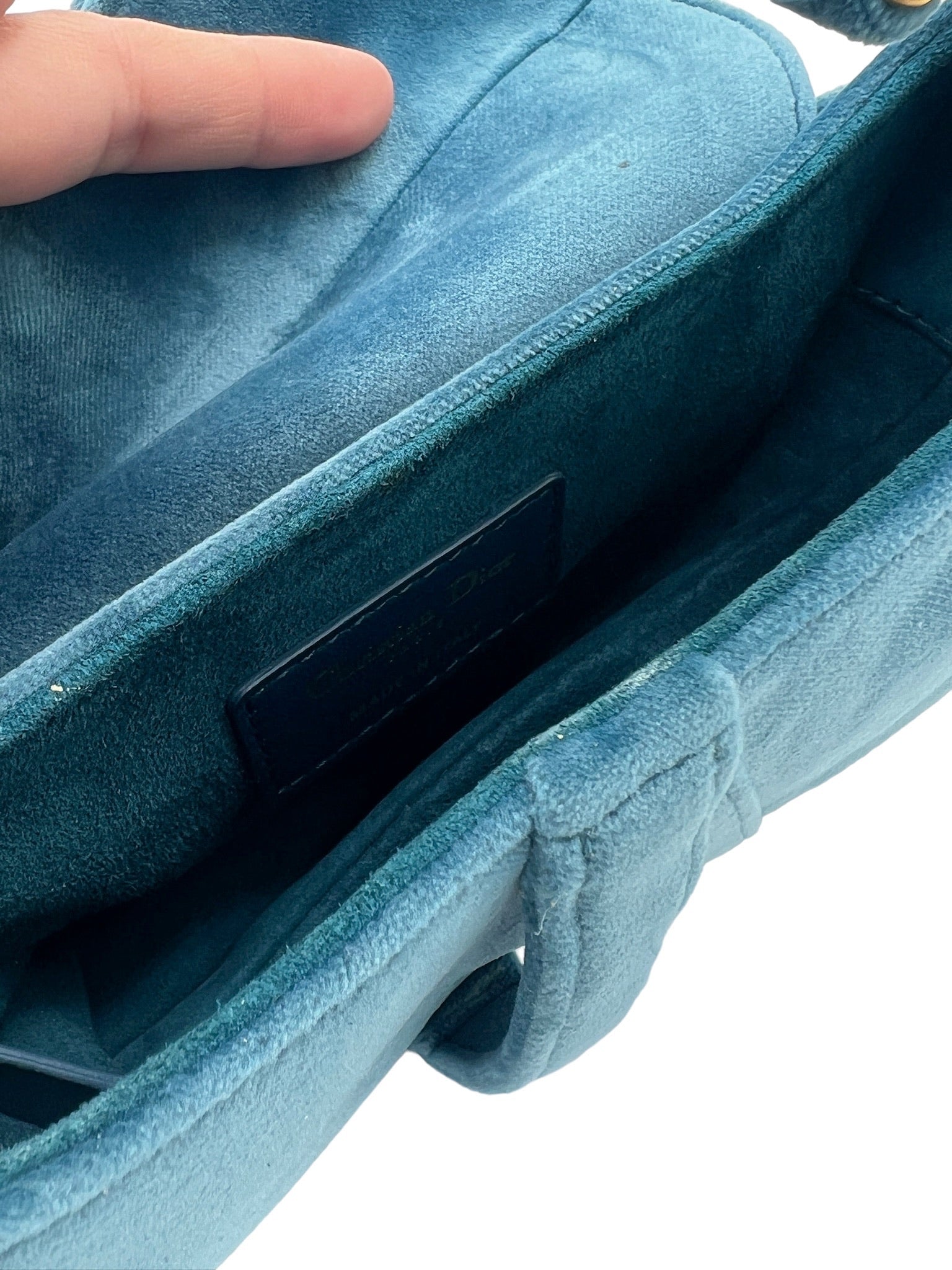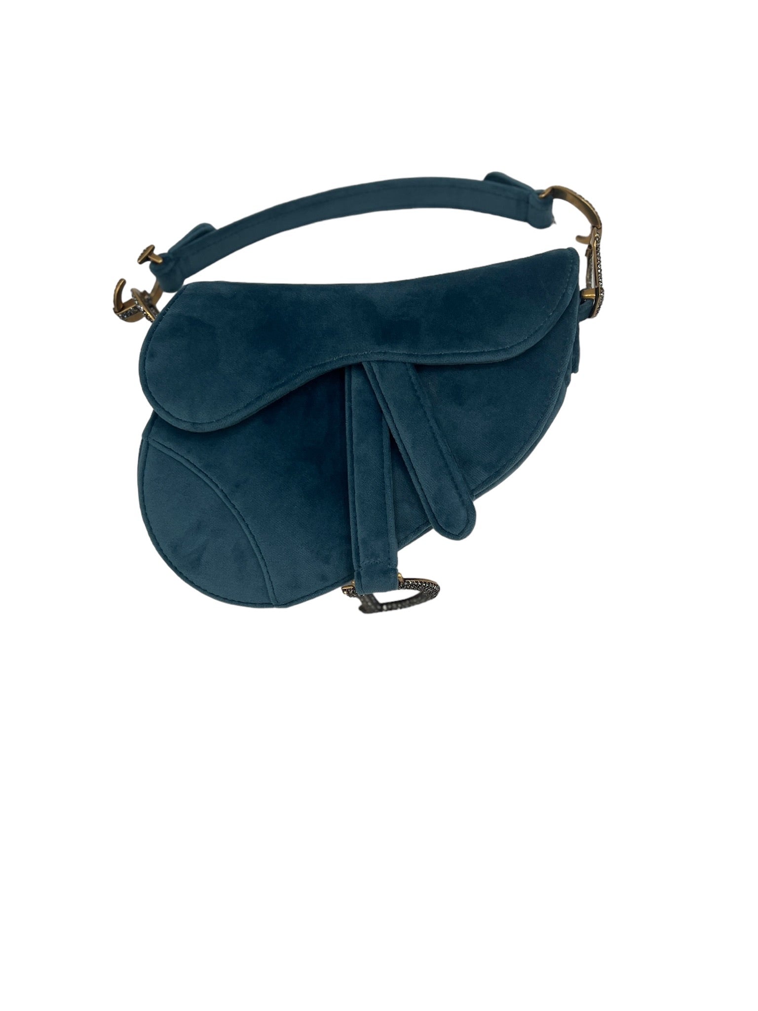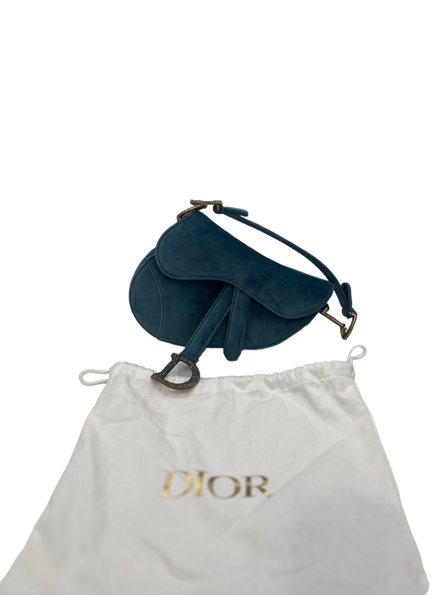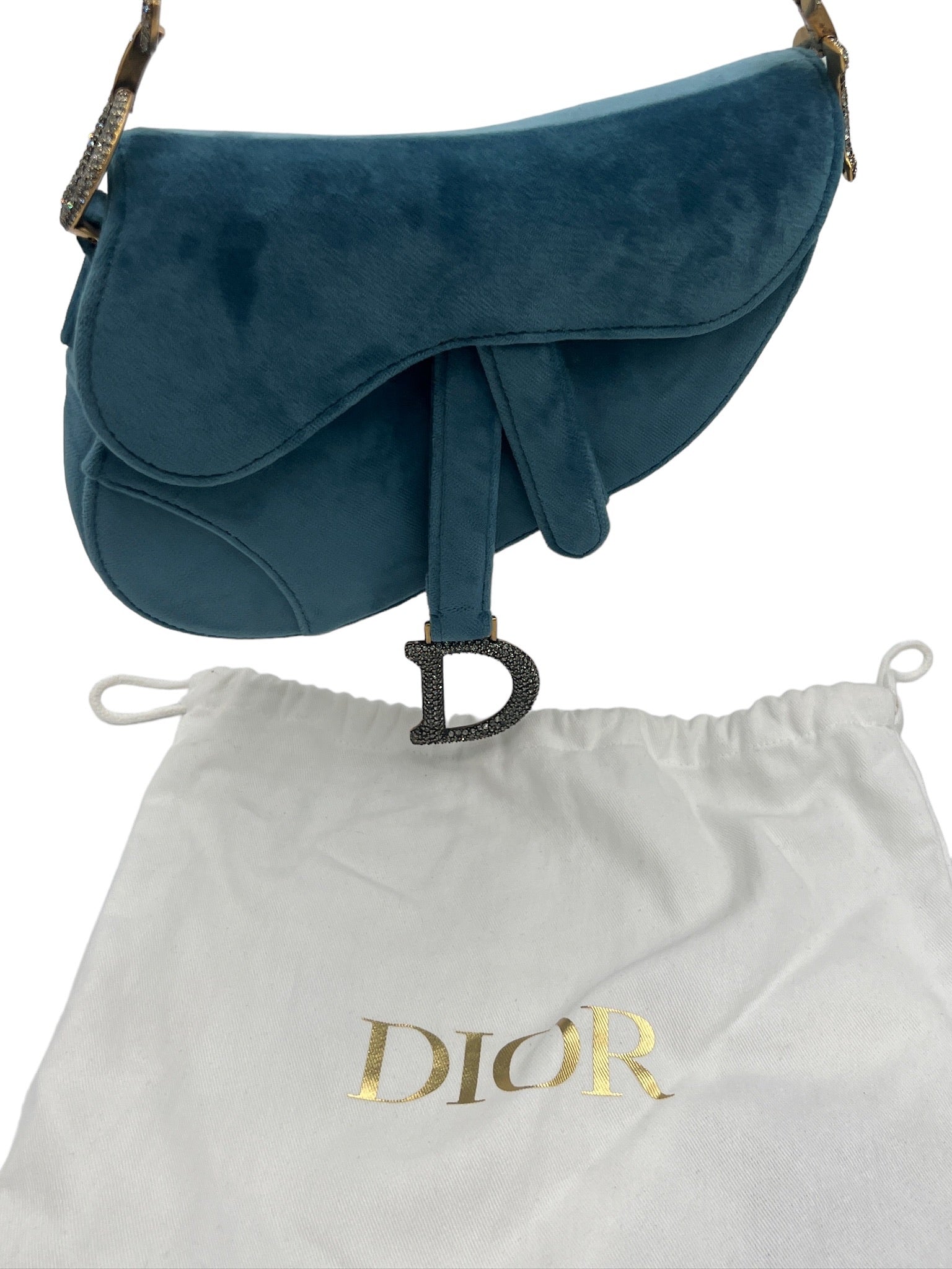 Este bolso de hombro Saddle con cristales de terciopelo azul de Dior usado es una sorprendente incorporación a su colección.