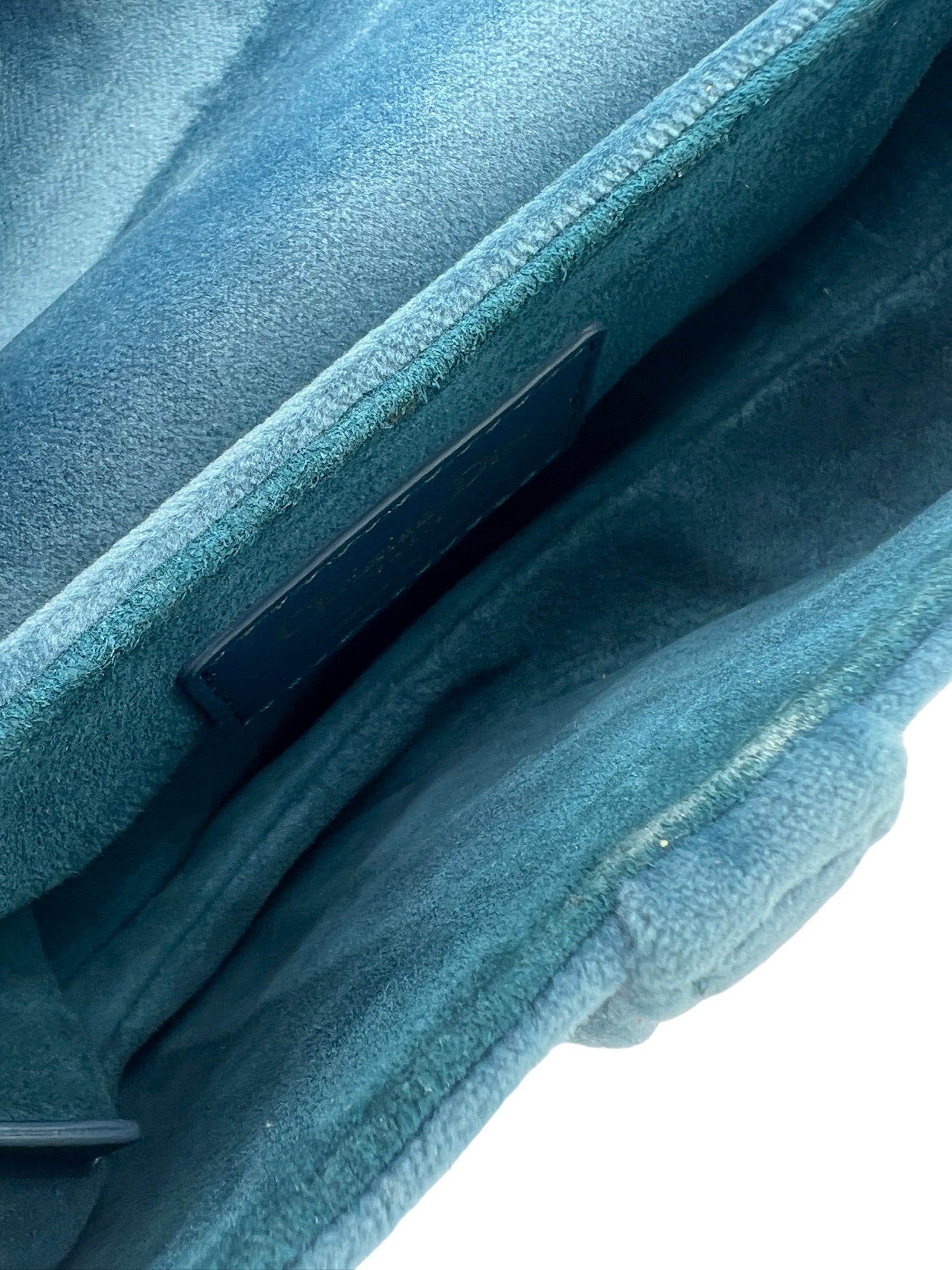 El material de terciopelo azul le da al bolso una textura lujosa a la que es imposible resistirse. Los herrajes en tono plateado complementan el terciopelo azul a la perfección, agregando la cantidad justa de brillo y elegancia.
