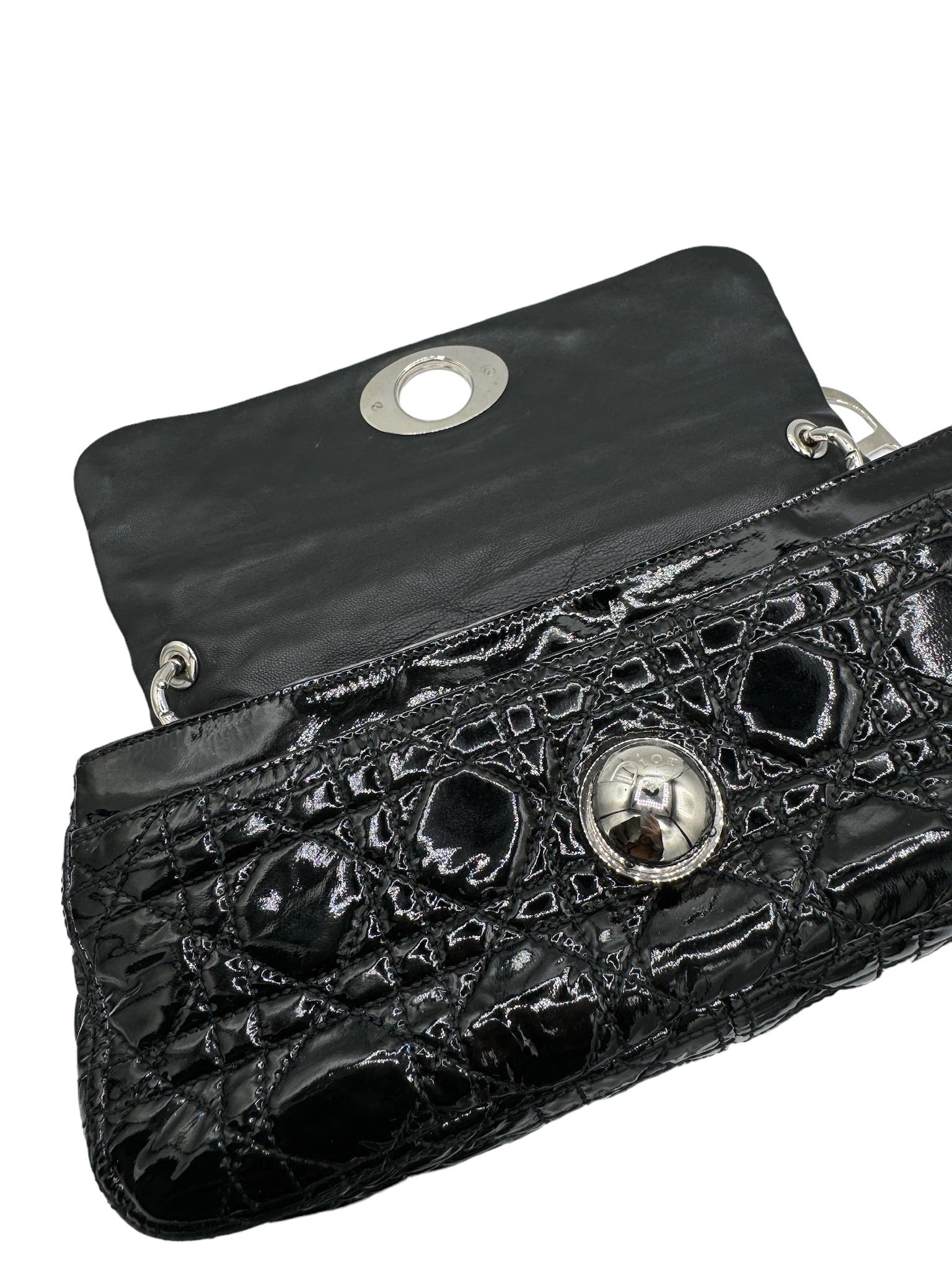 ¡Este bolso de hombro de piel charol negra con puntada Cannage de DIOR te hará destacar entre la multitud con estilo!