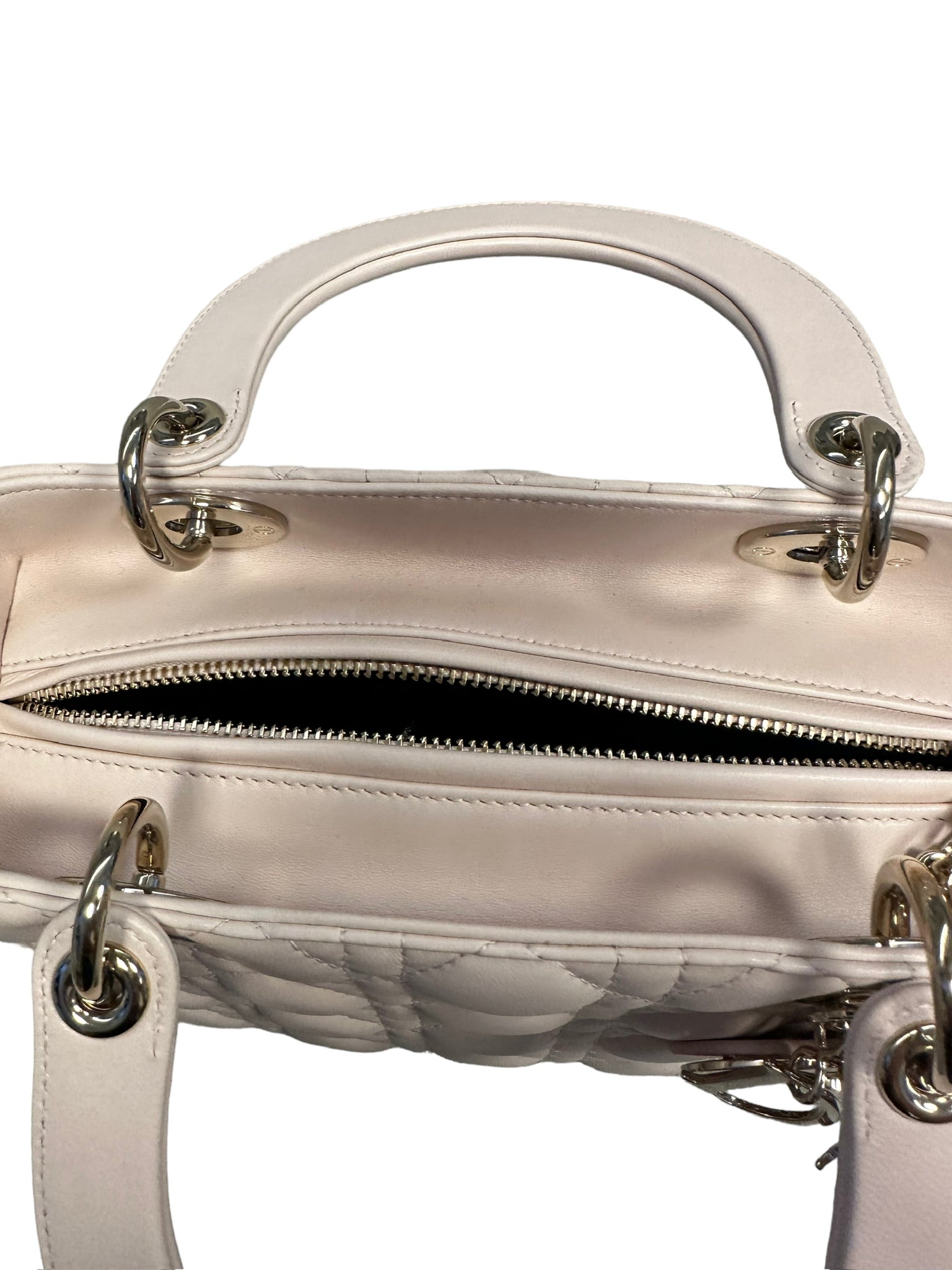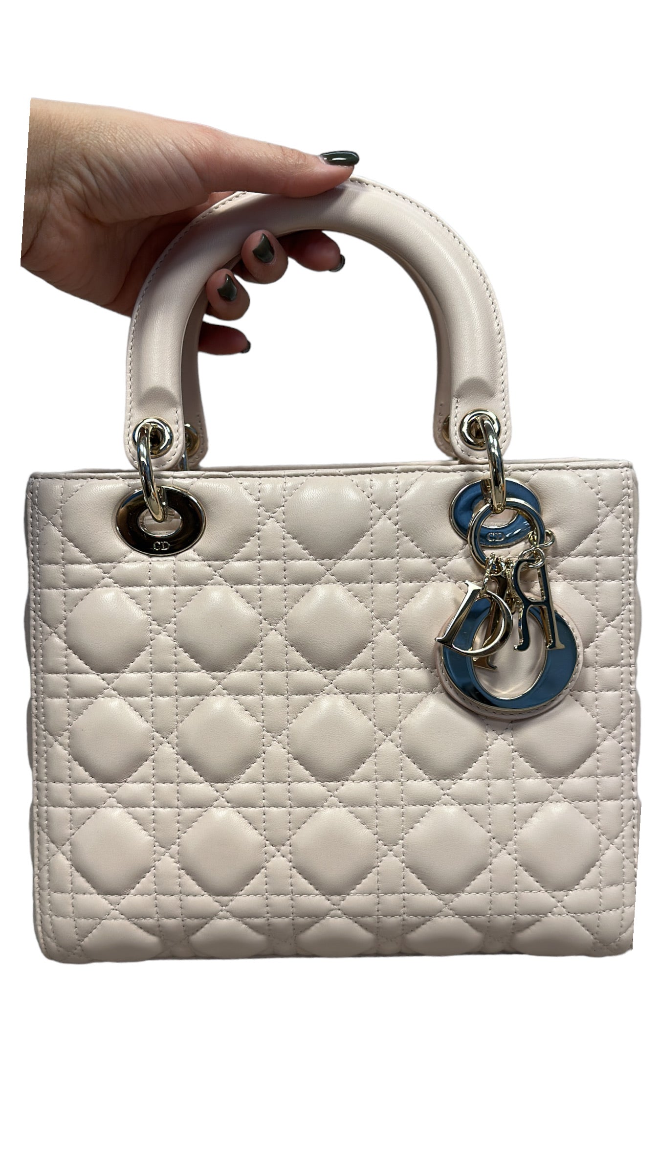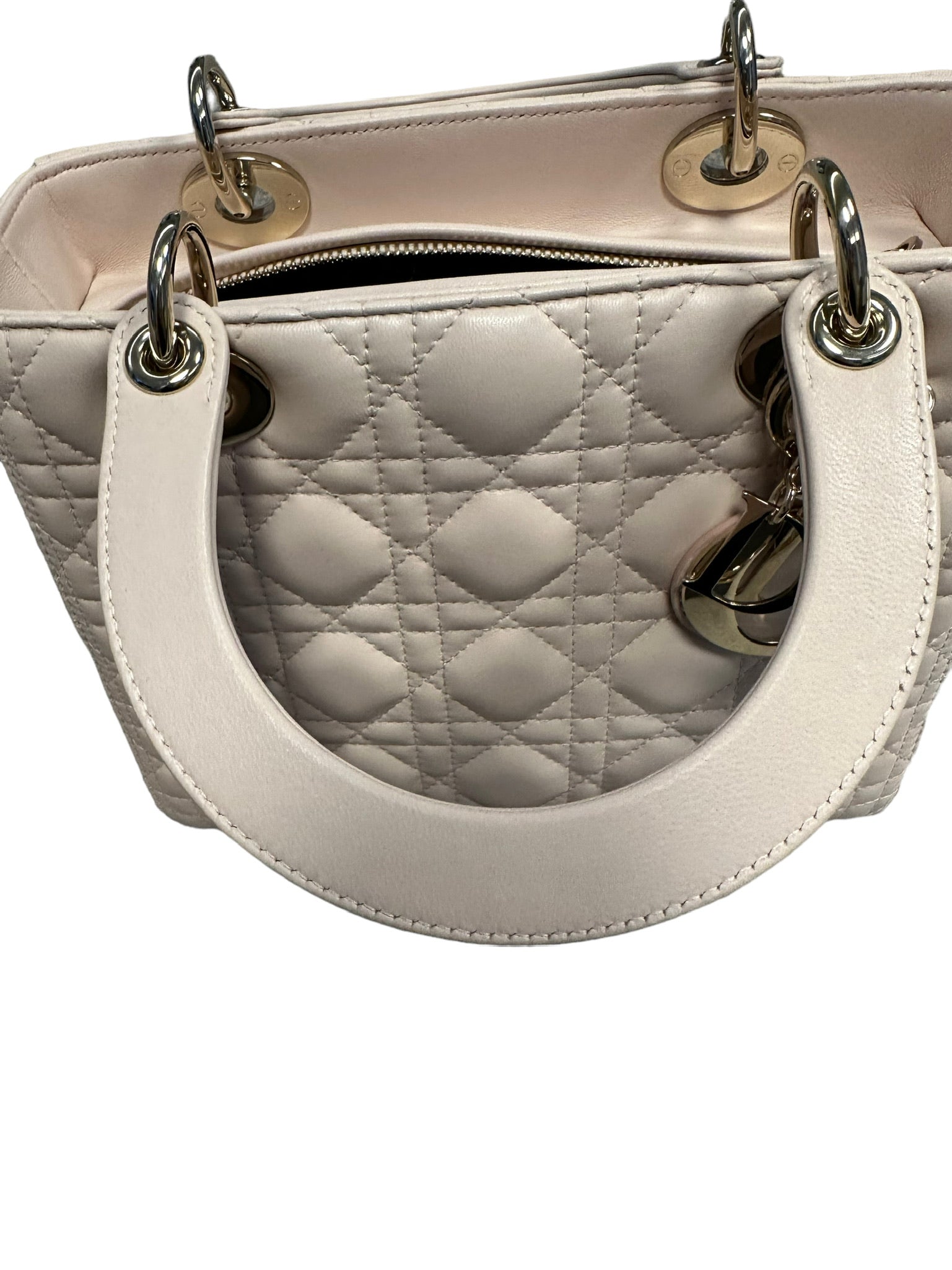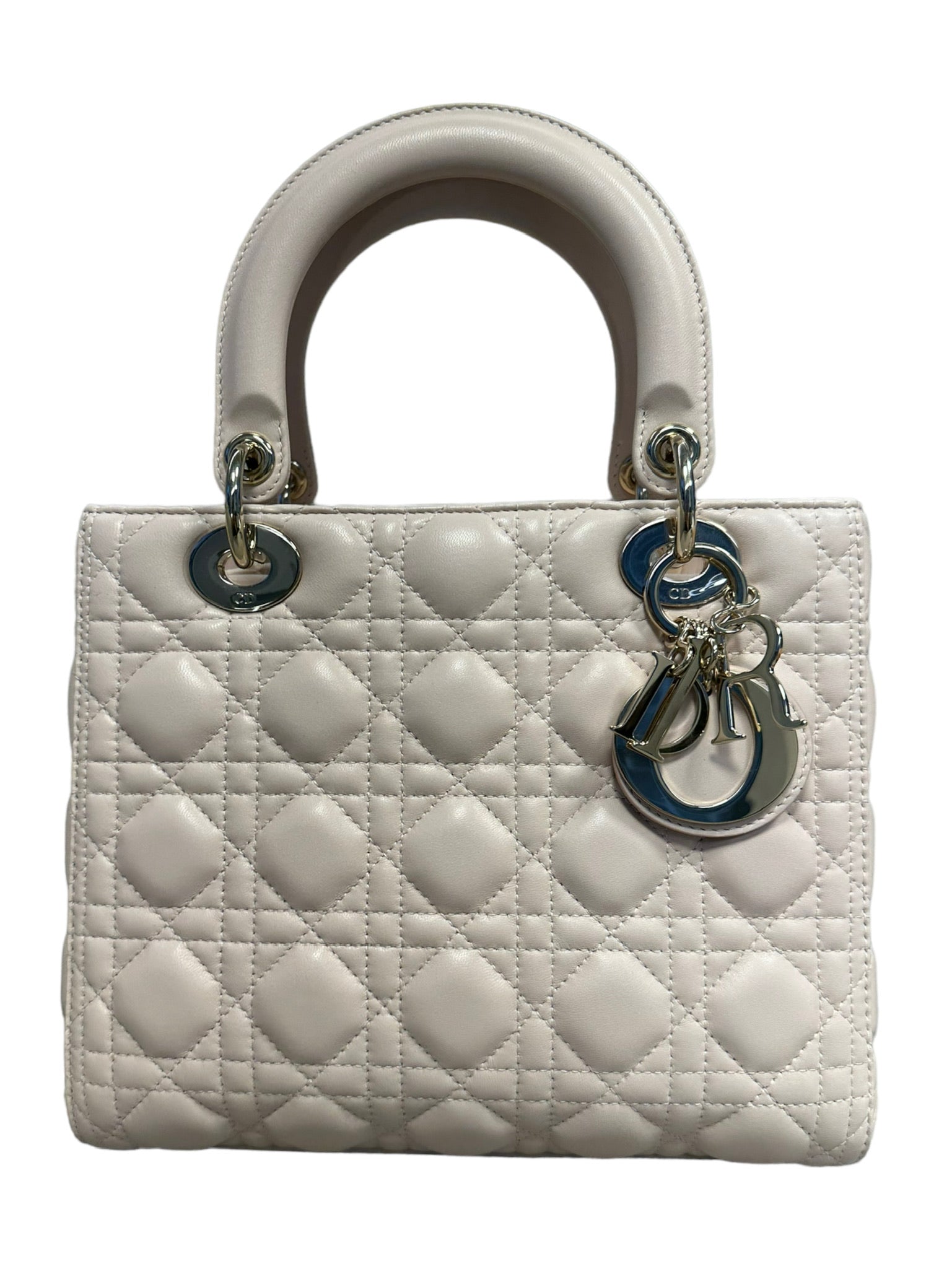 El DIOR Powder Pink Lambskin Cannage Medium Lady Dior, elaborado por expertos con piel de cordero suave, presenta elegantes herrajes plateados y está listo para realzar cualquier atuendo. Experimente el lujo y el estilo con este bolso atemporal.