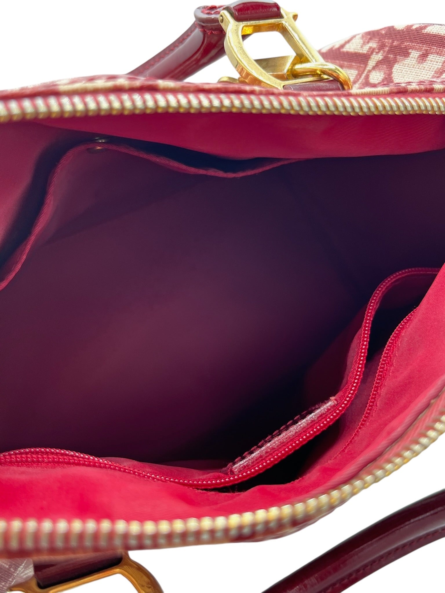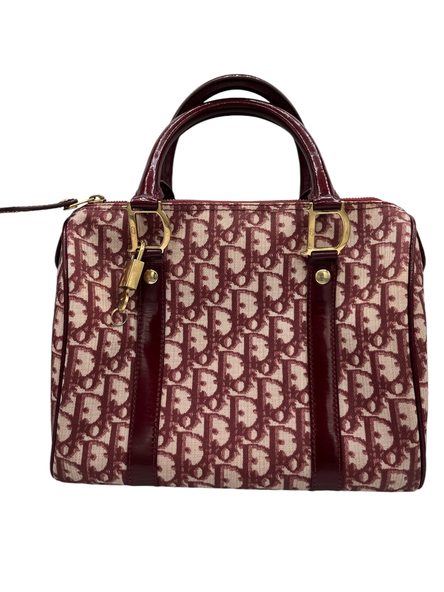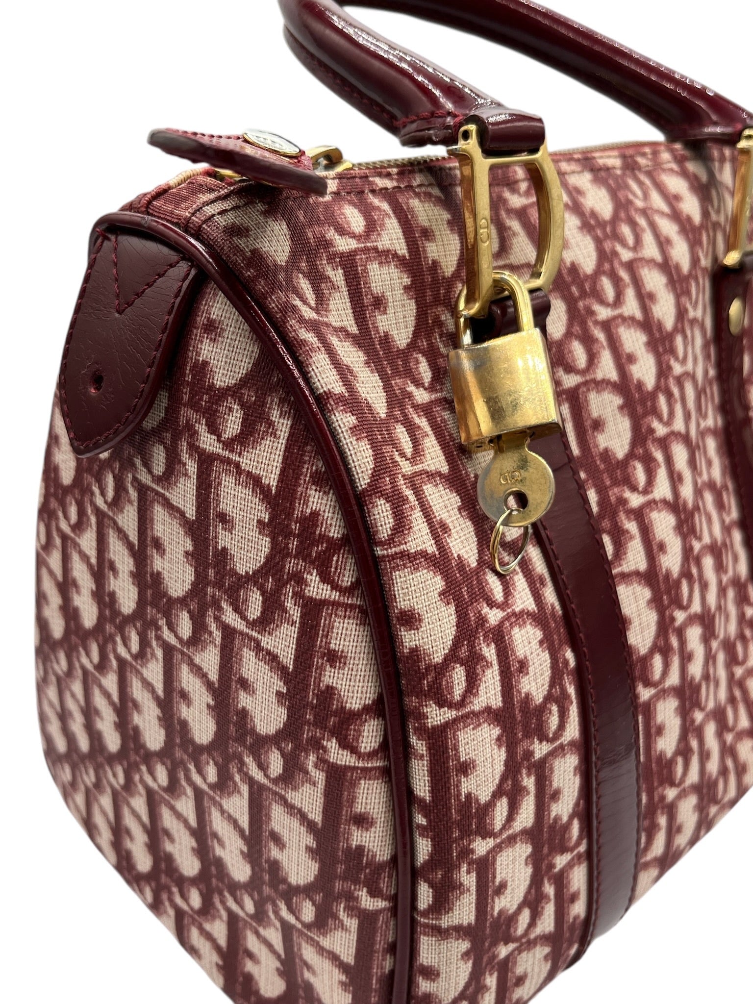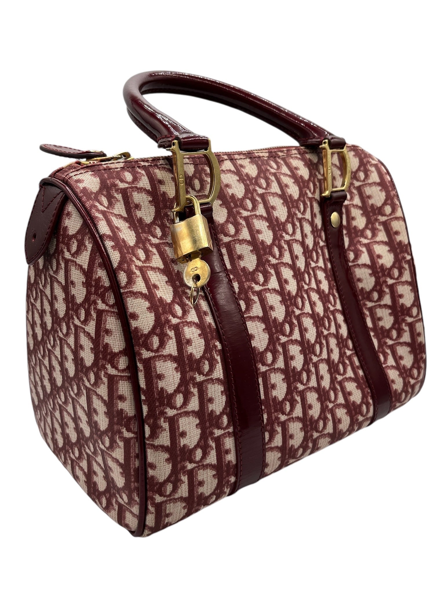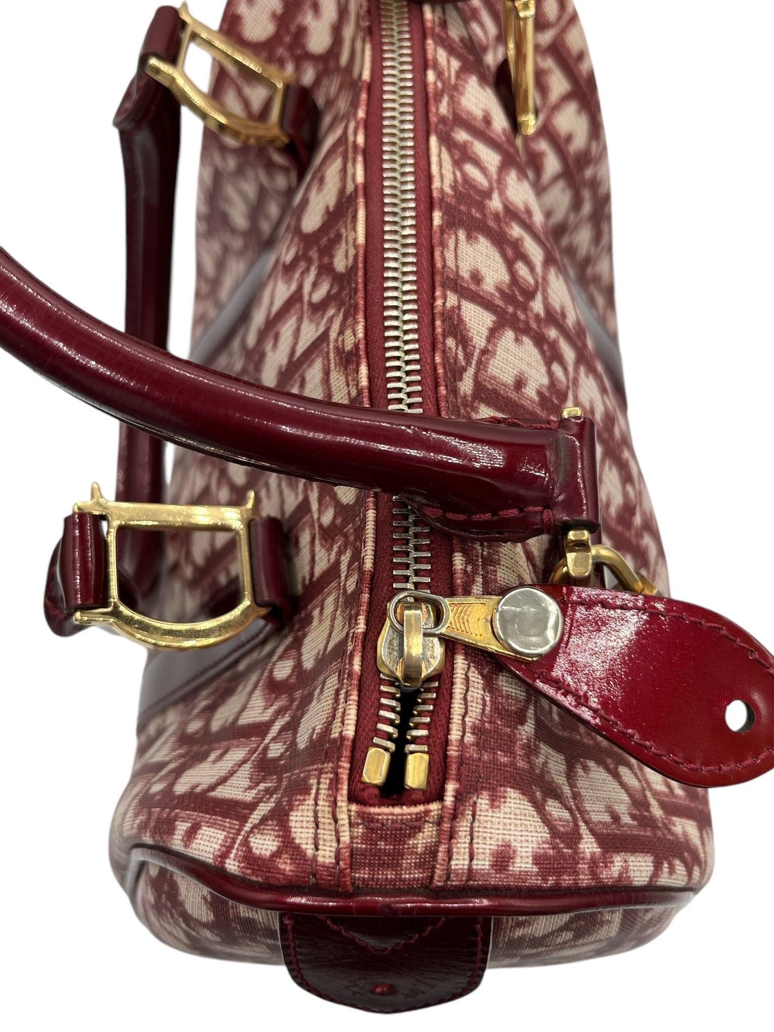 Este bolso Boston DIOR Trotter Bordeaux Jacquard de PVC es una pieza usada que irradia elegancia clásica.