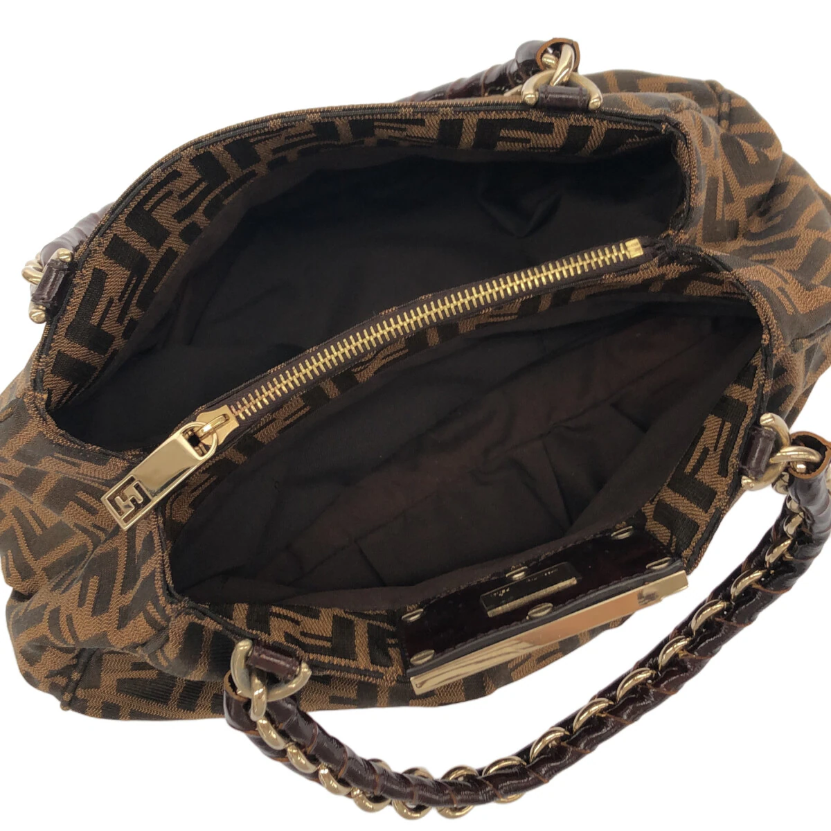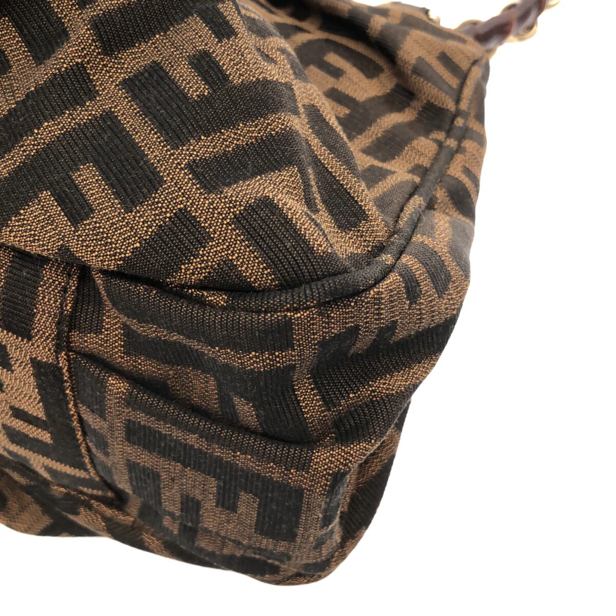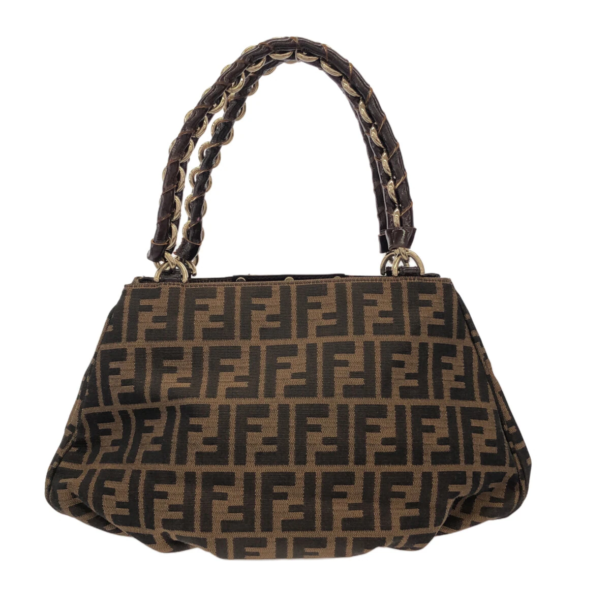 El bolso tote Mia Zucca de FENDI es el accesorio perfecto para cualquier fashionista que quiera marcar tendencia. Este elegante bolso, confeccionado con lujoso charol jacquard, presenta pequeños arañazos y ligeras marcas de suciedad que le aportan carácter y singularidad. Sin embargo, no te dejes engañar por su aspecto elegante, ya que también ofrece durabilidad con su revestimiento metálico descascarillado y ligeros roces en la parte inferior y las asas.