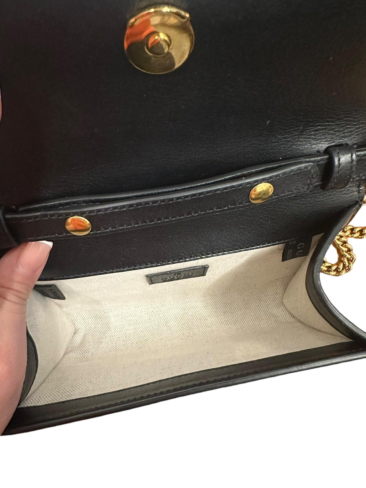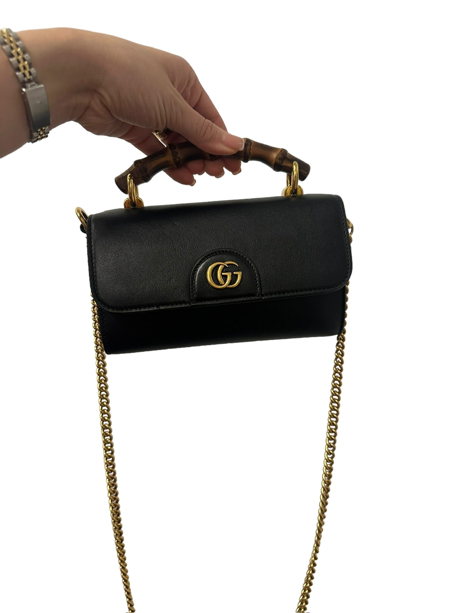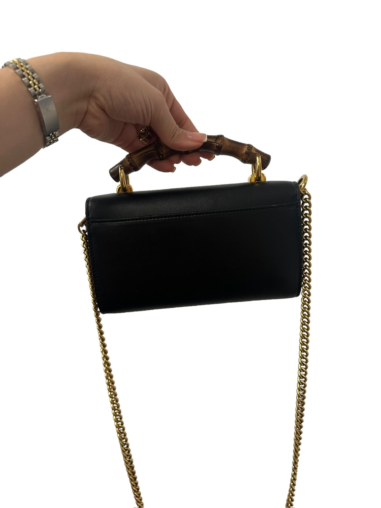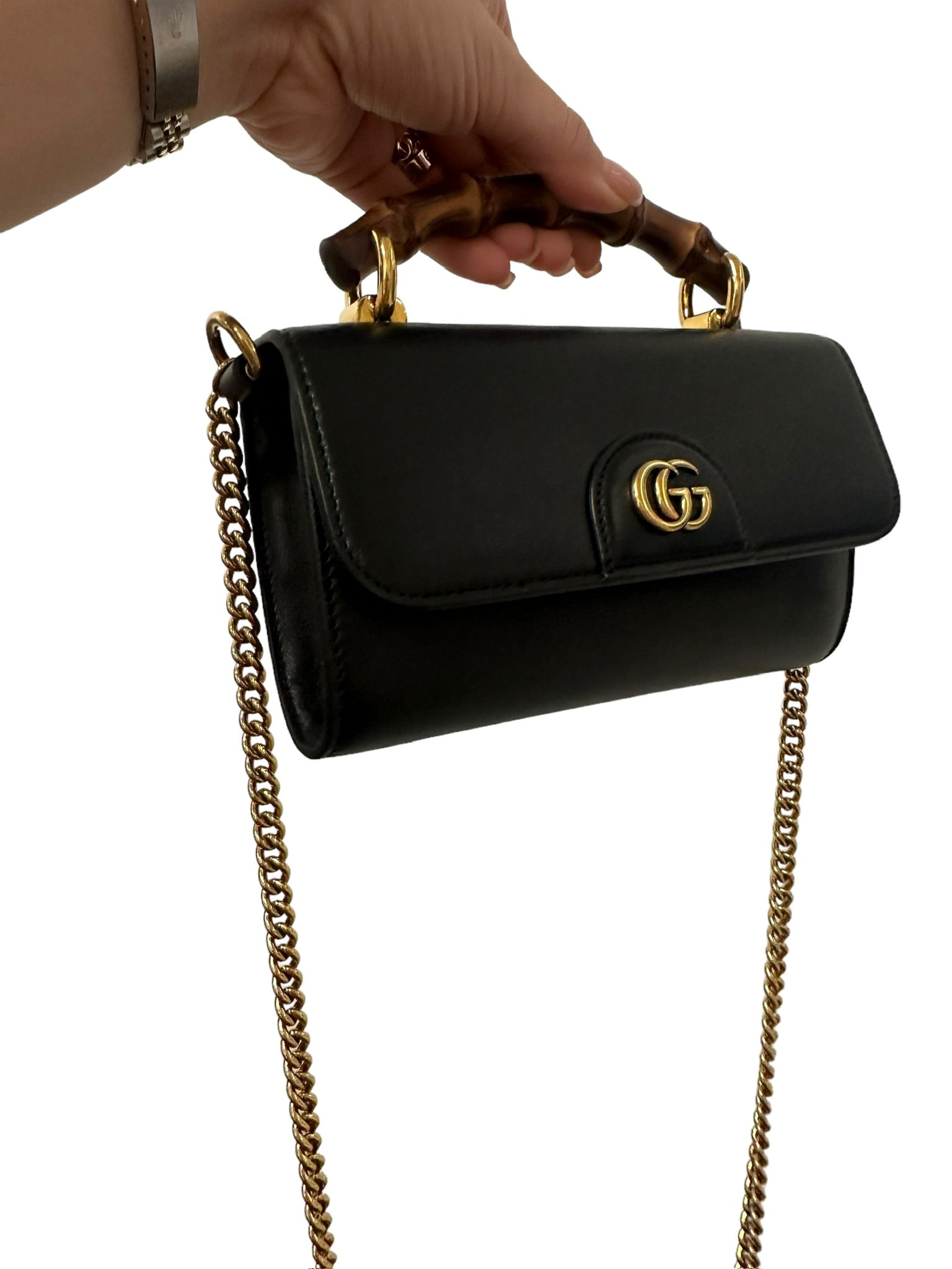 El clutch Diana Mini Bamboo de piel de becerro negra de GUCCI, elaborado por expertos con herrajes en oro envejecido, es un accesorio versátil. Las correas extraíbles permiten una transición perfecta del día a la noche, mientras que la cinta de regalo incluida y el folleto de cuidados añaden un toque lujoso. Realza cualquier atuendo con este clutch icónico.