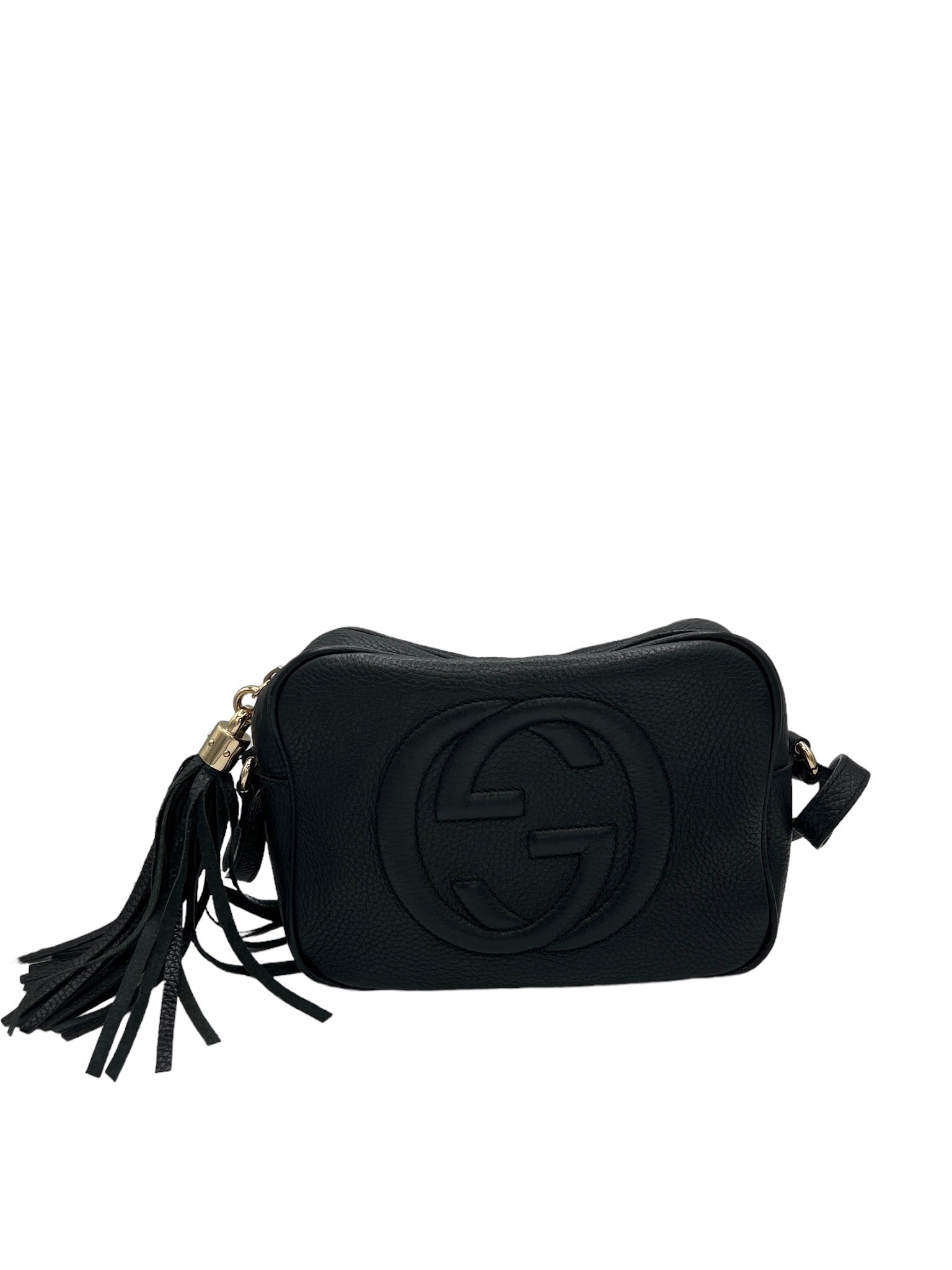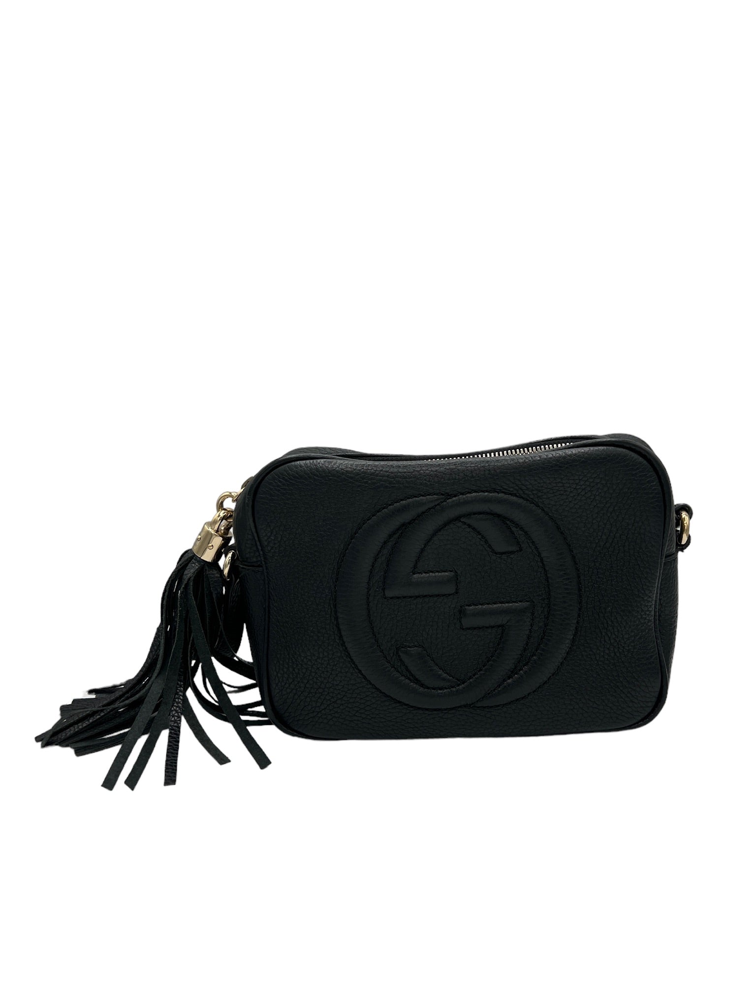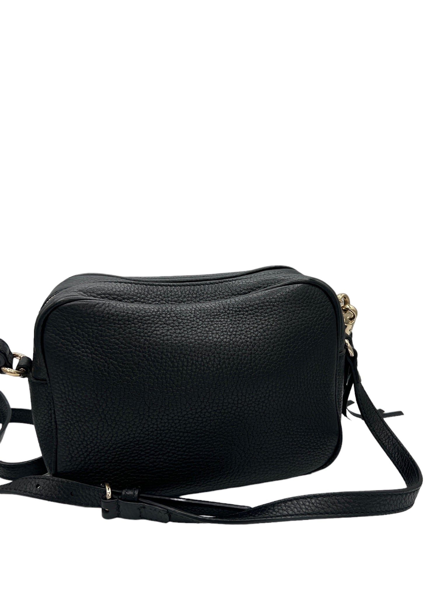 Este bolso bandolera GUCCI Soho usado en piel negra es un accesorio elegante y práctico para el uso diario.