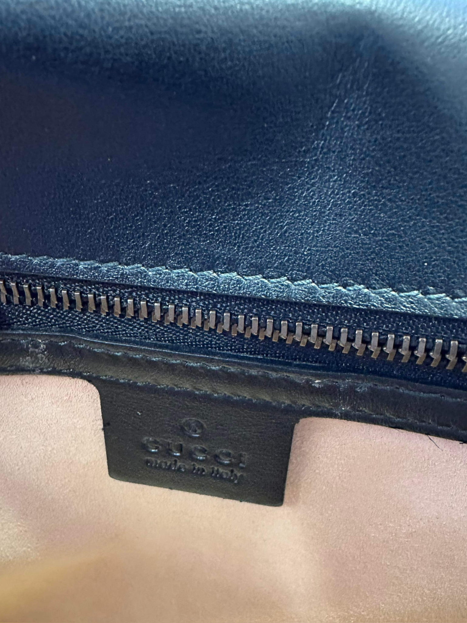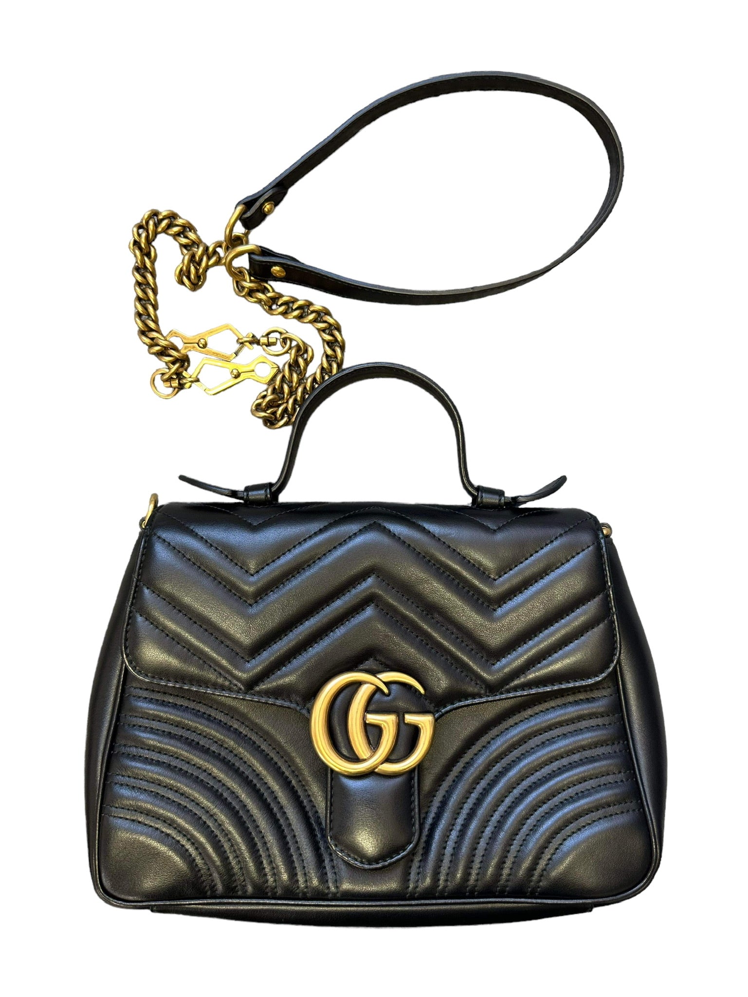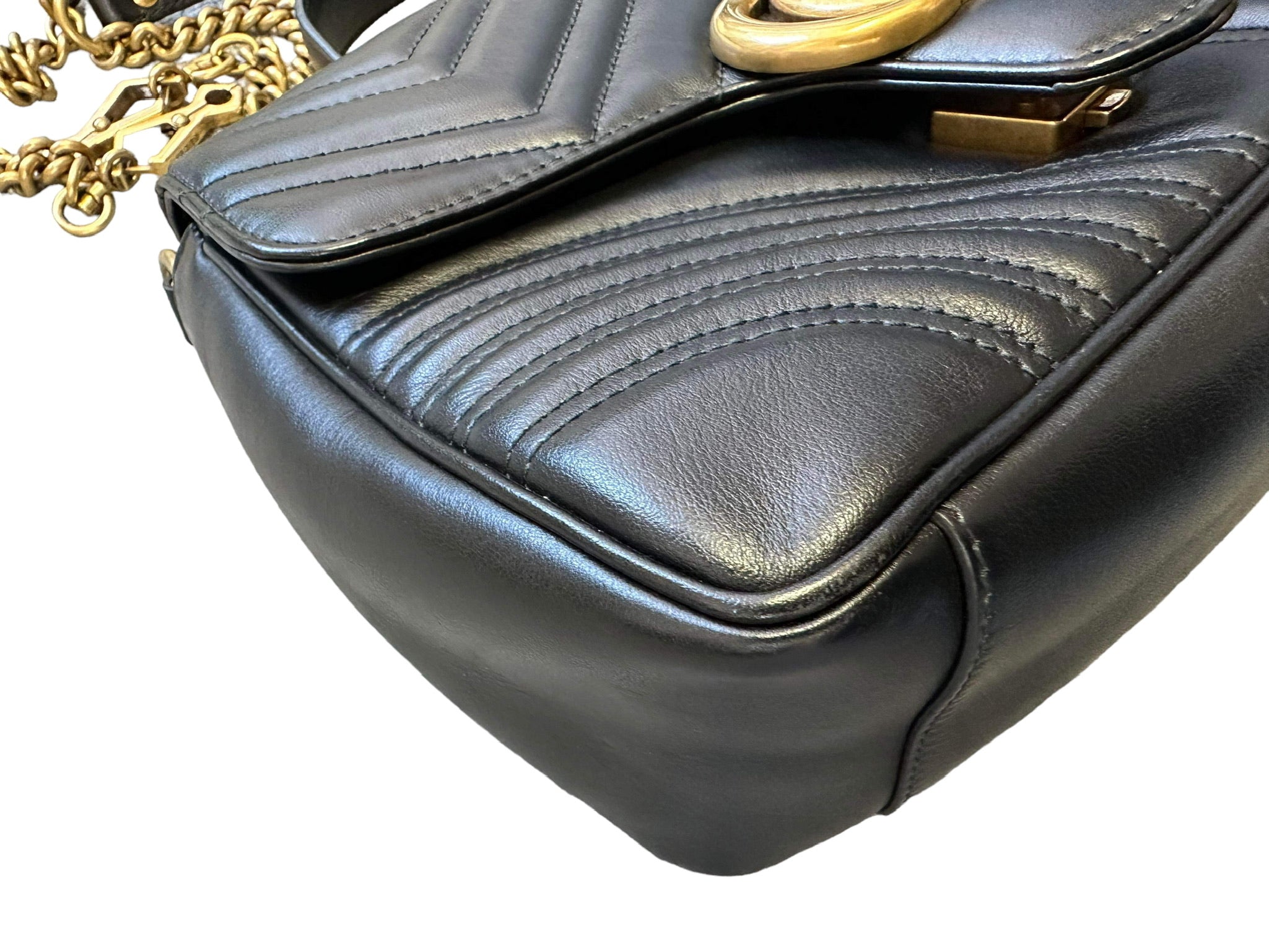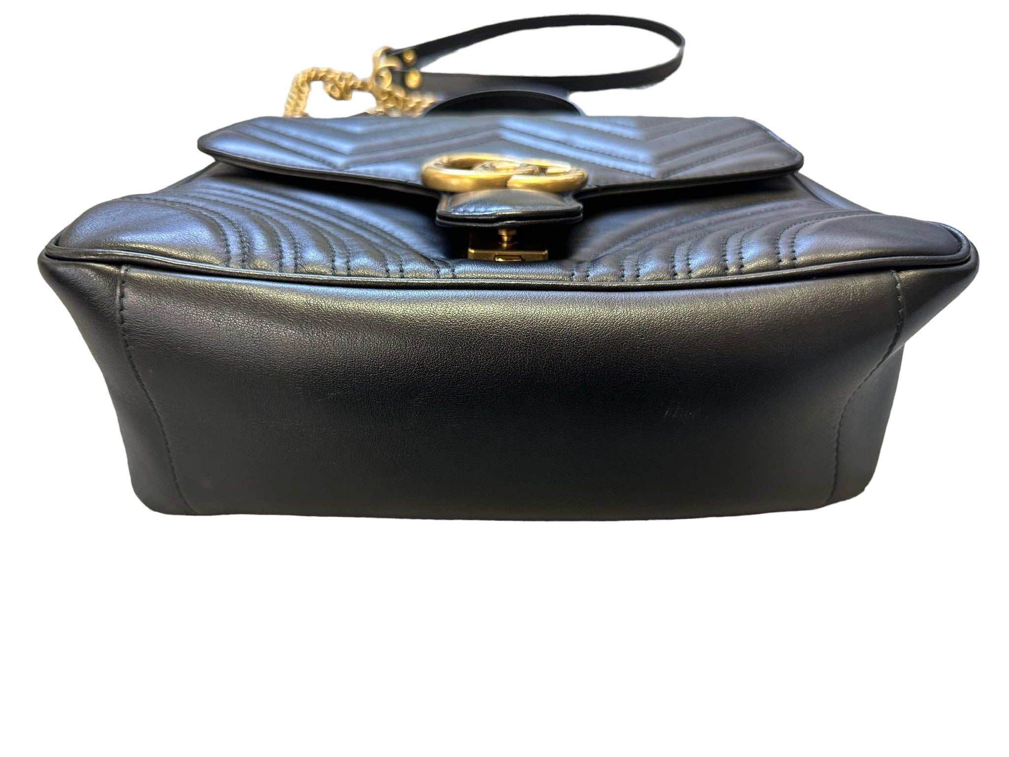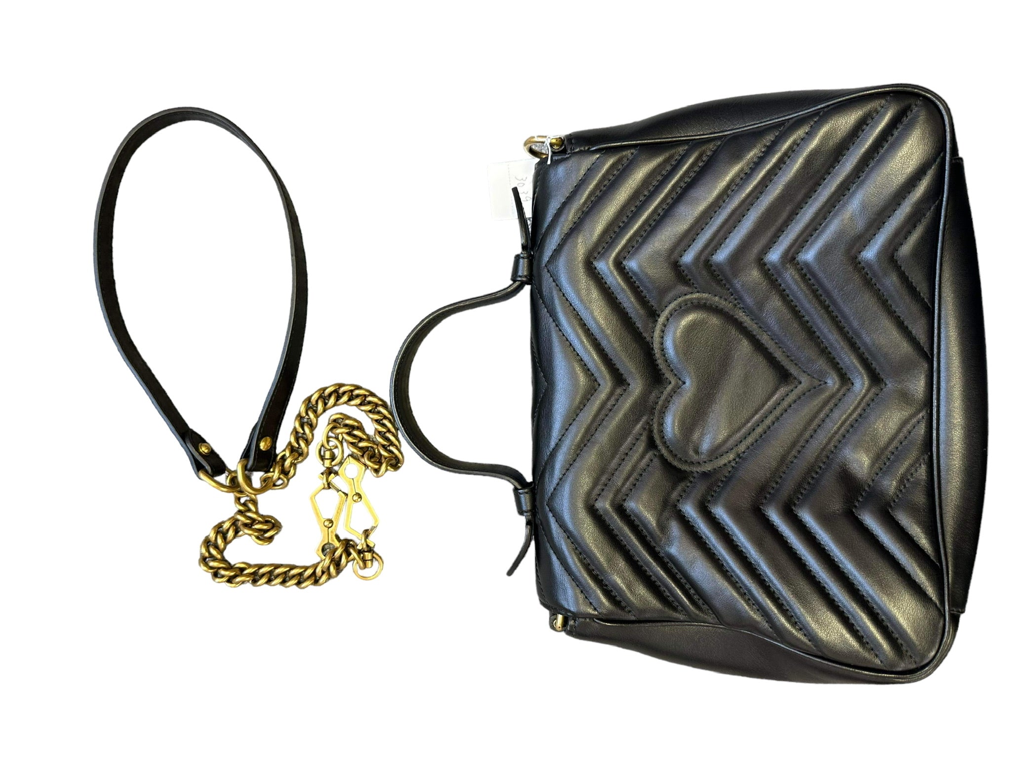 Este bolso de hombro con asa superior GG Marmont de GUCCI, confeccionado en piel matelassé negra con estampado de chevrones, está rematado con herrajes en tono dorado antiguo y realzado con un corazón del mismo tono. El diseño incluye una correa de cadena desmontable con una longitud de 50 cm, un cierre de solapa con resorte y varios bolsillos interiores abiertos y con cremallera para guardar cosas.