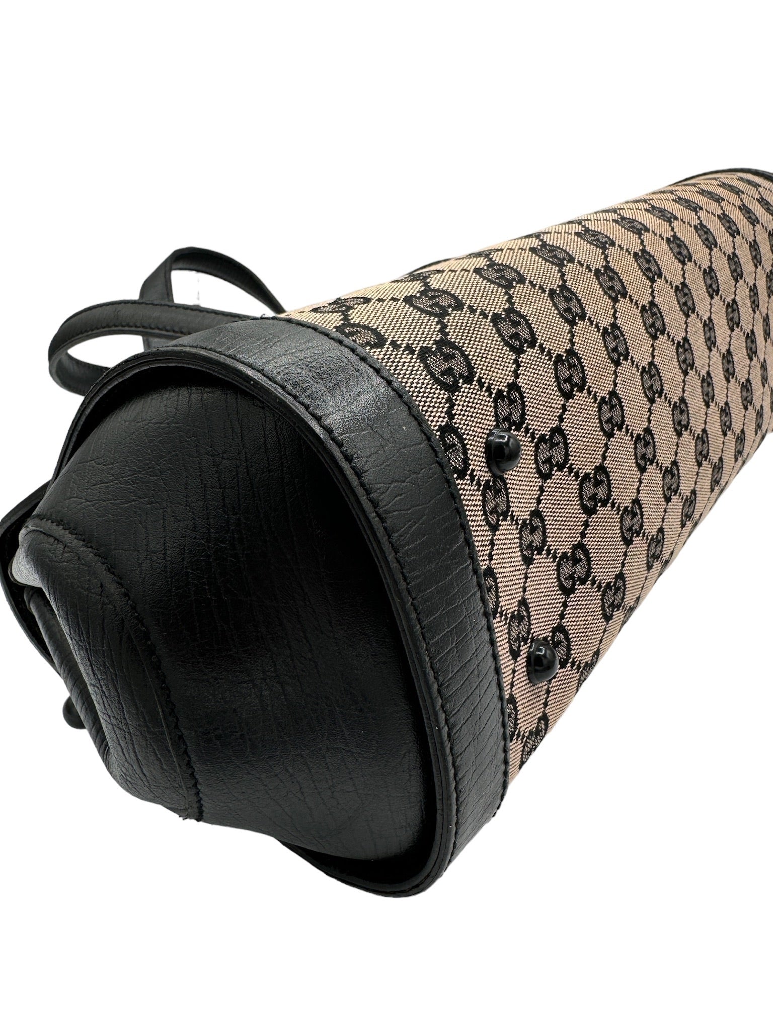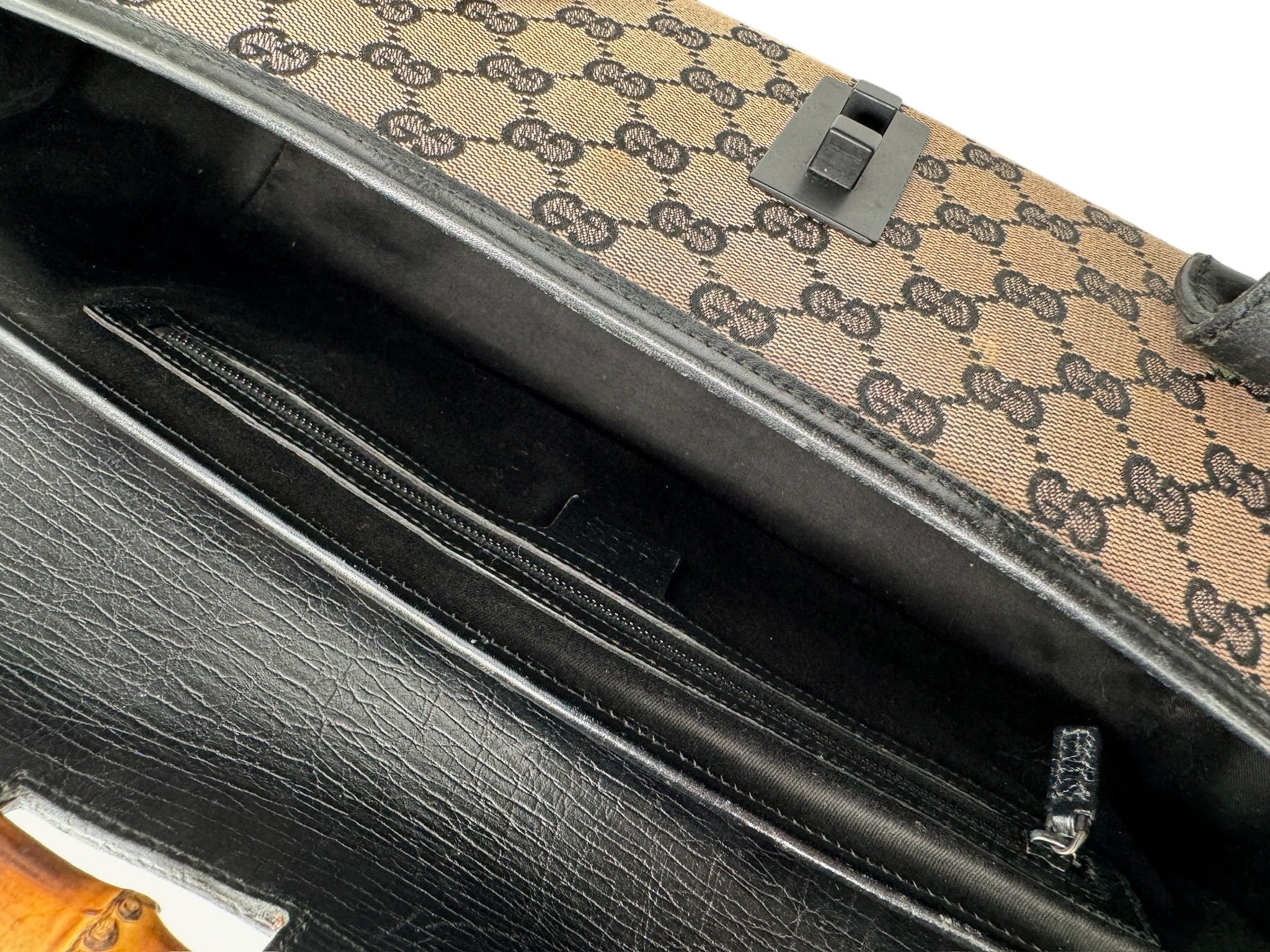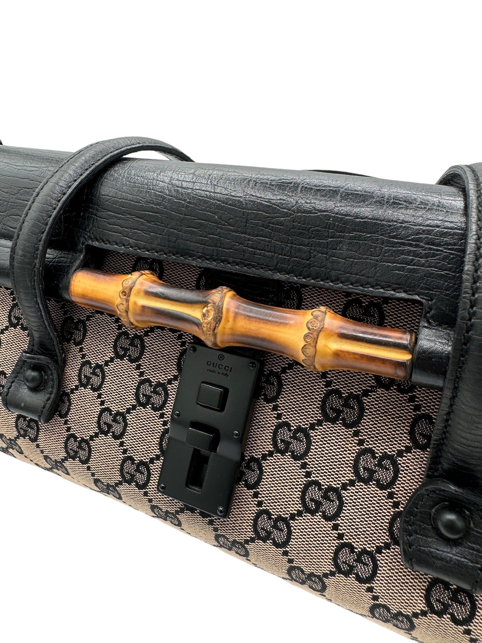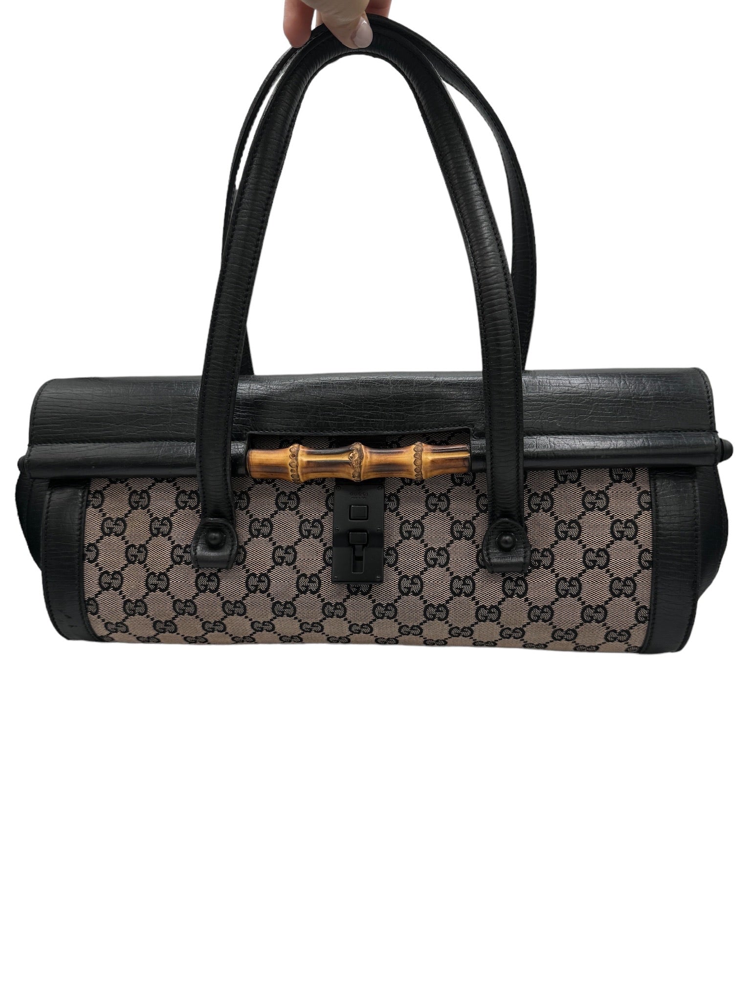 GUCCI - Bolso de mano de piel jacquard beige y negra GG/Bamboo