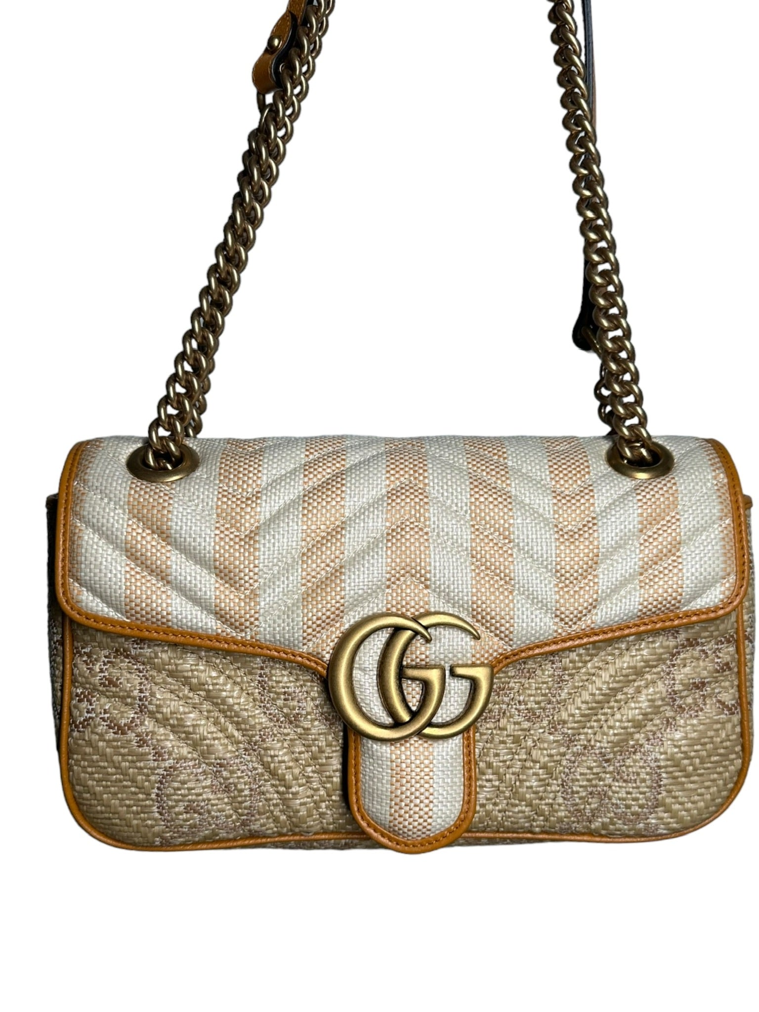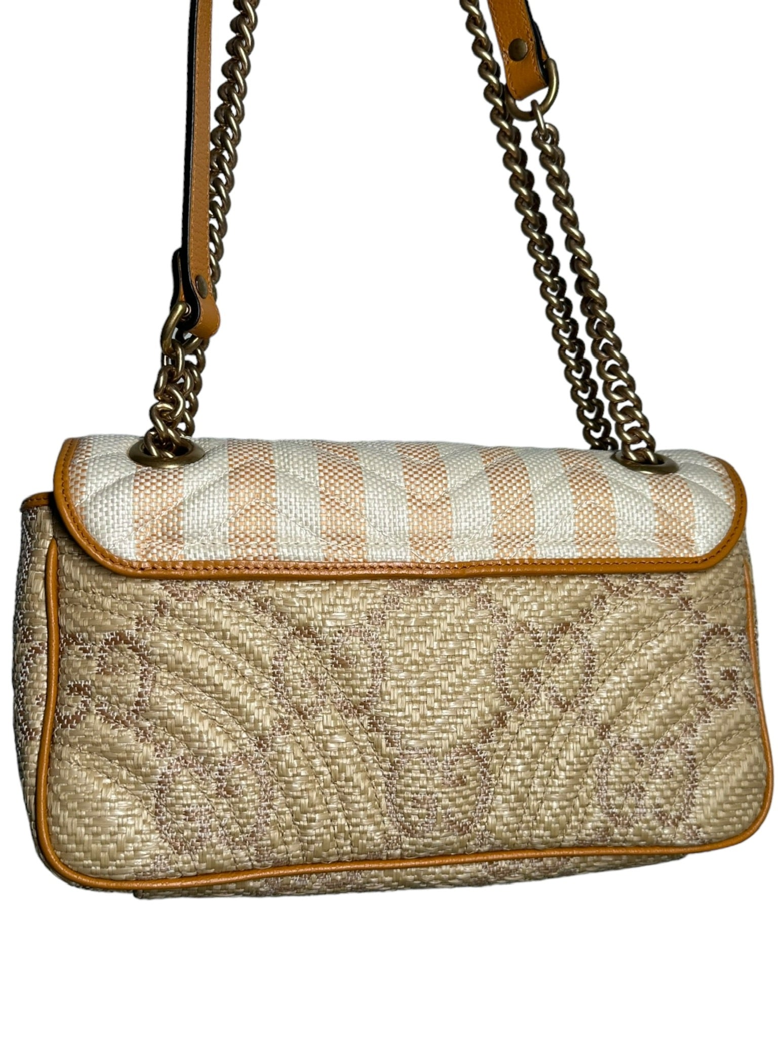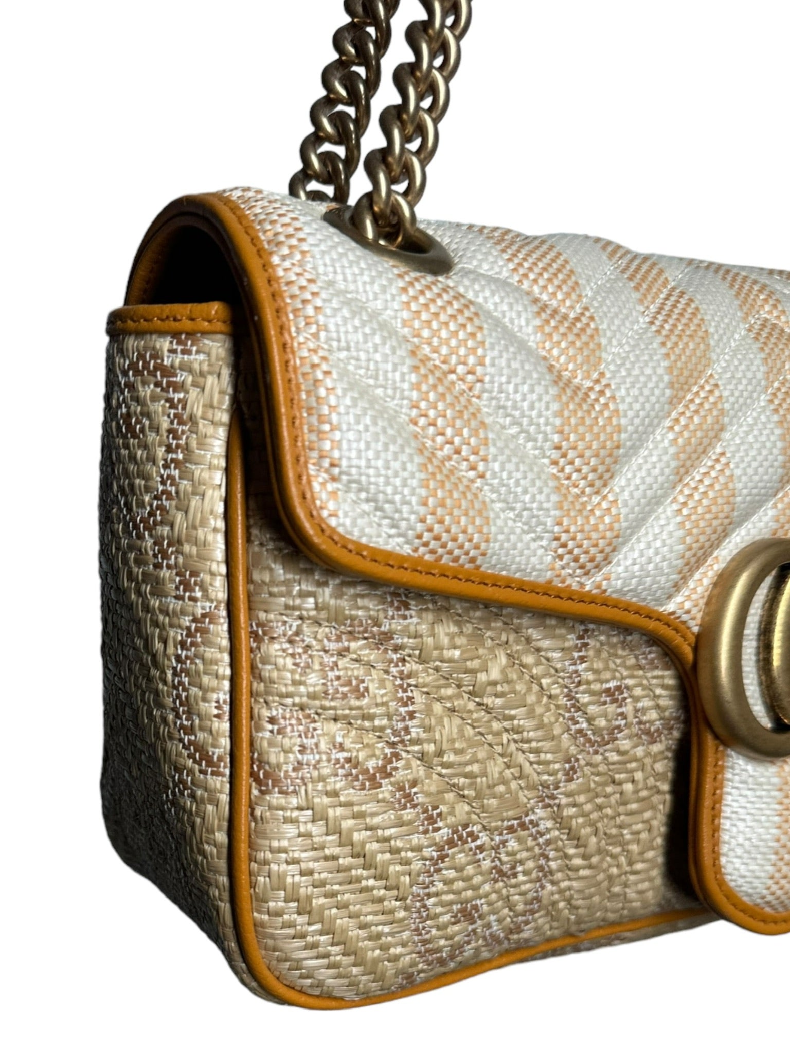 Este bolso de hombro GUCCI GG Marmont de rafia presenta detalles en oro envejecido para lograr un estilo sofisticado. La combinación de rafia y detalles metálicos le agrega un toque de elegancia a este bolso clásico. Realza cualquier atuendo con esta pieza atemporal que rezuma lujo y estilo.