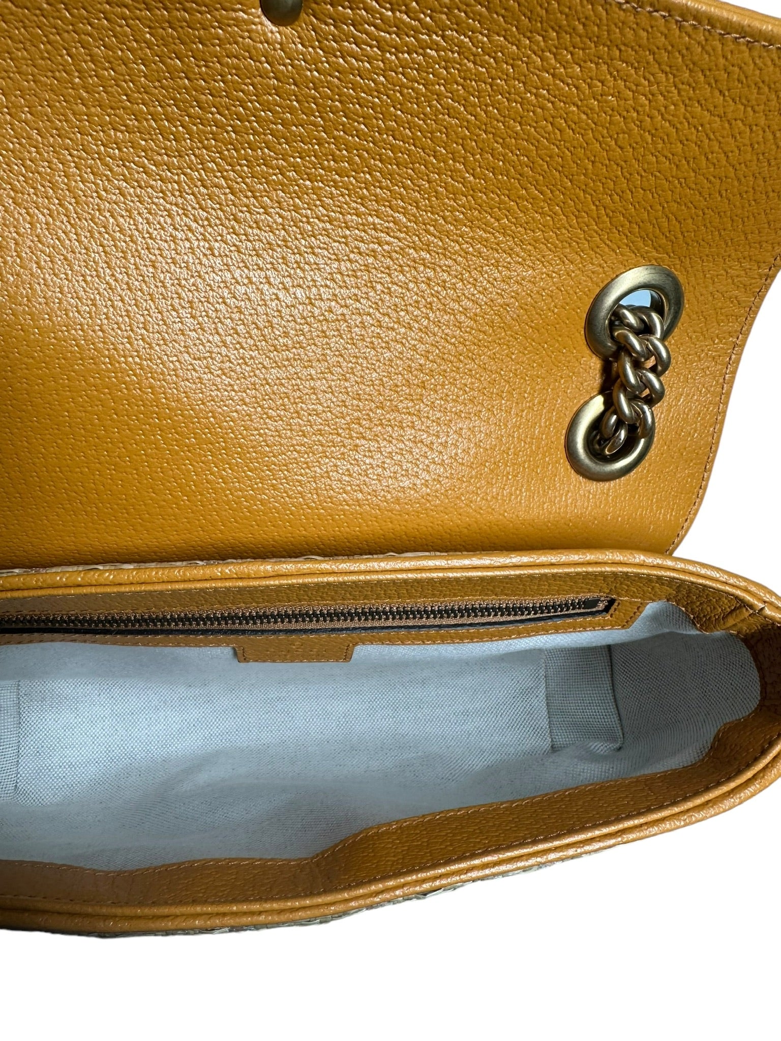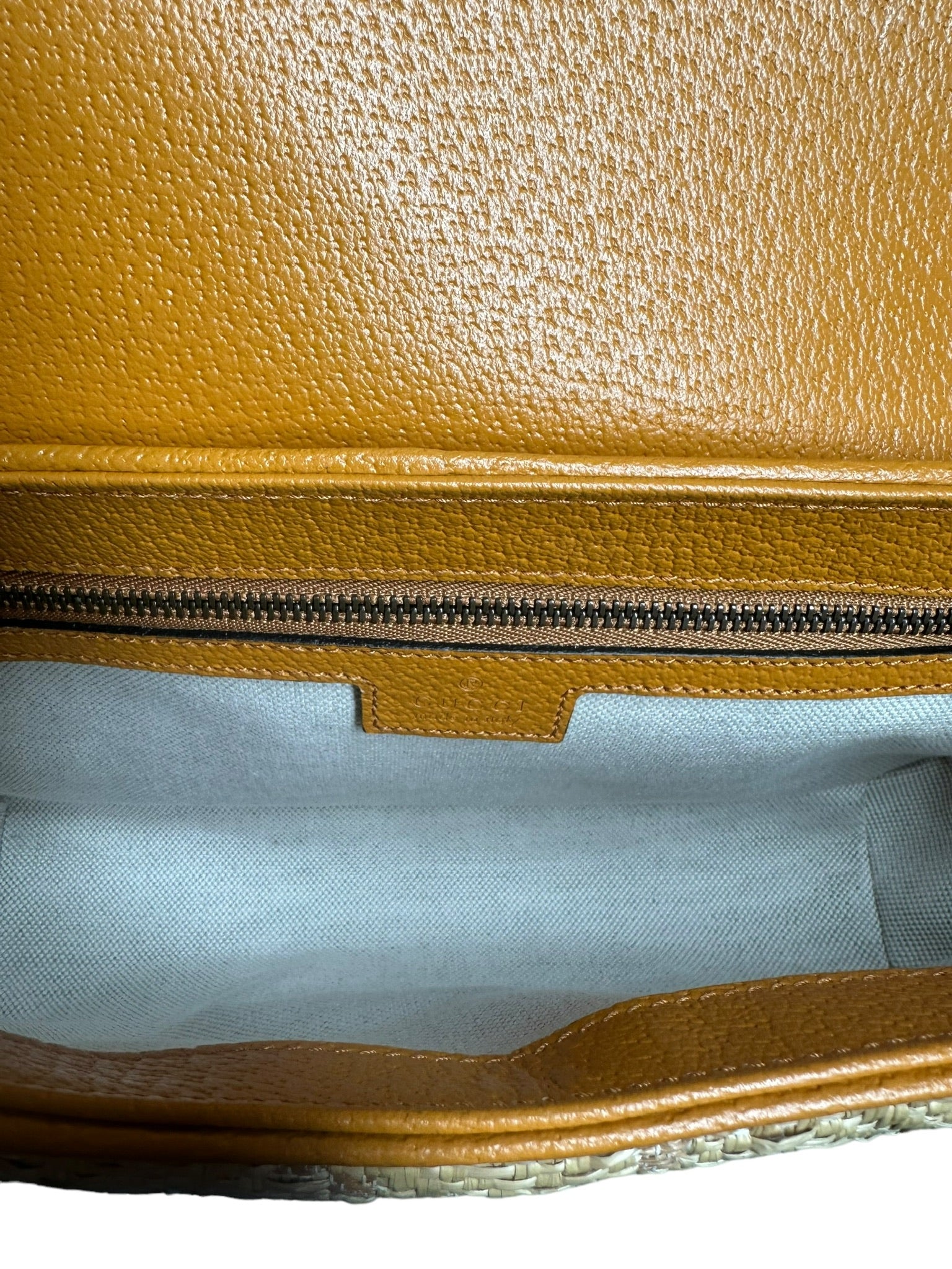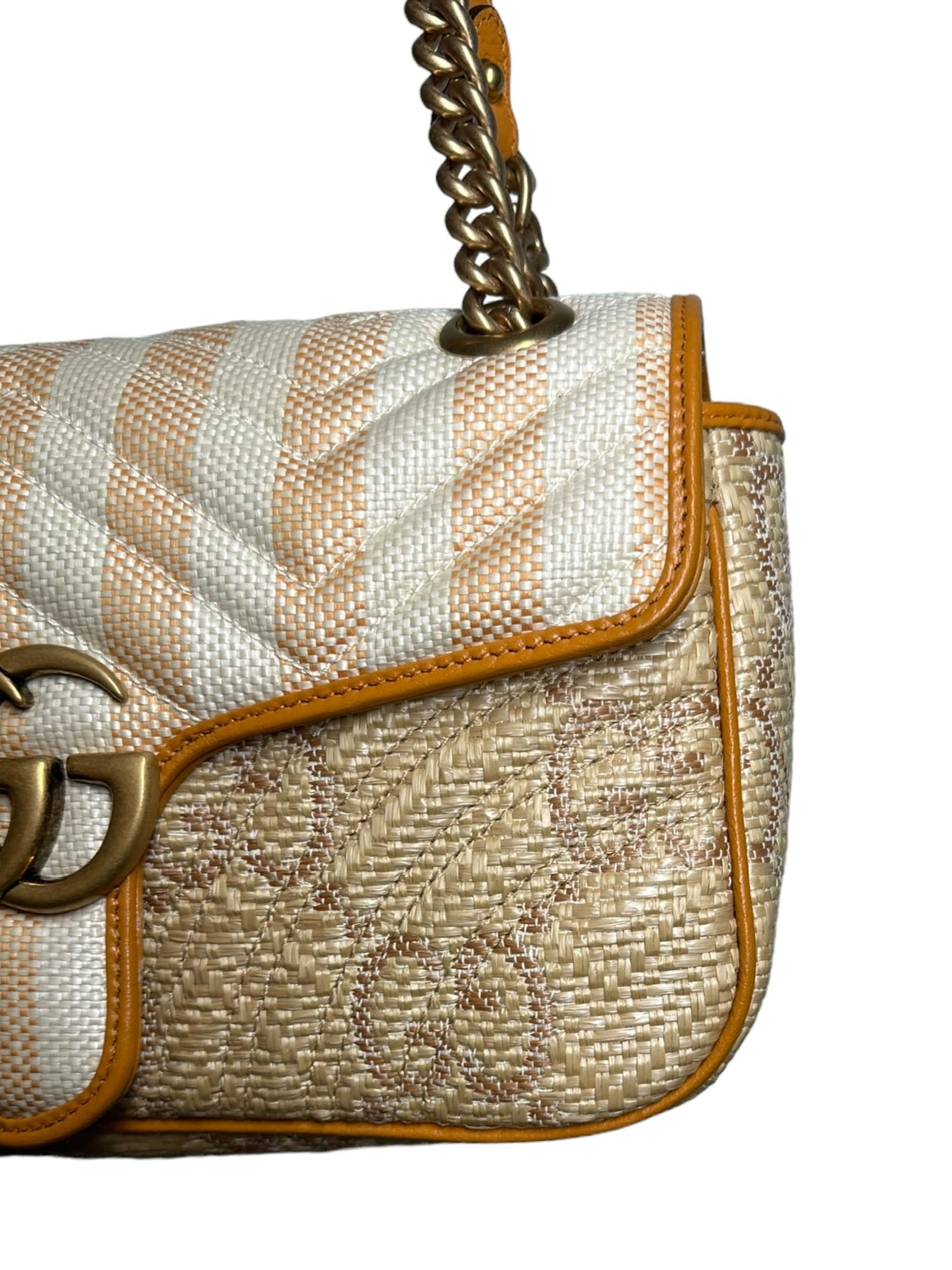 Este bolso de hombro GUCCI GG Marmont de rafia presenta detalles en oro envejecido para lograr un estilo sofisticado. La combinación de rafia y detalles metálicos le agrega un toque de elegancia a este bolso clásico. Realza cualquier atuendo con esta pieza atemporal que rezuma lujo y estilo.