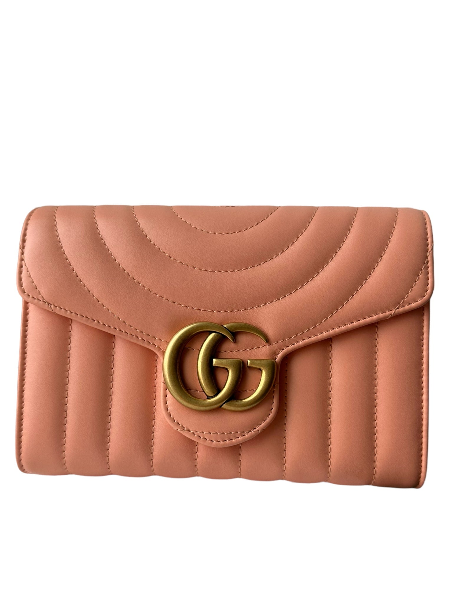 Si estás buscando un bolso bandolera elegante que pueda contener todos tus elementos esenciales y que al mismo tiempo sea elegante y chic, ¡definitivamente vale la pena considerar esta billetera GUCCI - GG Marmont con cadena Peach usada!