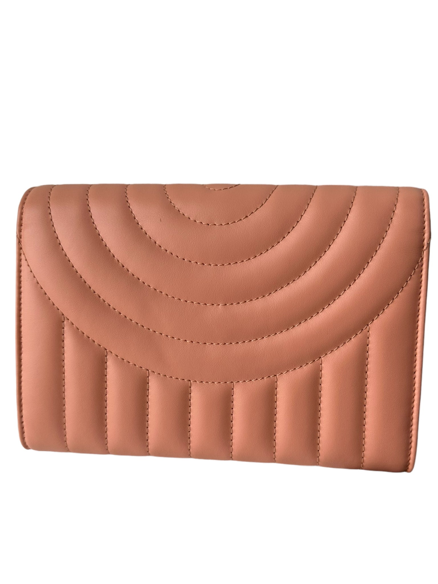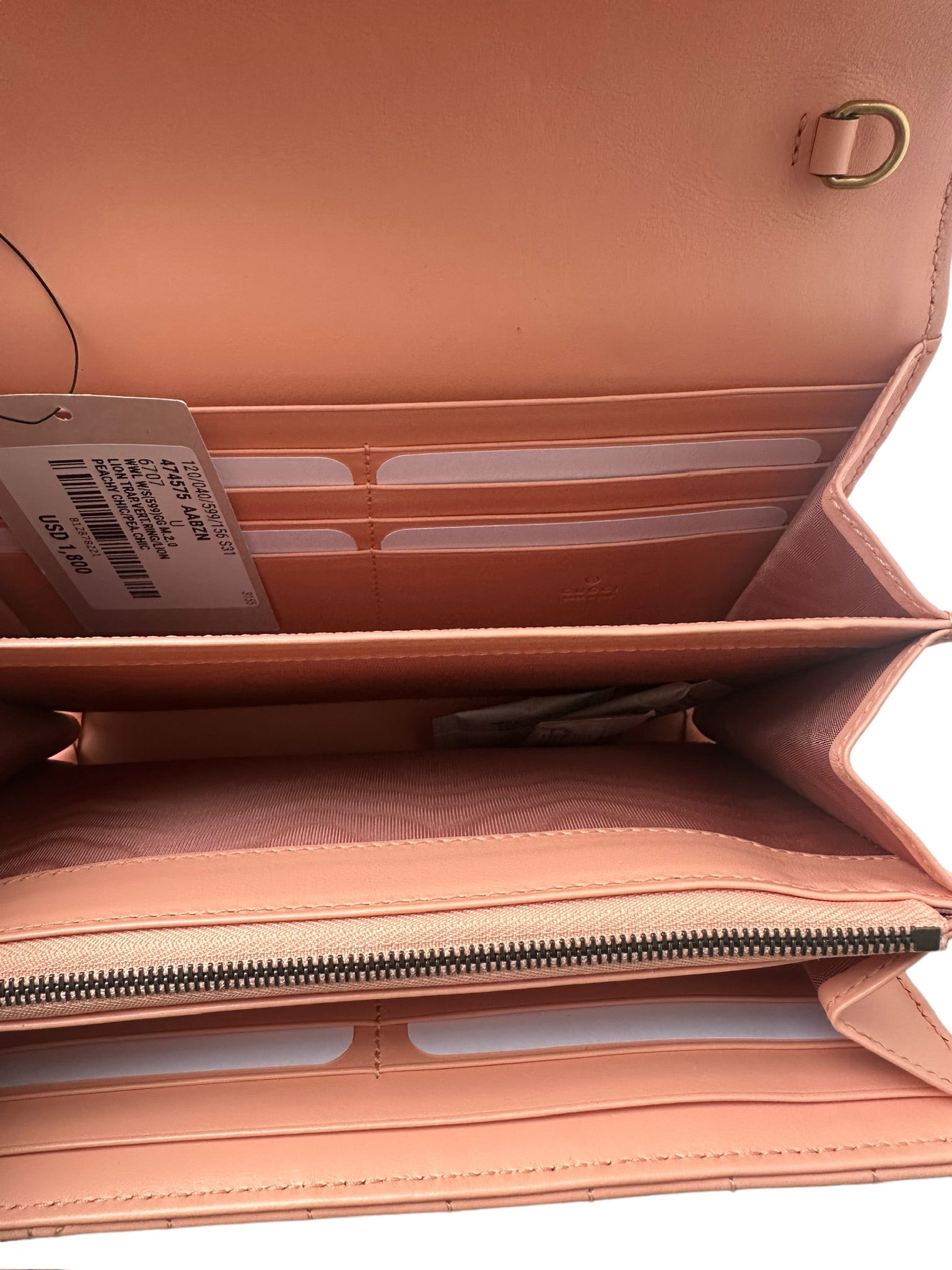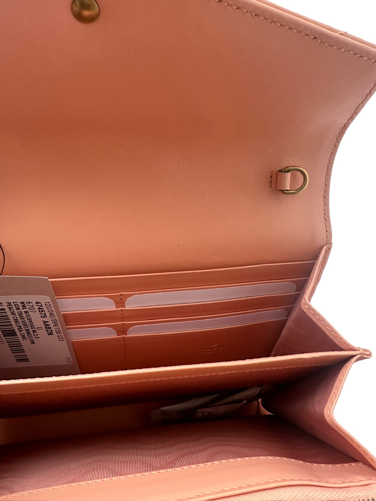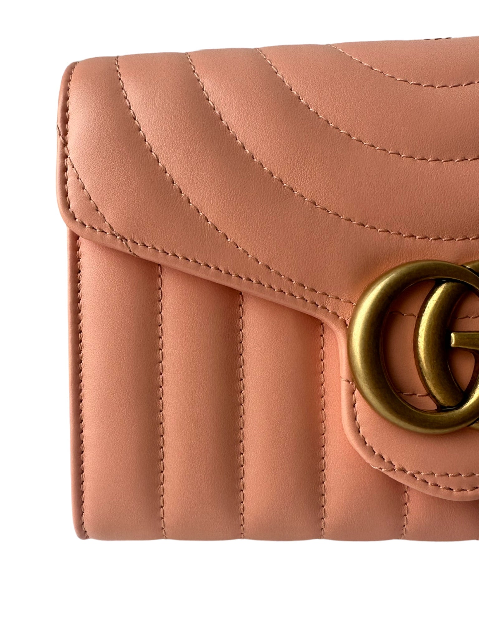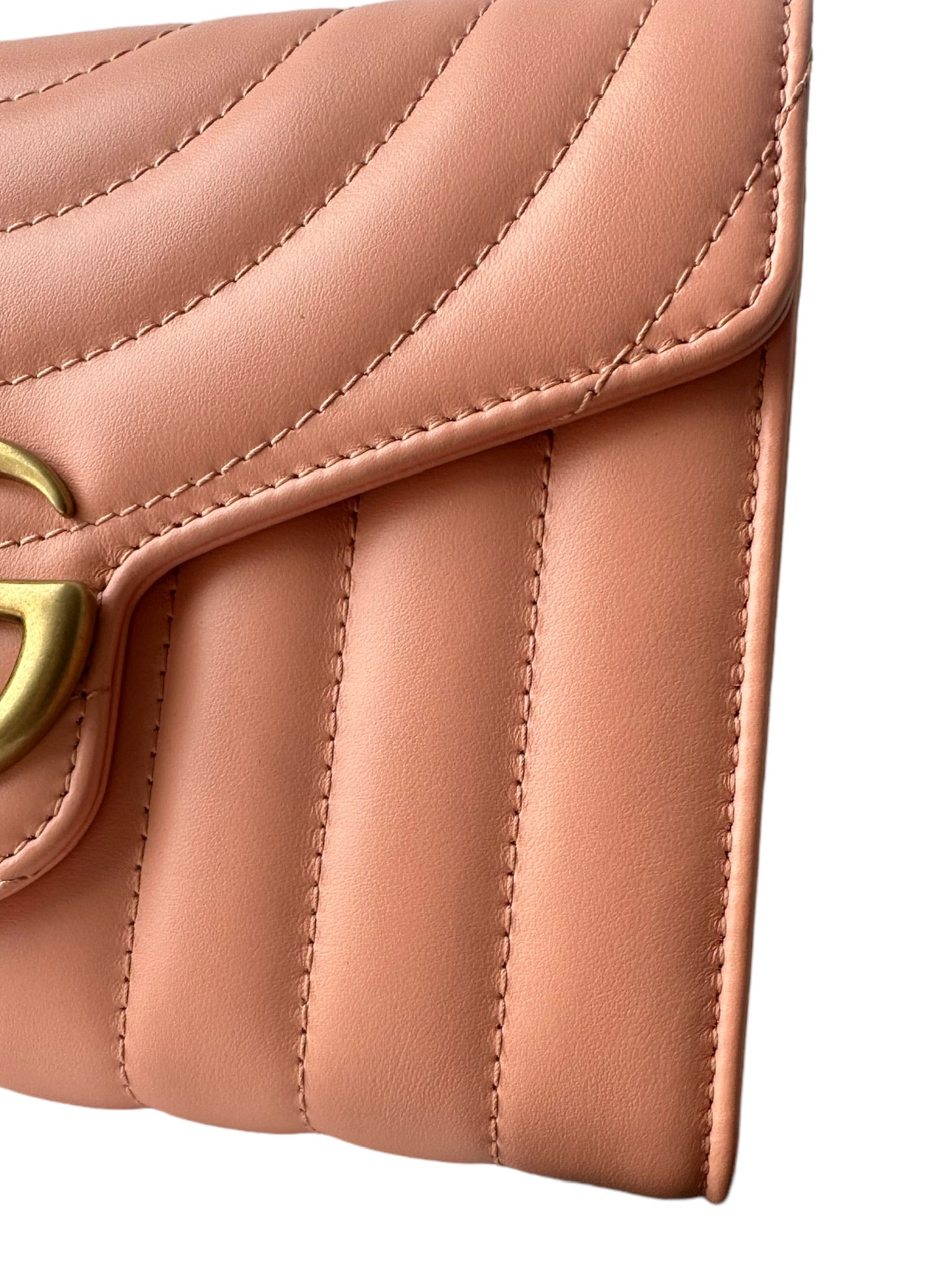 Esta billetera GUCCI GG Marmont con cadena en color melocotón usada es el complemento perfecto para cualquier atuendo. Con sus detalles dorados y su hermoso color rosa, irradia elegancia y sofisticación.
