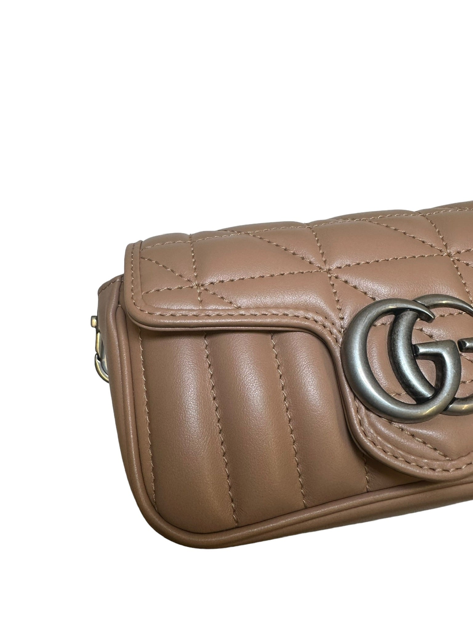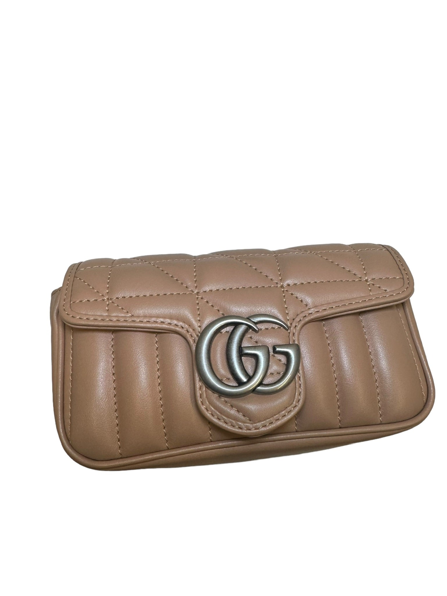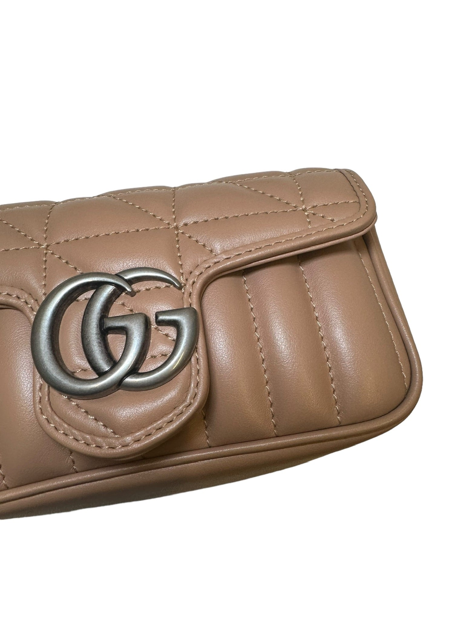 Experimente el lujo con el bolso GUCCI GG Matelasse Beige Marmont con elegantes herrajes plateados. Esta pieza atemporal está elaborada con exquisitos detalles y calidad, lo que la convierte en un accesorio llamativo para cualquier ocasión. Realce su estilo con el diseño elegante y sofisticado de este bolso de diseñador por excelencia.
