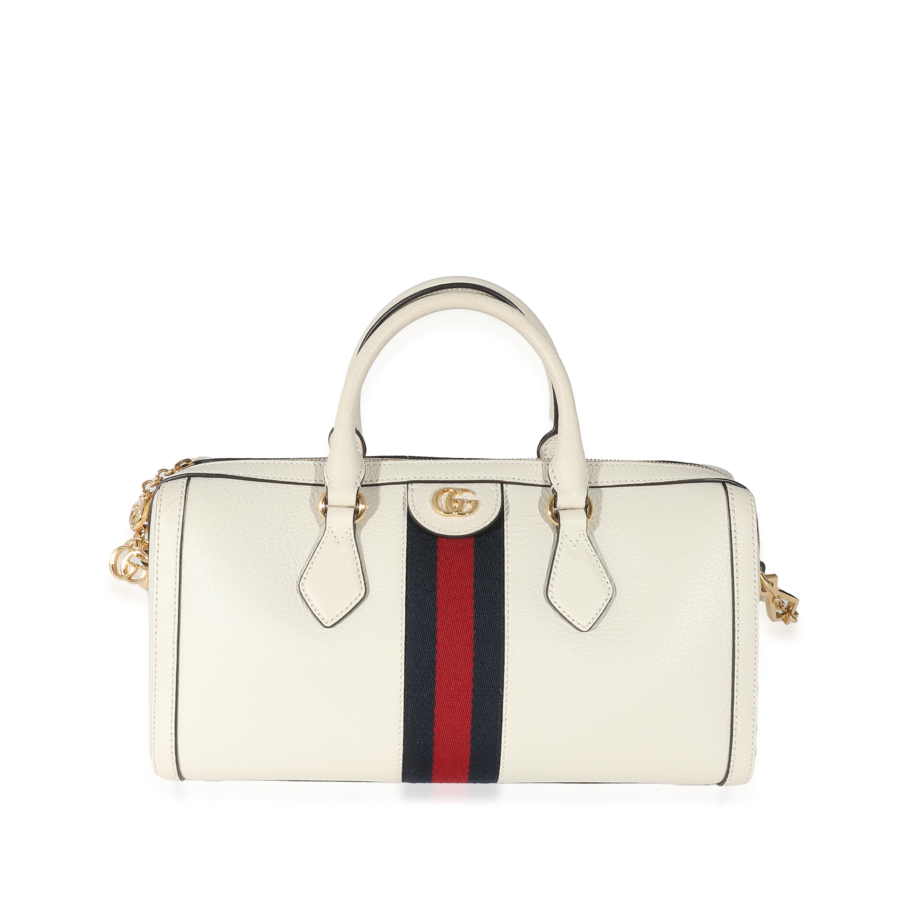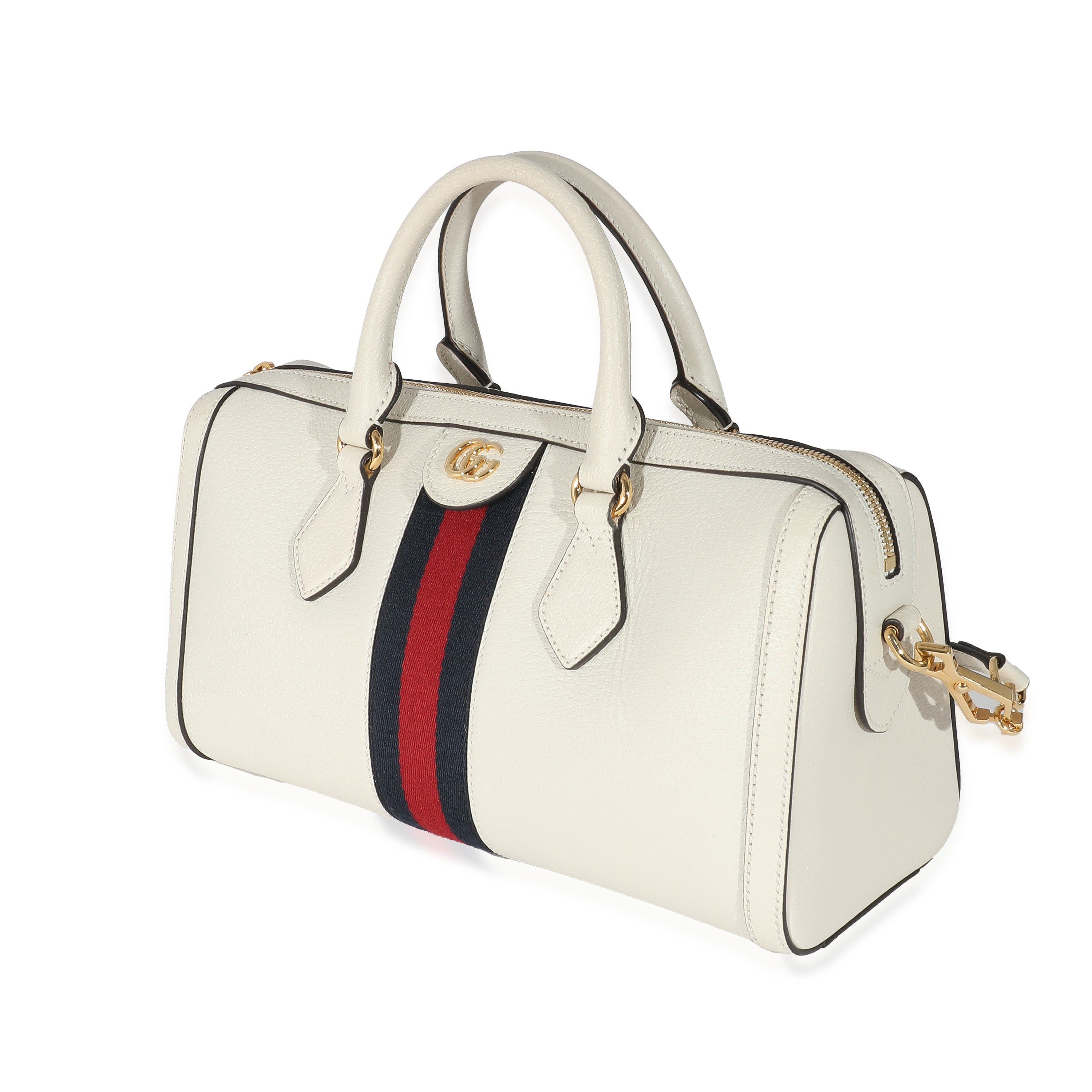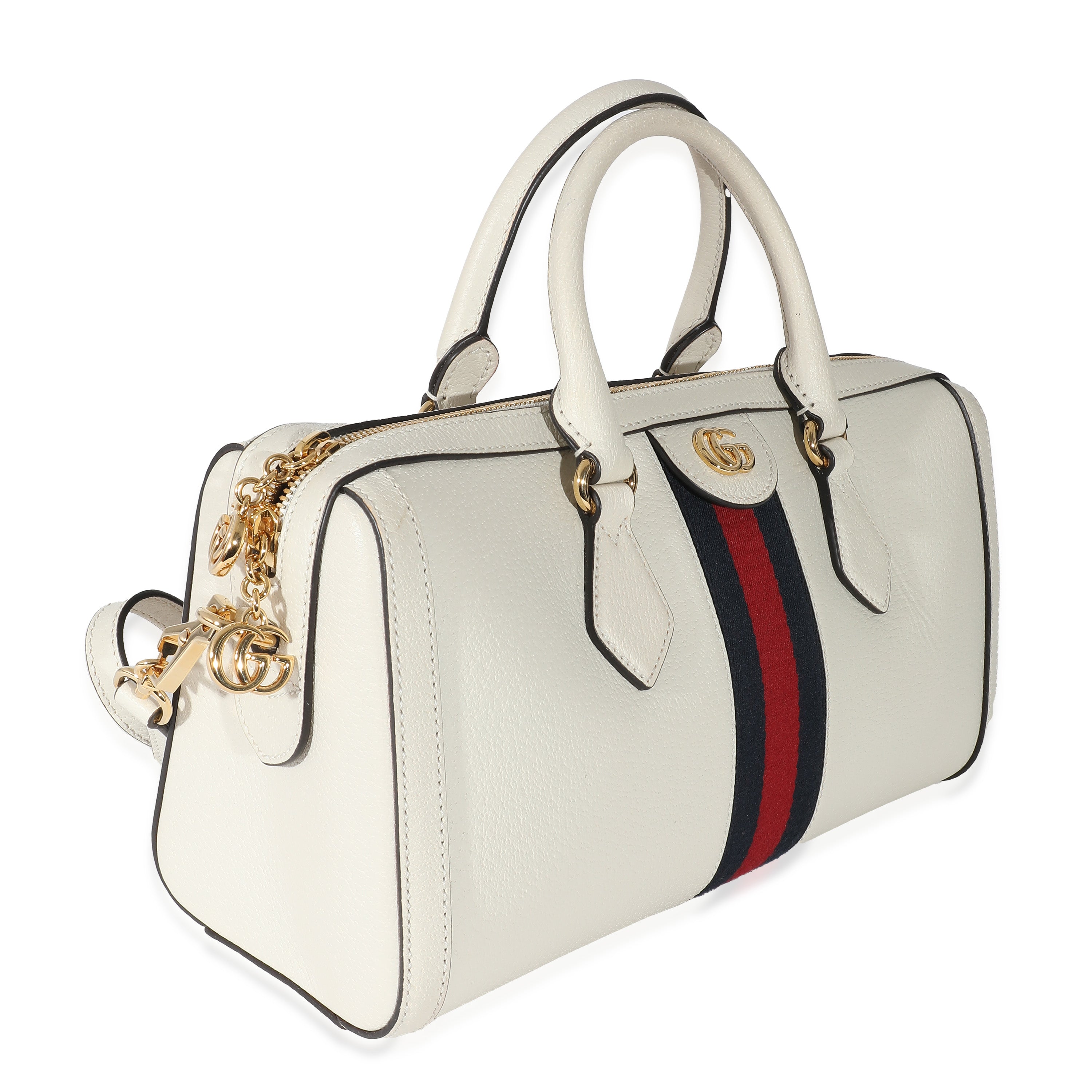 Este bolso Boston mediano Ophidia de piel de becerro texturizada en blanco Mystic de GUCCI está elaborado con cuero italiano genuino. Tiene un tamaño considerable de 32,5 x 16,5 x 13 cm y una longitud de asa de entre 7,5 y 50 cm. Incluye funda guardapolvo, folleto de cuidados y dos correas extraíbles, lo que lo convierte en un accesorio perfecto para viajar o para el uso diario.