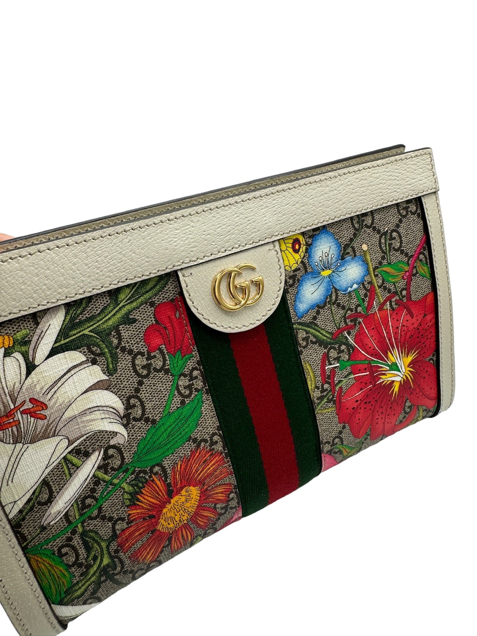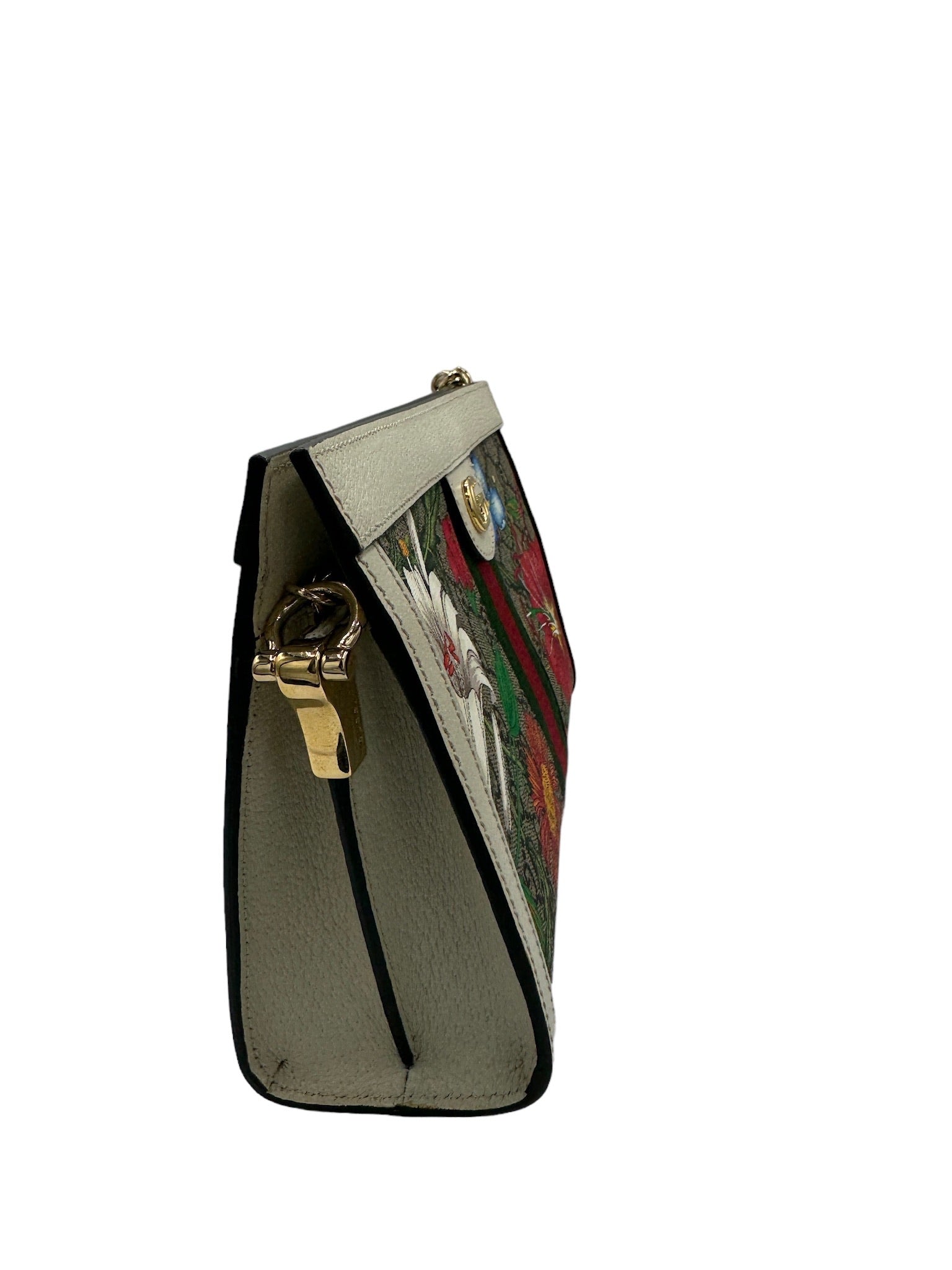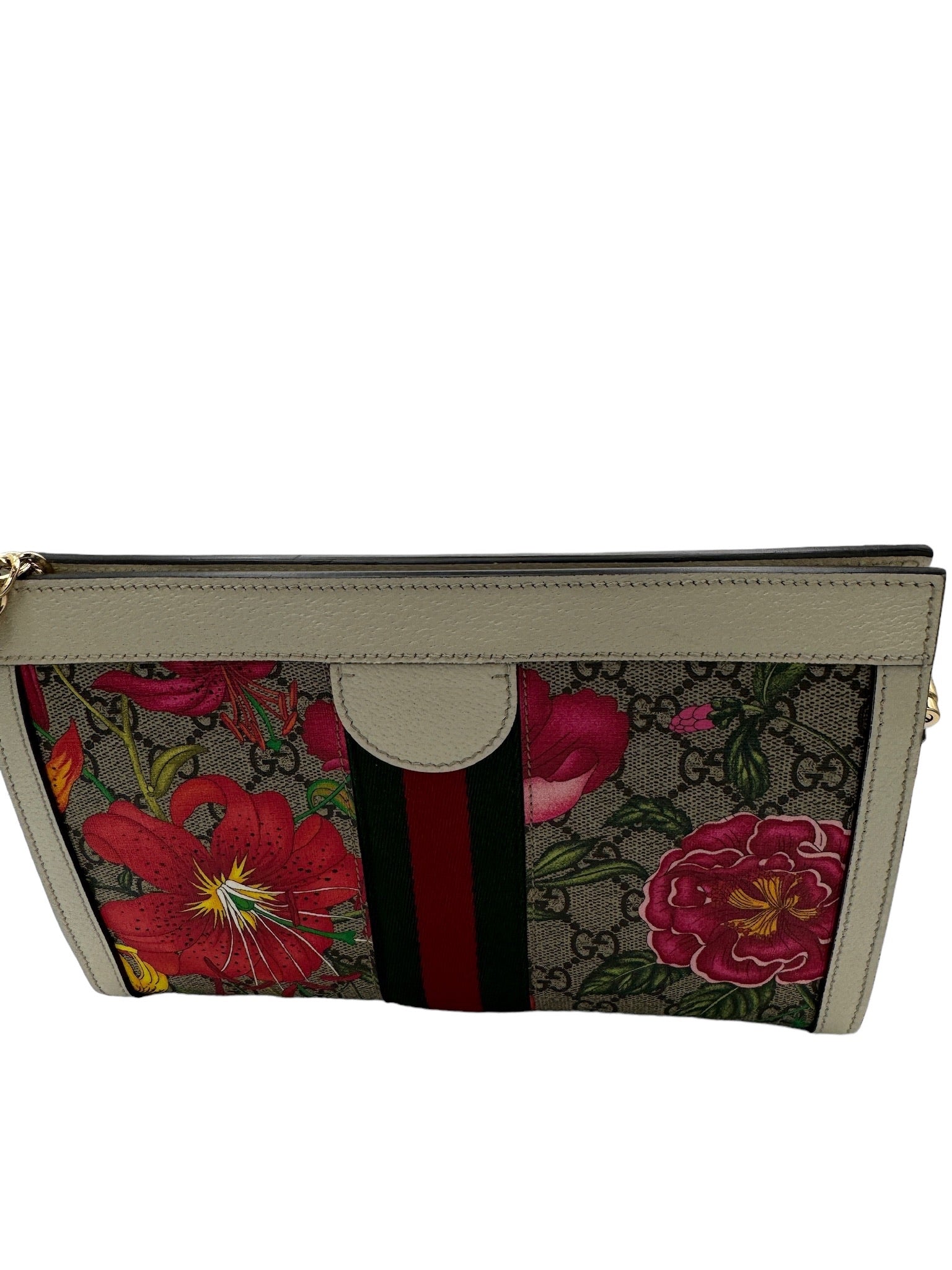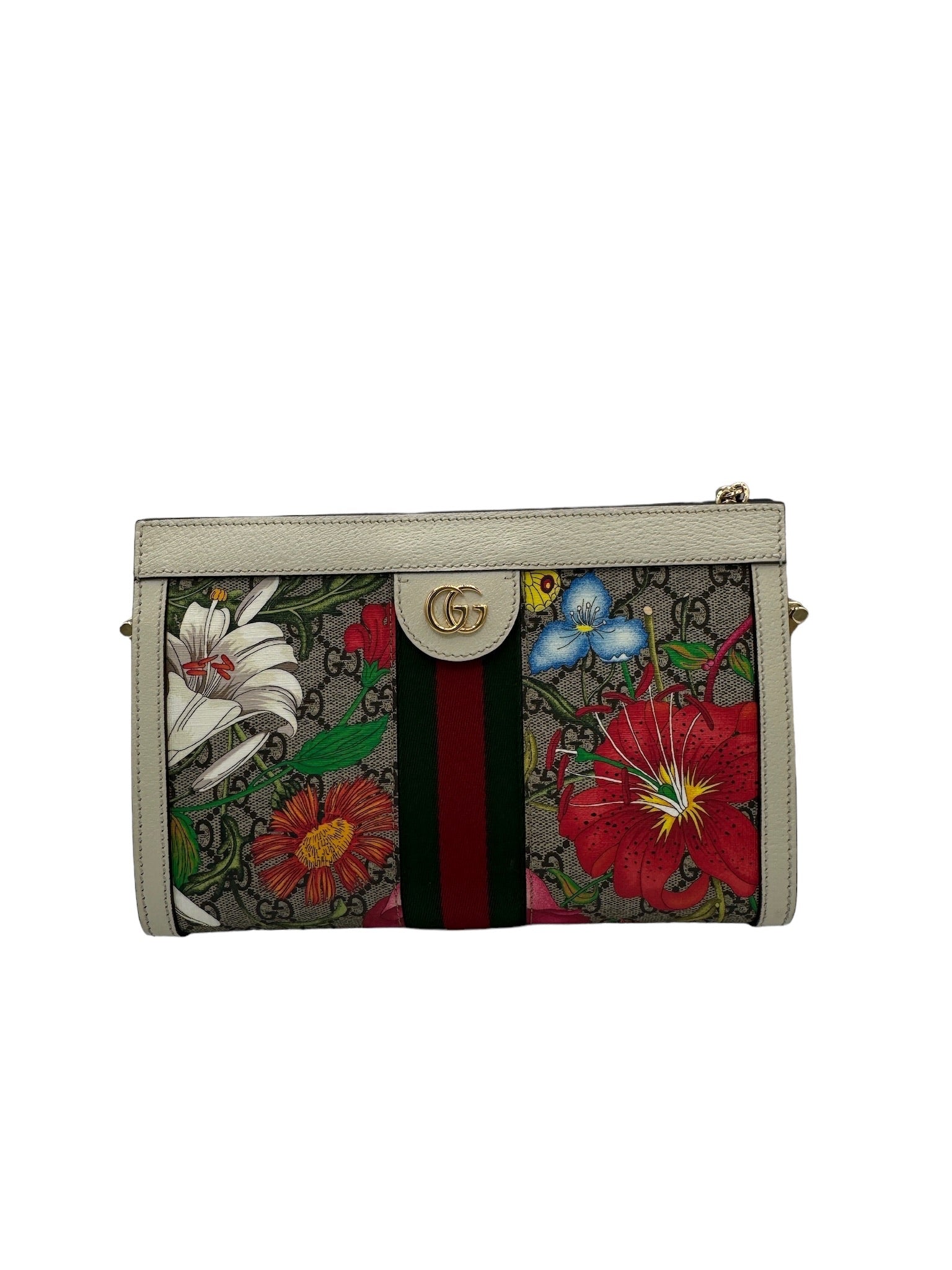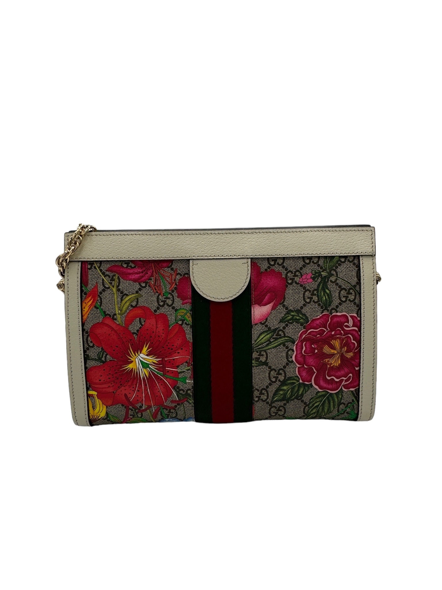 Mejora tu estilo con el bolso de hombro con cadena GUCCI Ophidia Flora GG Coated Canvas, un impresionante bolso usado en tejido de lona multicolor.