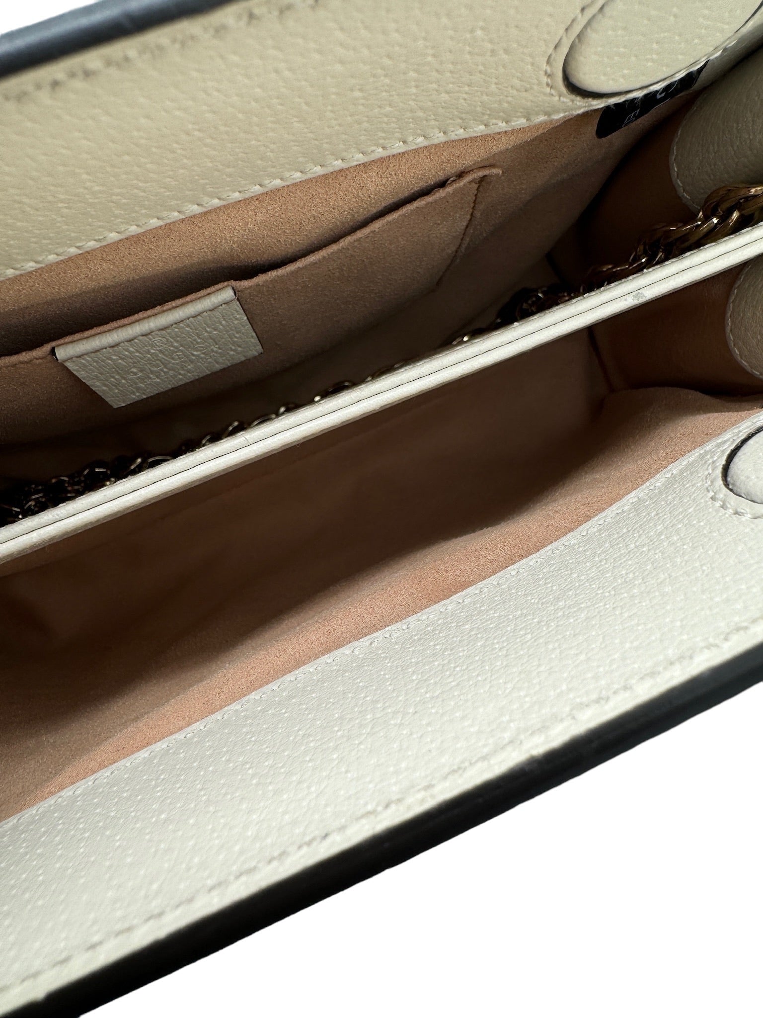 El bolso presenta un diseño único de lona con revestimiento GG y está equipado con una correa de cadena para el hombro para mayor comodidad. Los herrajes en tono dorado agregan un toque adicional de lujo a la estética general.