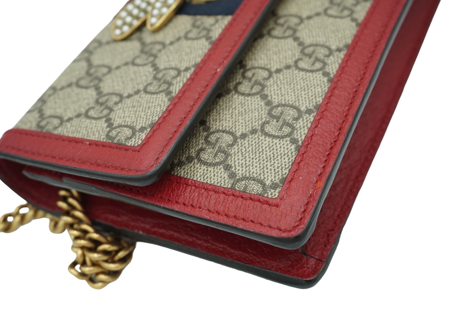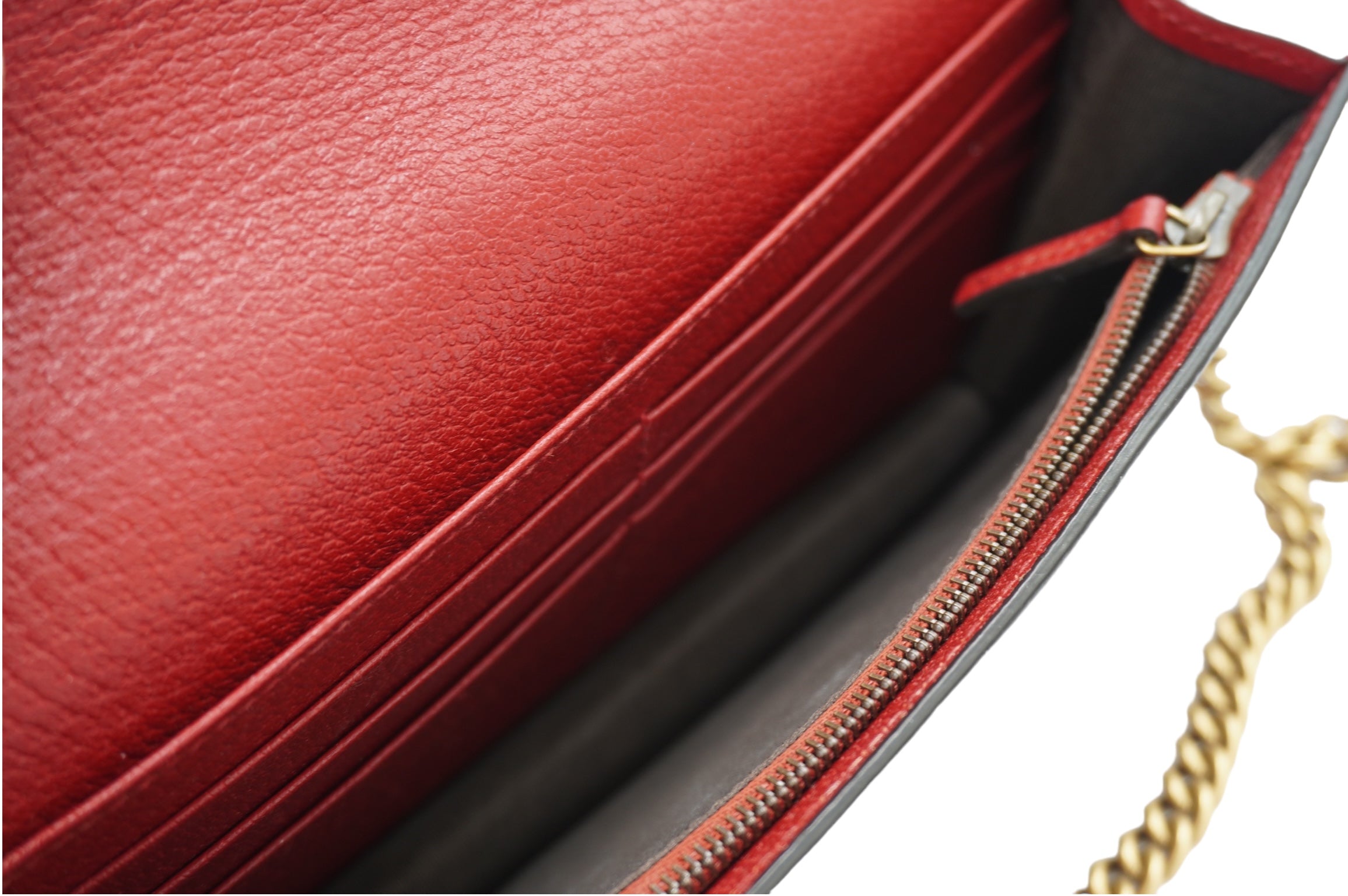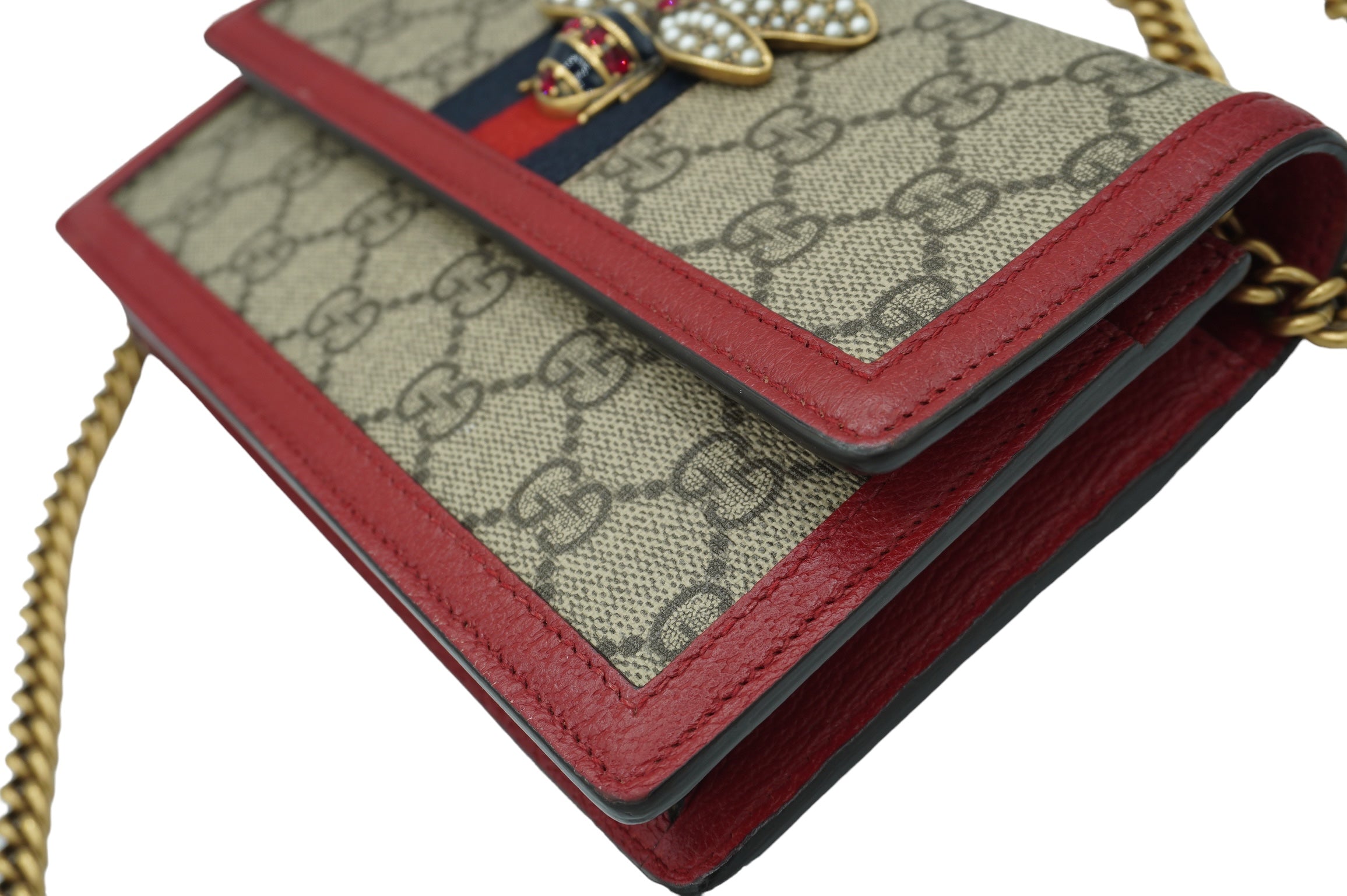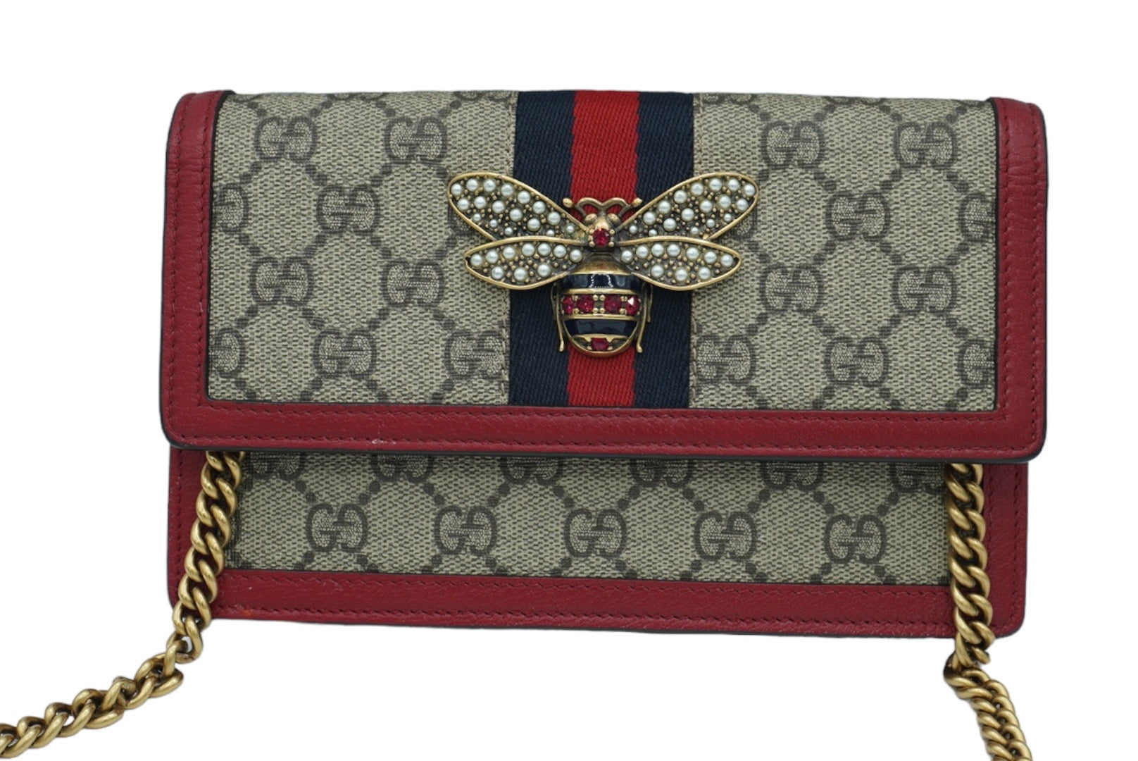 Realza tu estilo diario con la cartera con cadena GUCCI Queen Margaret. Esta minicartera, confeccionada con una lujosa lona revestida con GG y con un impresionante herraje dorado envejecido, es elegante y funcional. Su interior está elaborado con tela y cuero, lo que le proporciona durabilidad y un toque de elegancia. Dimensiones: 20 cm de ancho x 12,7 cm de alto x 2,5 cm de profundidad