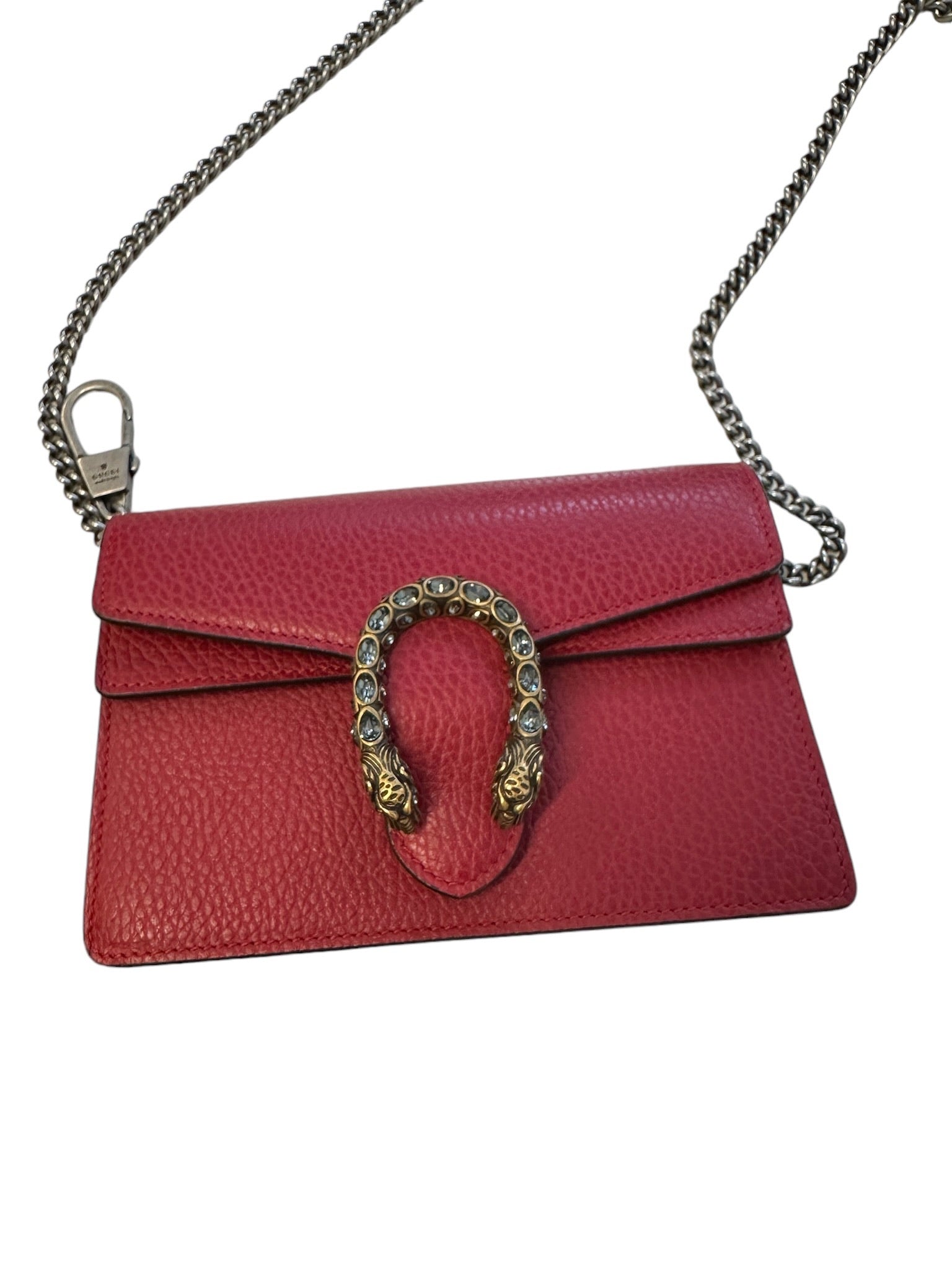 Realza tu estilo con el Super Mini Dionysus de piel de becerro Red Dollar de GUCCI. Este minibolso, fabricado en excelentes condiciones, cuenta con un diseño lujoso y audaz. Perfecto para cualquier ocasión, su tamaño versátil te permite llevar tus objetos esenciales con estilo. Haz una declaración y disfruta del accesorio de moda definitivo.