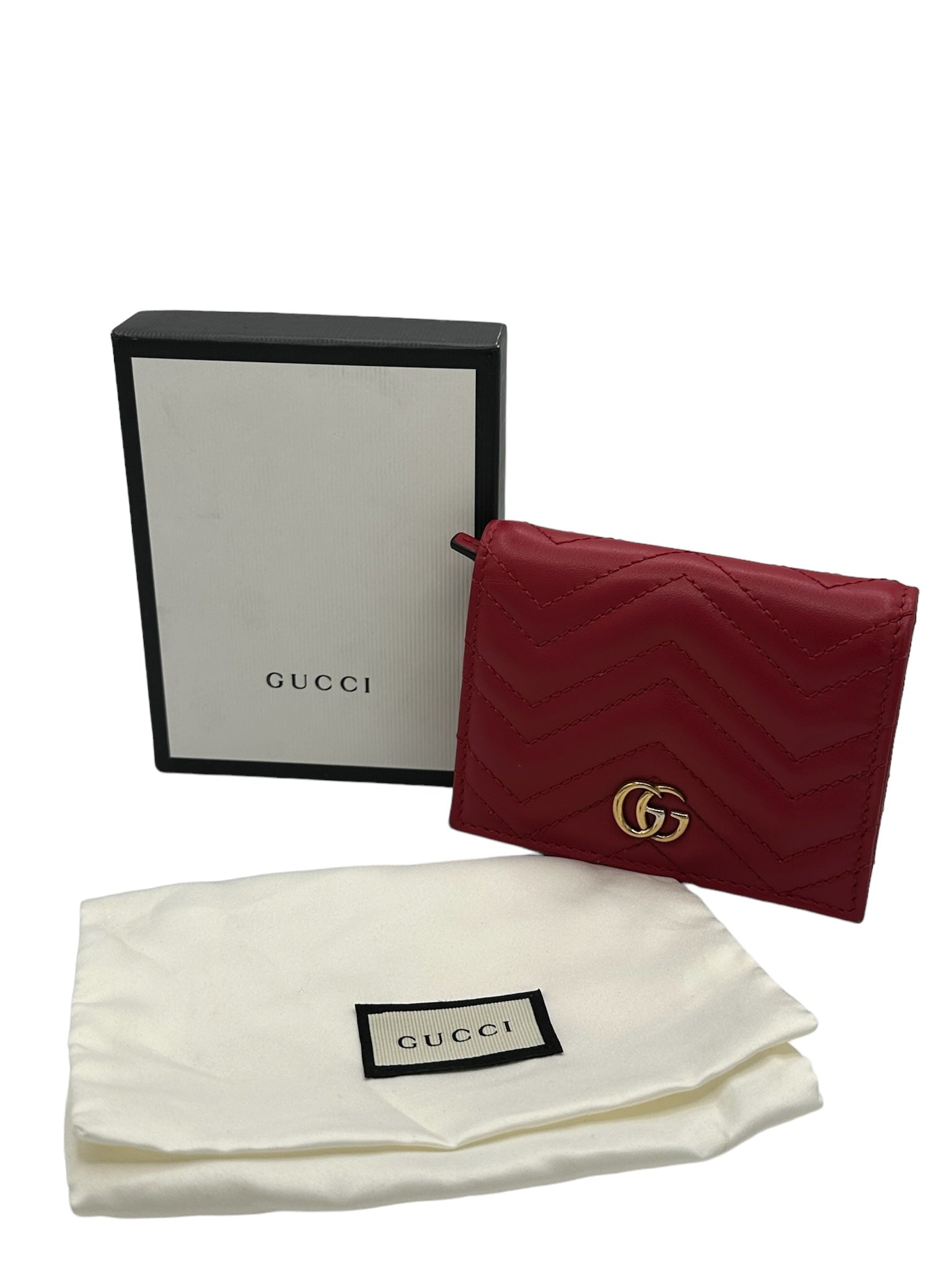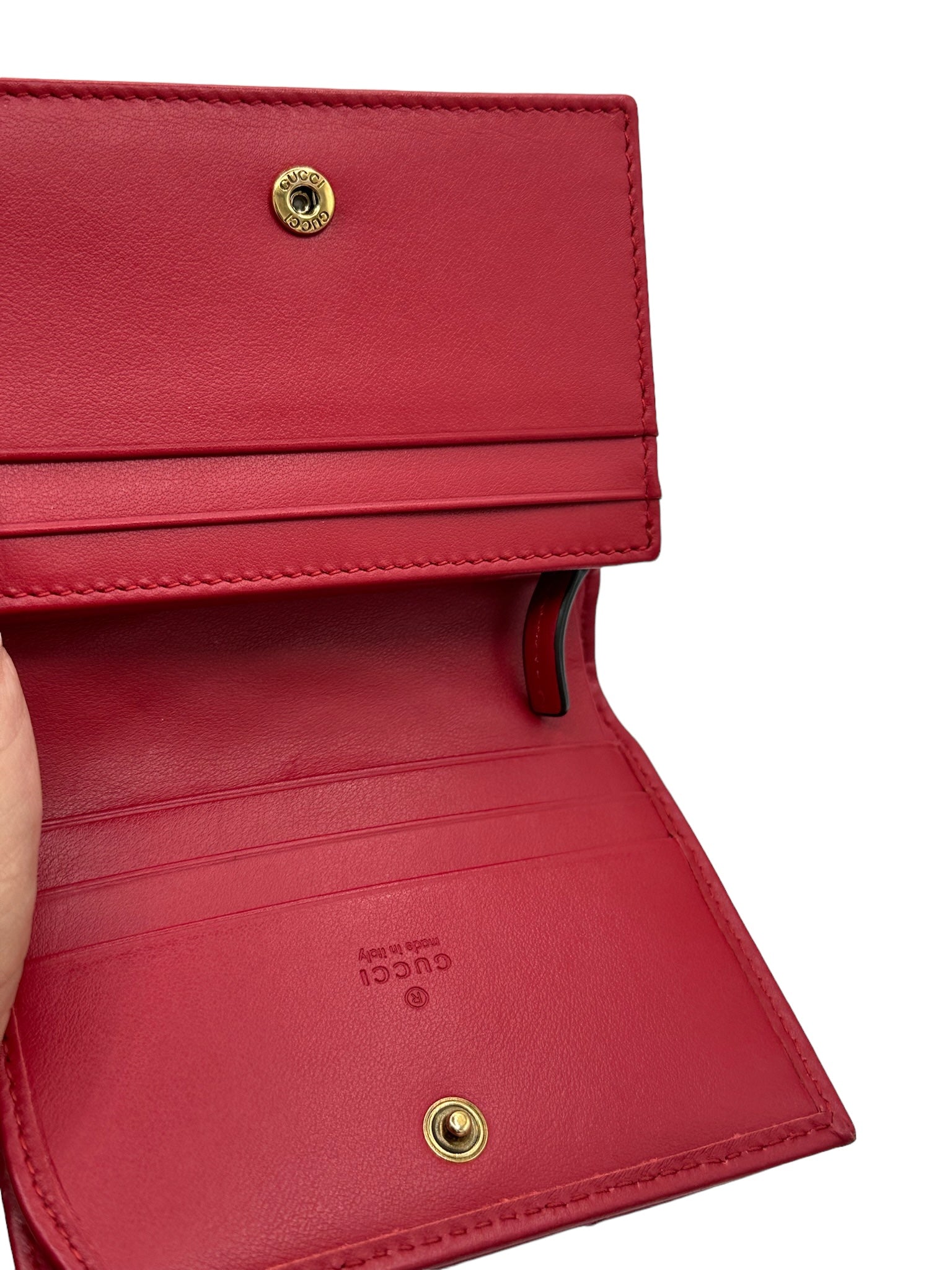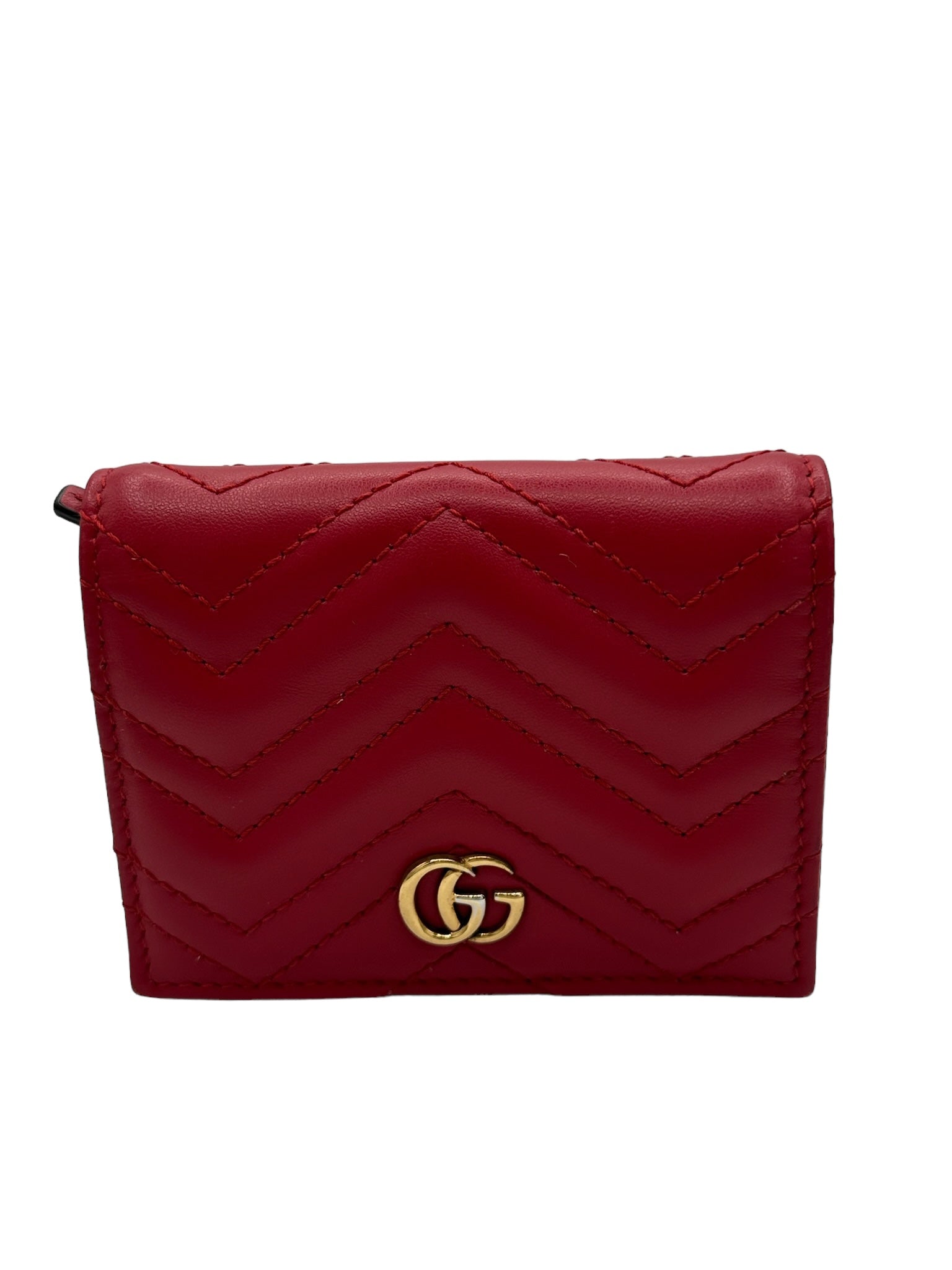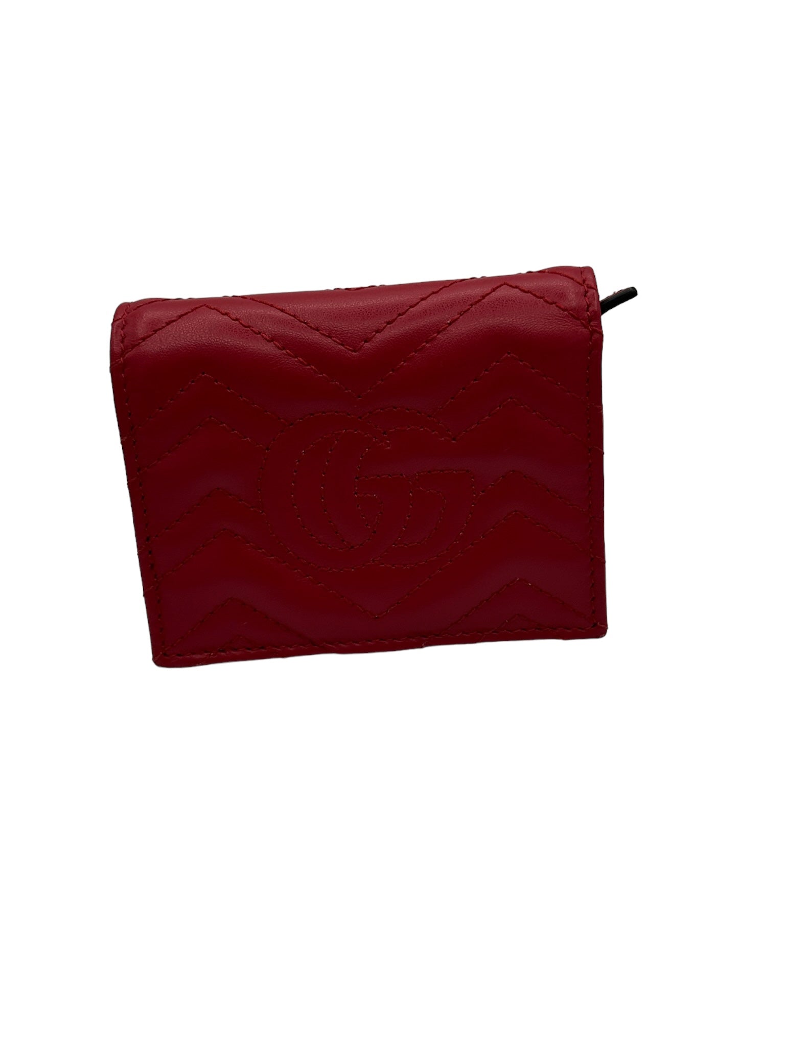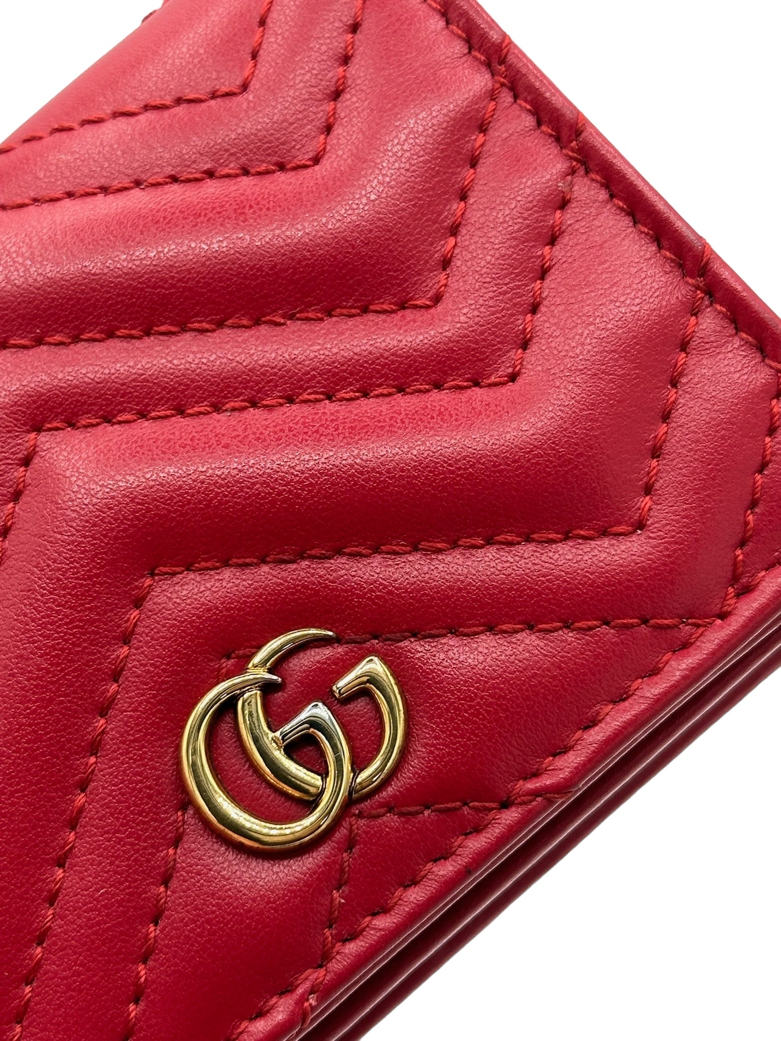 Realza tu estilo con esta cartera con tarjetero Marmont de color rojo de GUCCI, perfecta para llevar tus tarjetas y dinero en efectivo con facilidad. Fabricada en piel de alta calidad, esta pequeña pieza de piel no solo es duradera, sino que también añade un toque de lujo a tu atuendo.