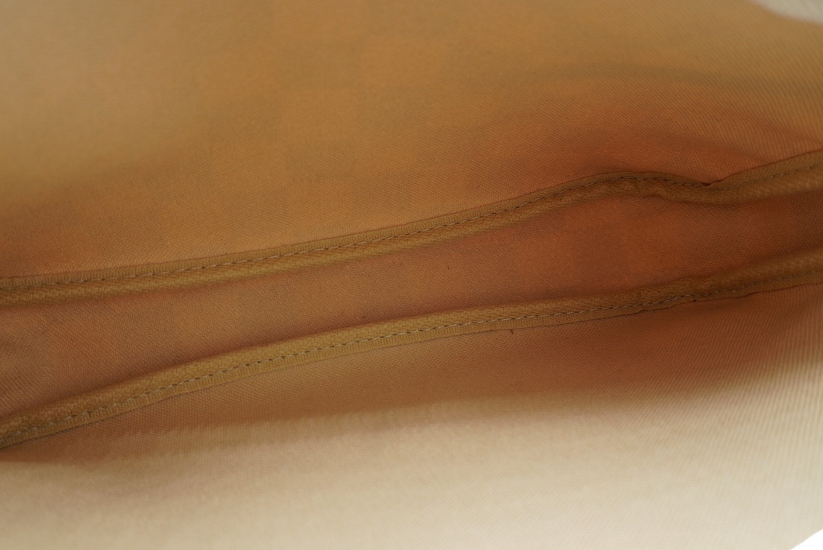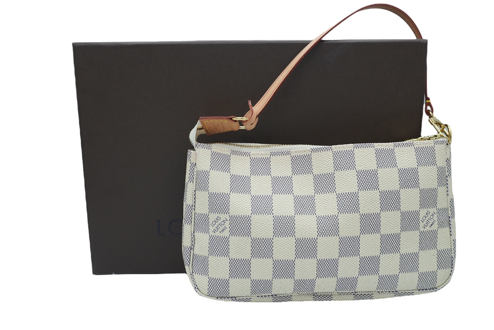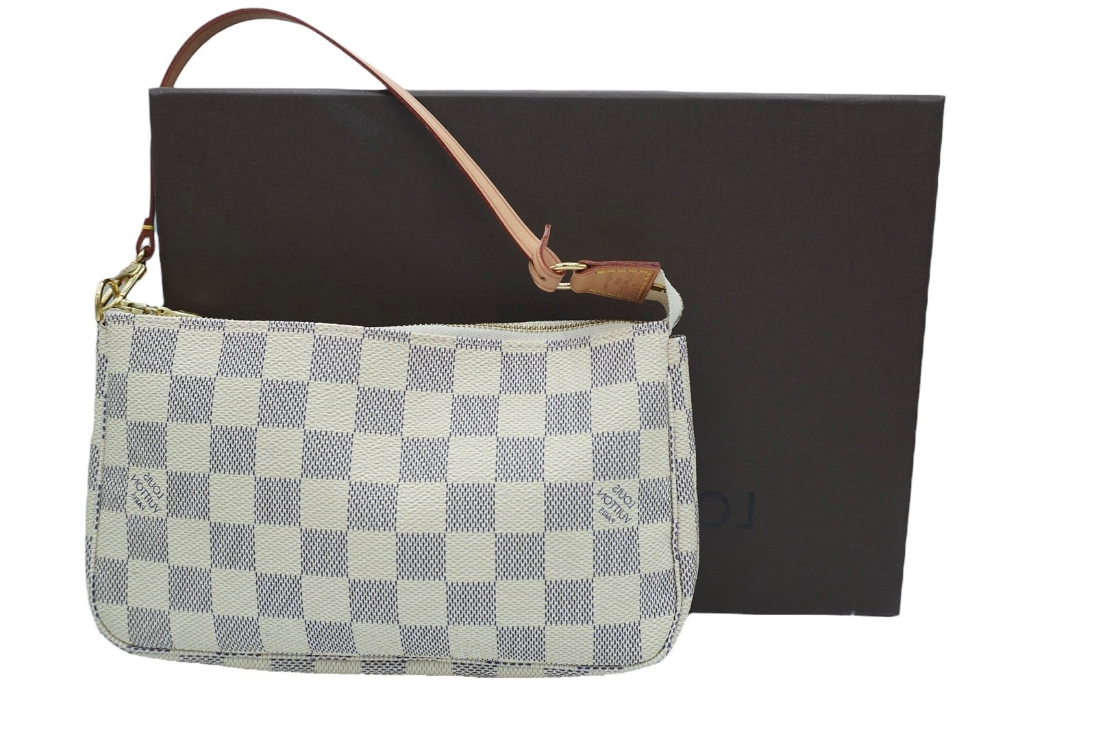 Este LOUIS VUITTON Damier Azur Pochette usado es un elegante bolso de hombro que presenta herrajes dorados y está hecho de lona blanca.