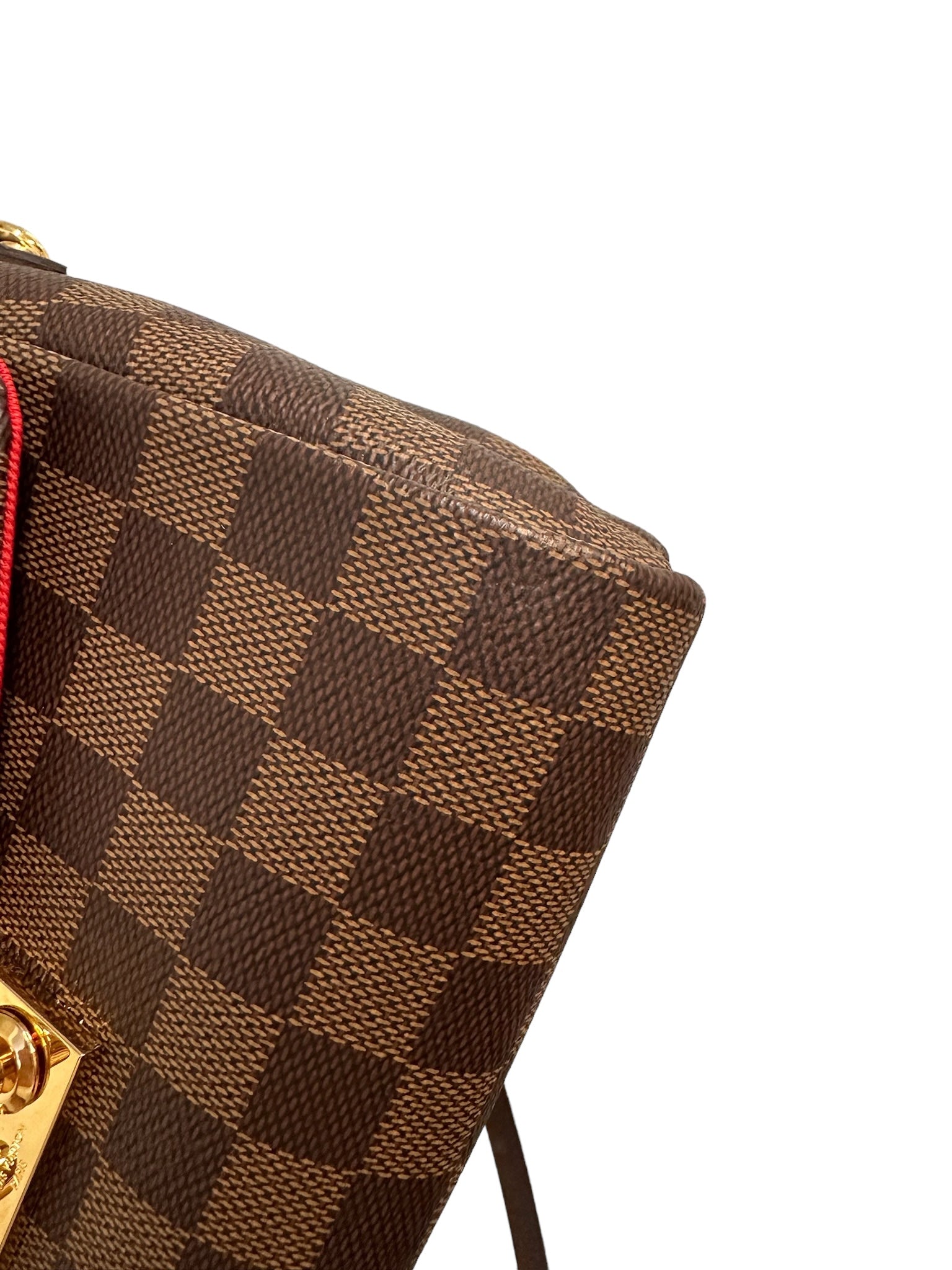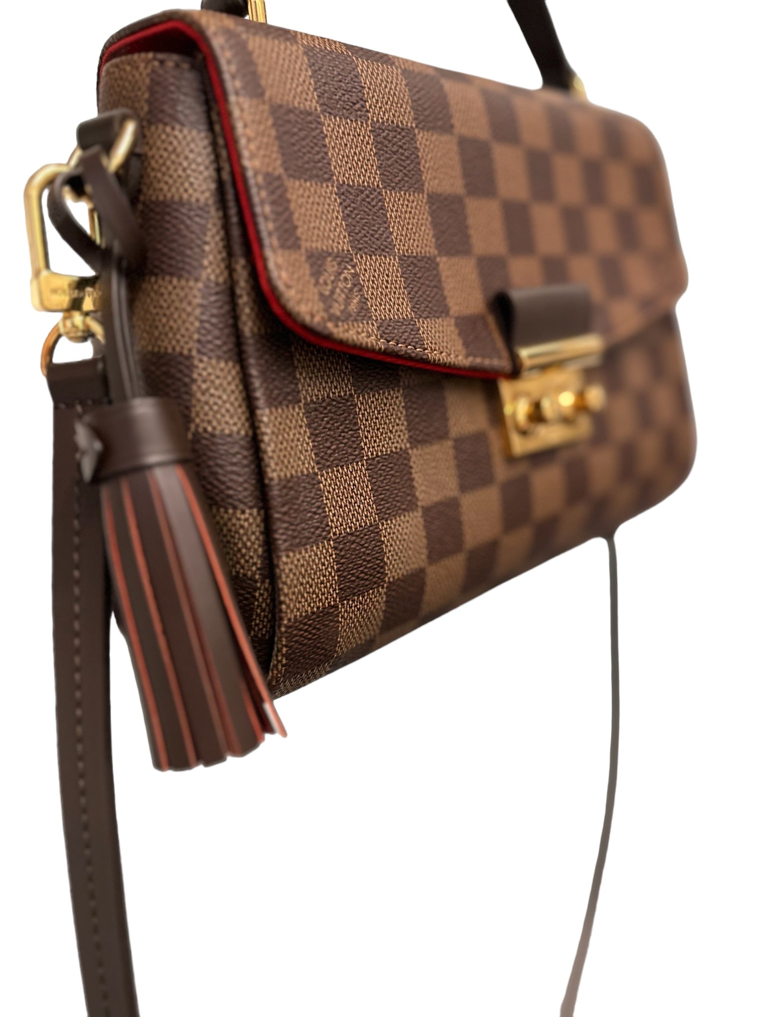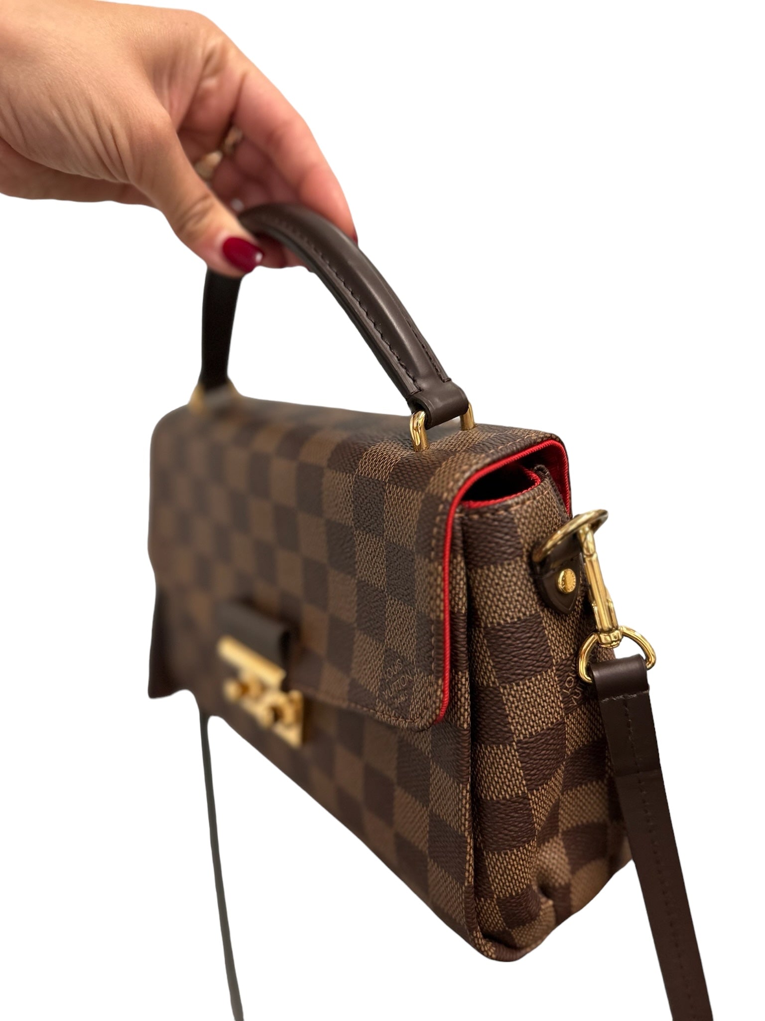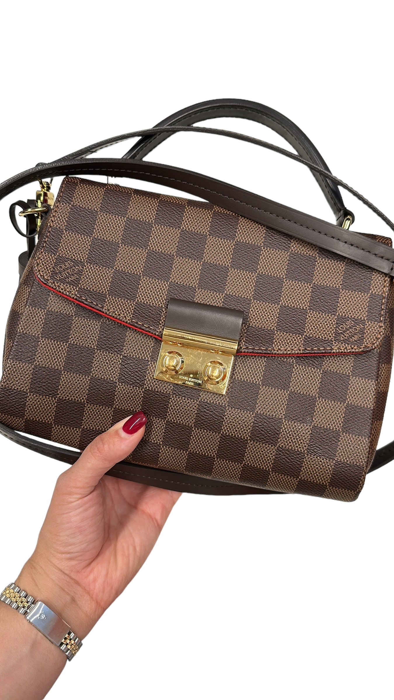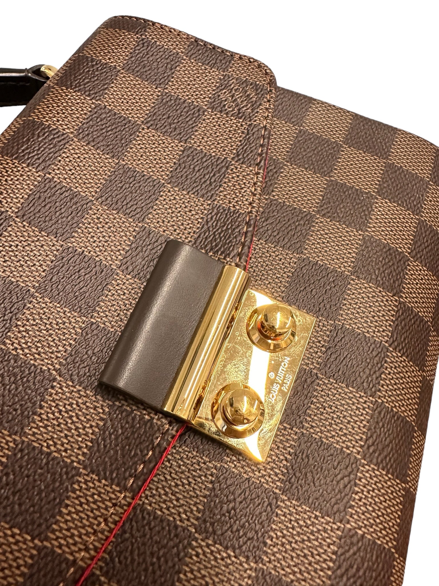 Disfrute del lujo con el bolso Croisette de lona Damier Ebene de LOUIS VUITTON. Este bolso, que cuenta con detalles en tonos dorados y un forro rojo vibrante, es elegante y funcional. Realce cualquier atuendo y lleve sus artículos esenciales con estilo.