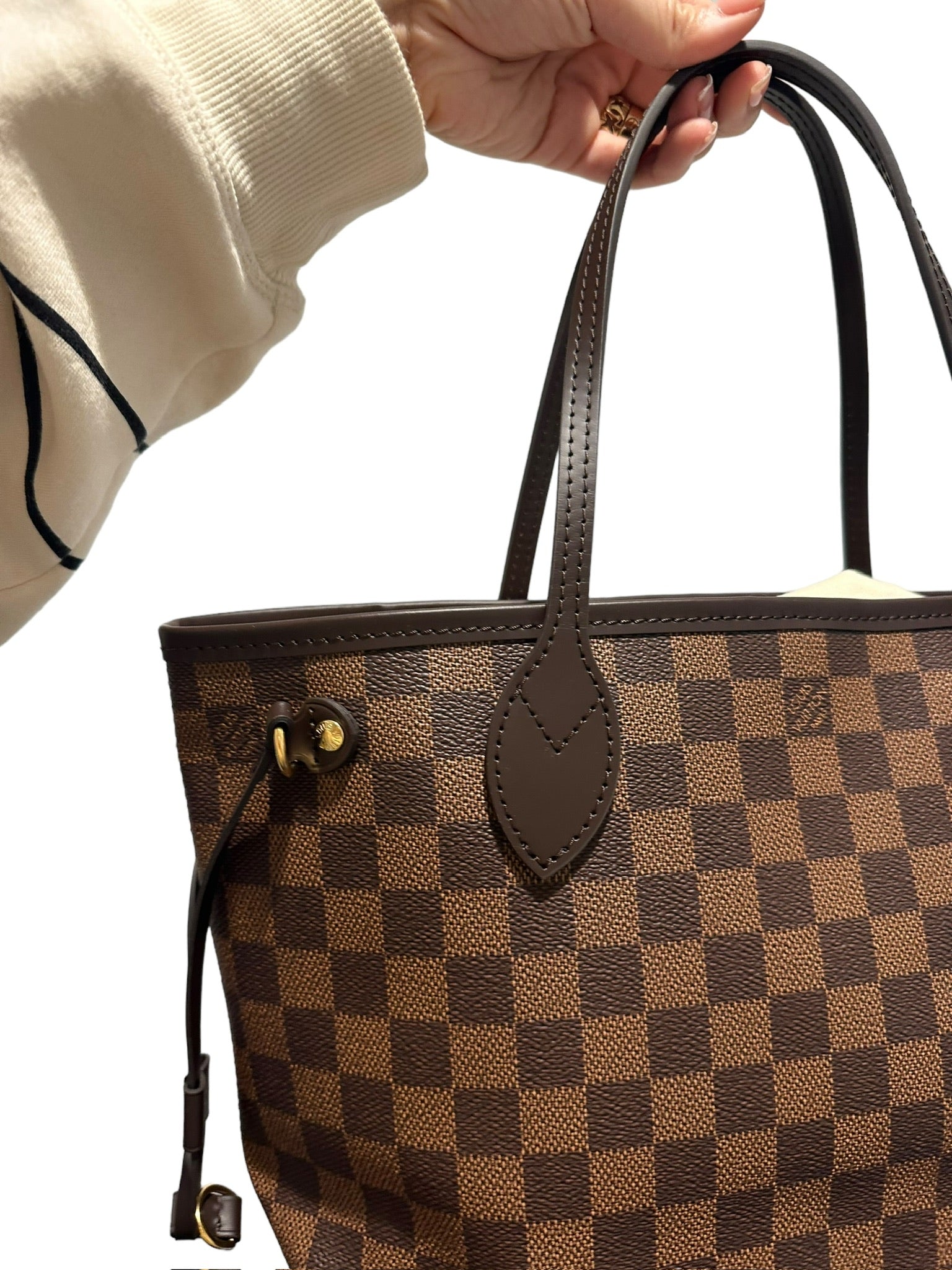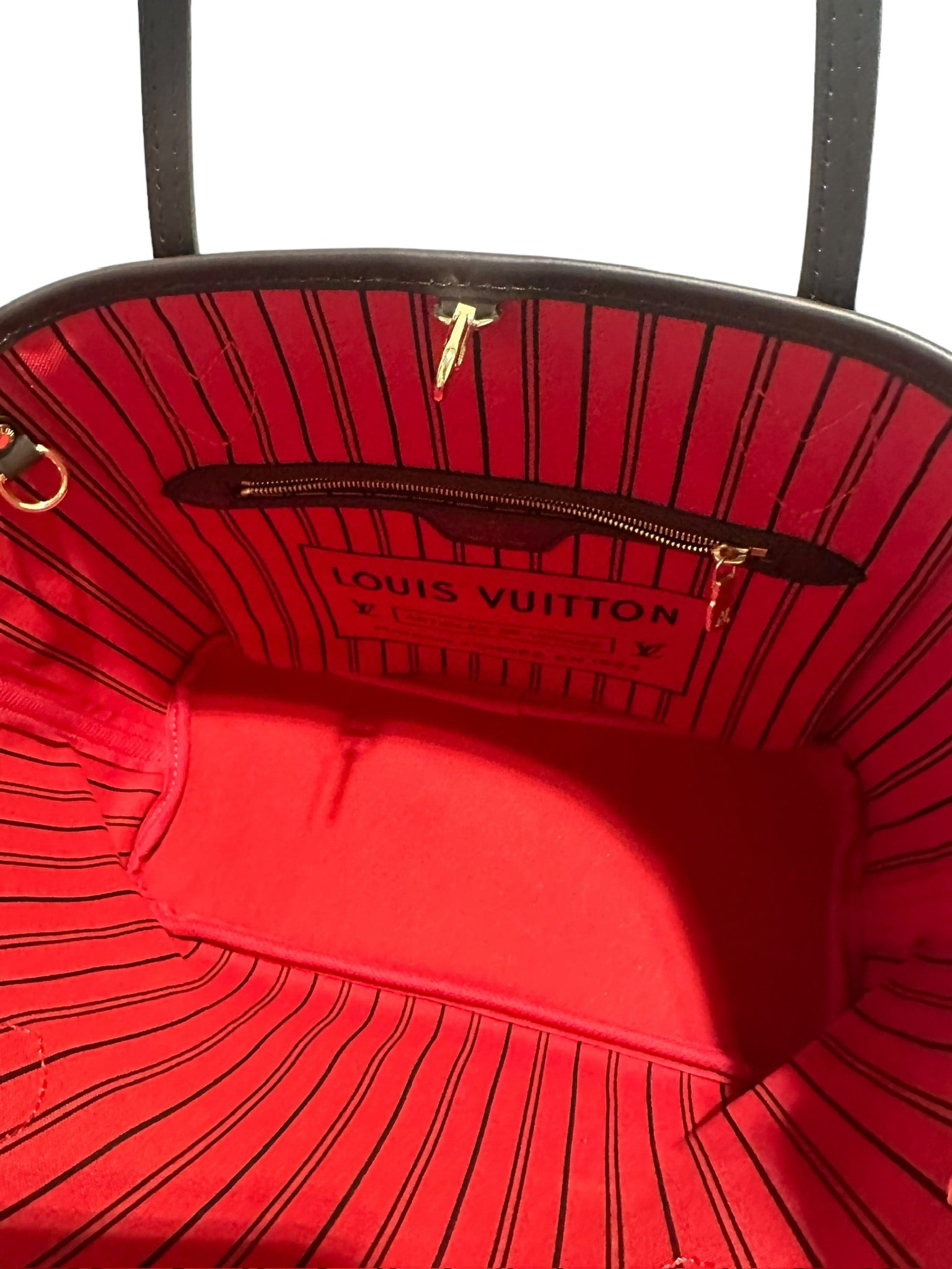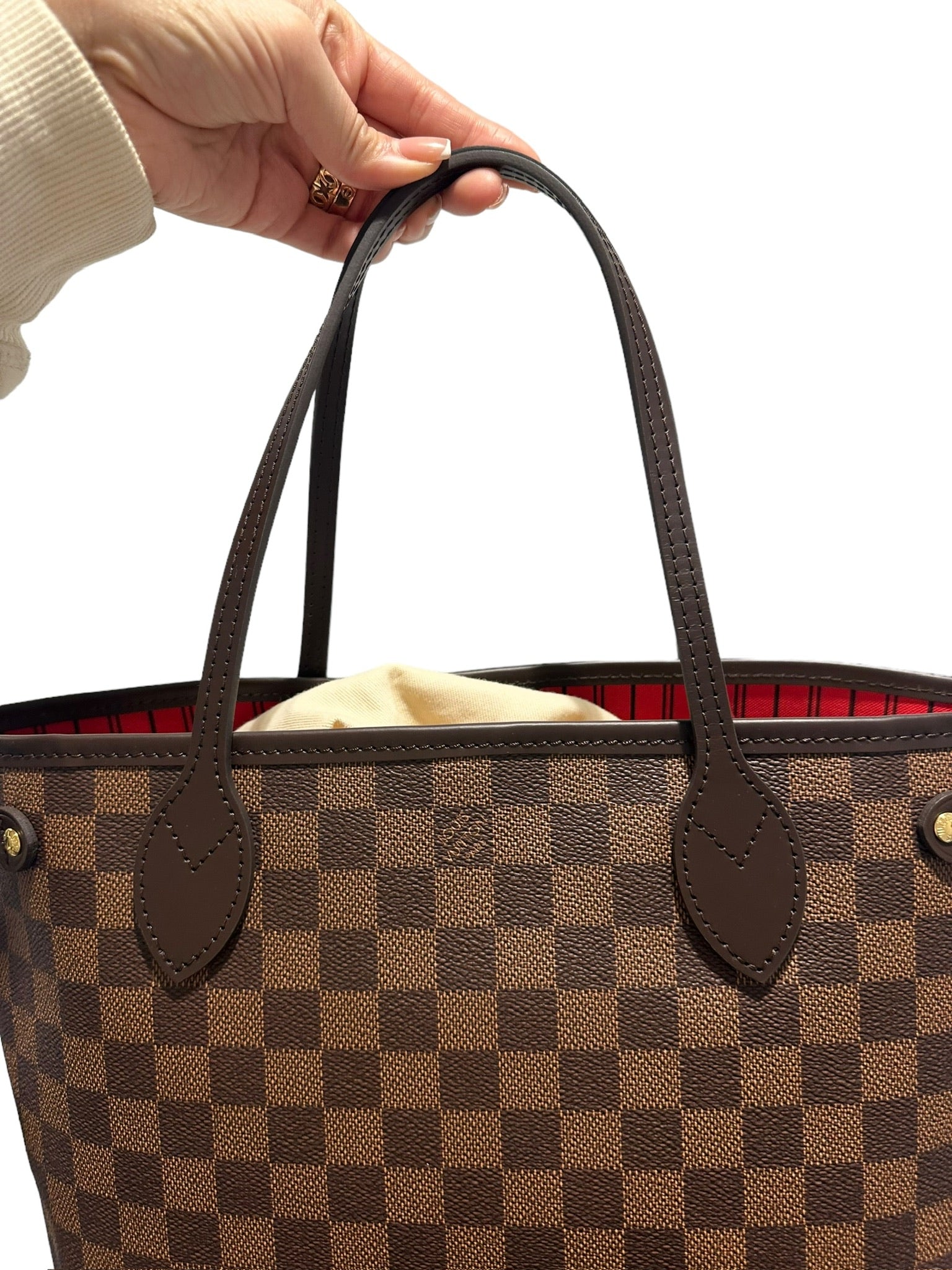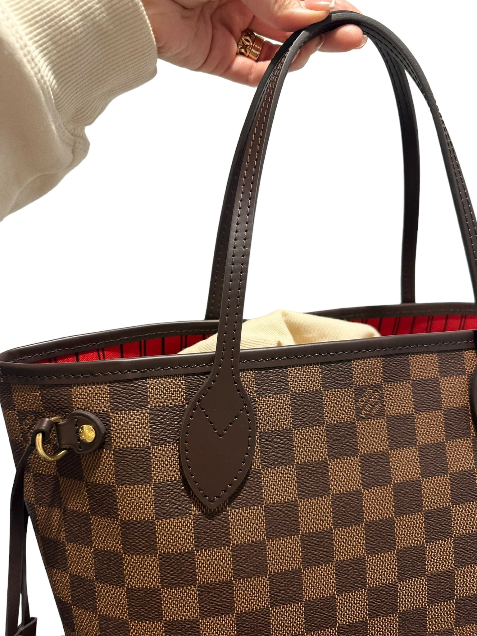 El Neverfull PM de LOUIS VUITTON presenta lujosos herrajes dorados y un llamativo forro rojo. Este bolso, confeccionado con lona Damier Ebene, irradia sofisticación y estilo. Realza tu guardarropa con este accesorio atemporal.