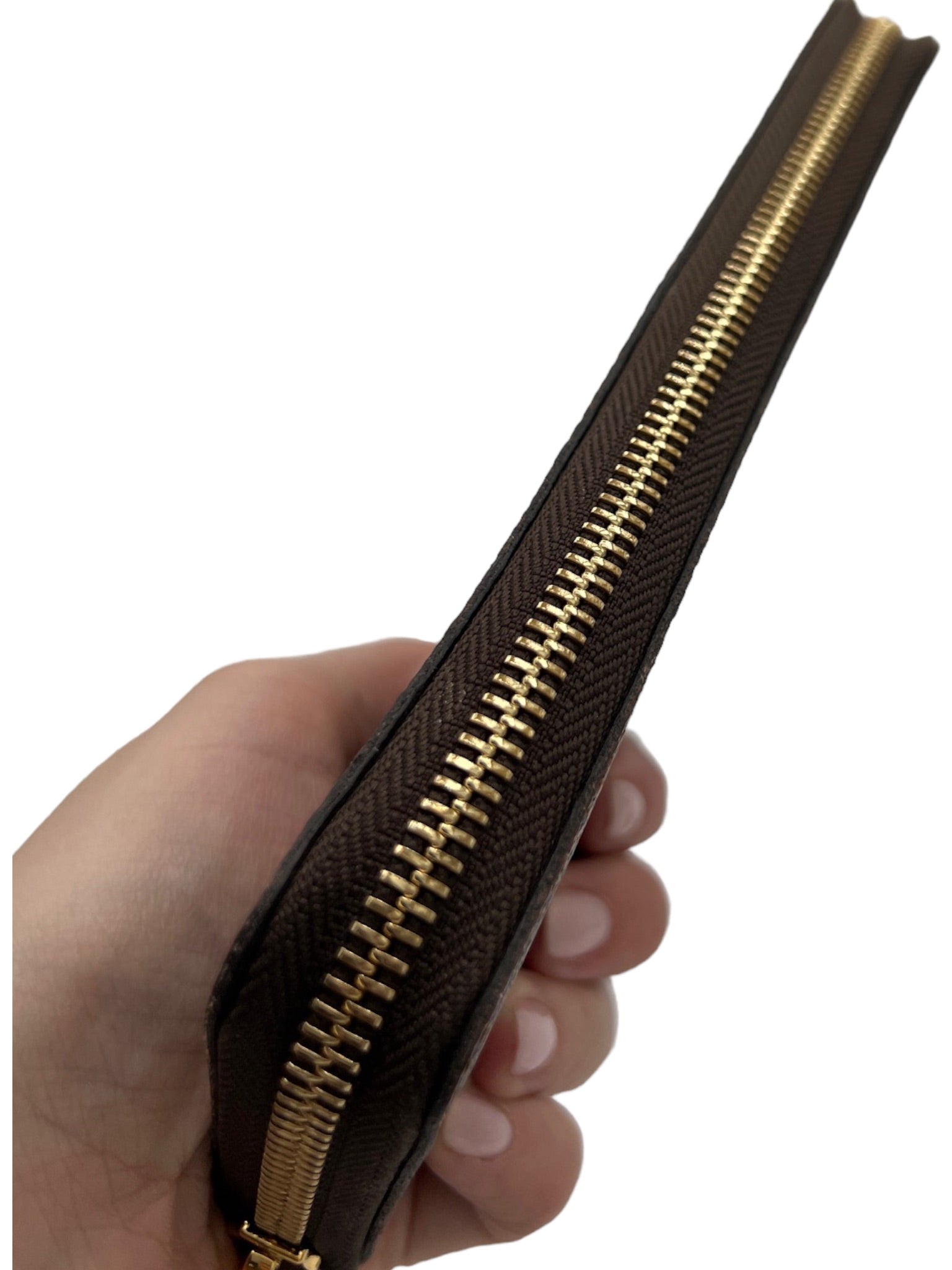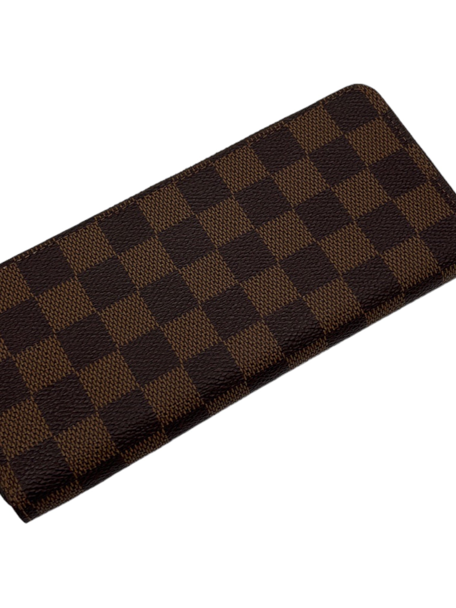 Esta cartera Damier Ebene Rose Ballerina Clemence de LOUIS VUITTON usada es una excelente incorporación a su colección de artículos de cuero pequeños. La cartera está confeccionada en lona marrón y tiene detalles en tono dorado. Con una altura de 9 cm, un ancho de 20 cm y una profundidad de 2 cm, esta cartera tiene el tamaño perfecto para guardar sus artículos esenciales.