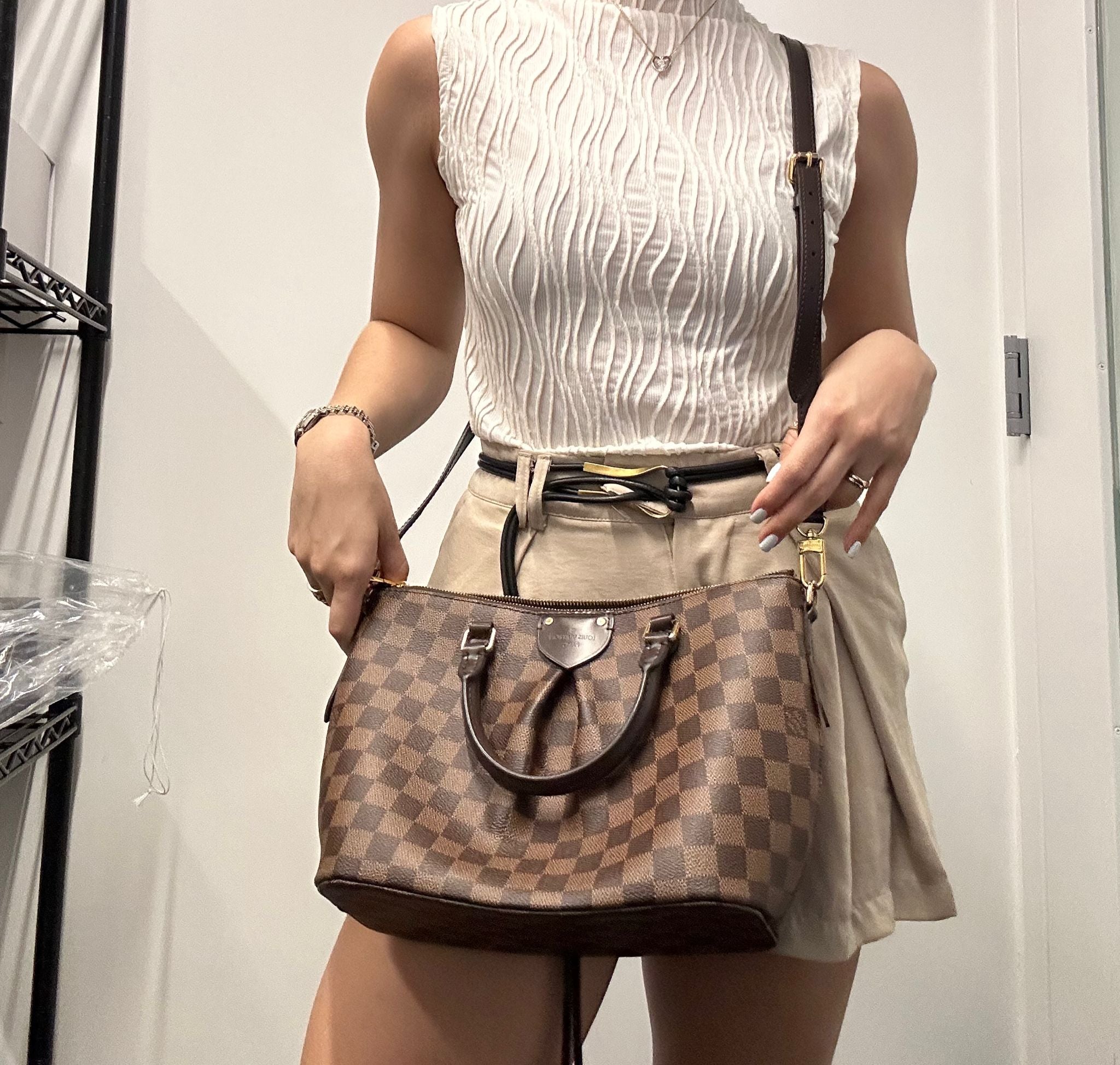 Experimente el lujo y la sofisticación con el bolso de mano Damier Ebene Sienna de LOUIS VUITTON. Su diseño icónico y sus detalles dorados añaden un toque de elegancia a cualquier atuendo. Realce su estilo y destaque con esta pieza atemporal.