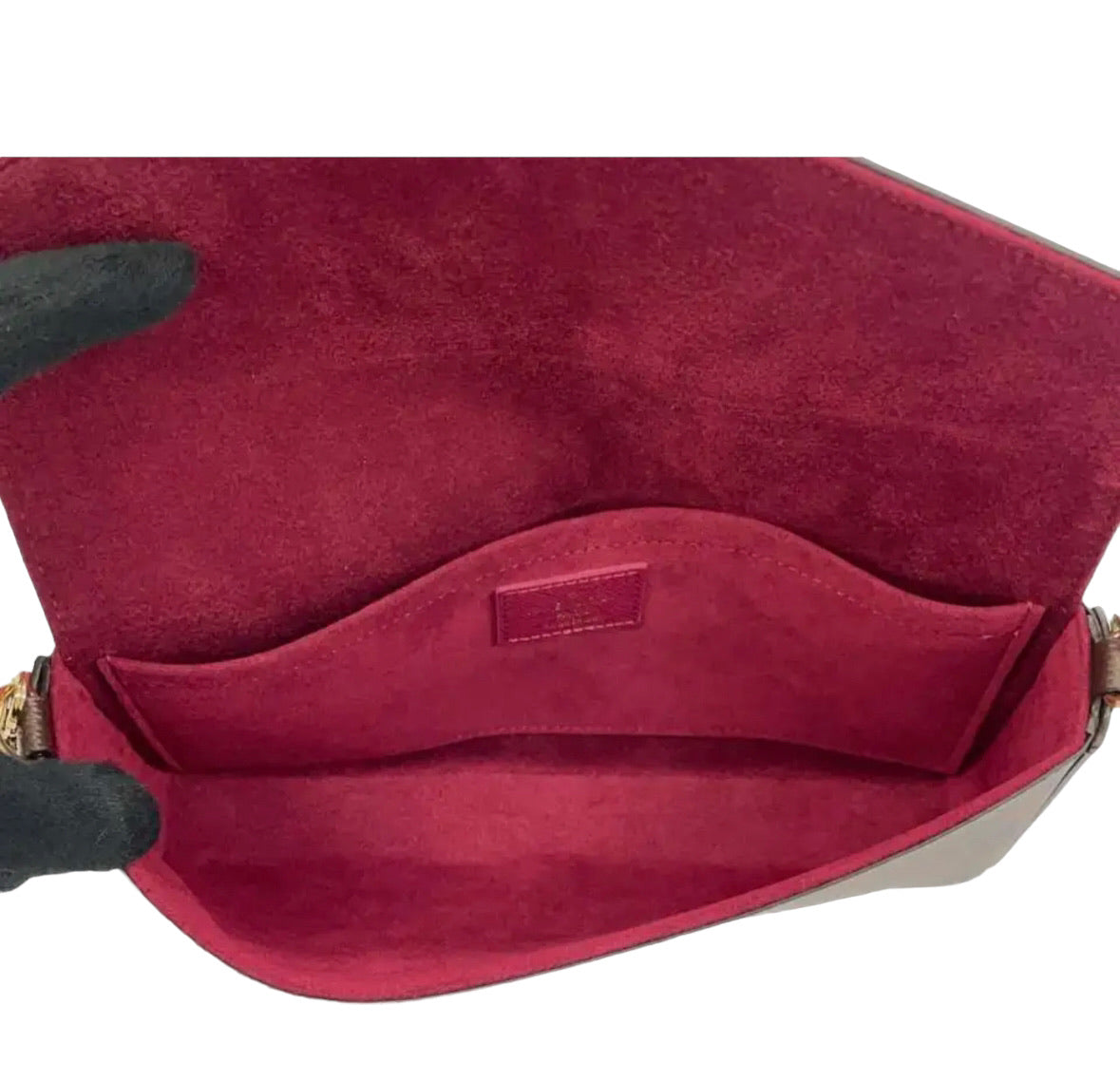 Realza tu estilo con el bolso de mano Felicie Damier Ebene de LOUIS VUITTON. Este accesorio versátil presenta un interior rojo espectacular y herrajes dorados que añaden un toque de lujo a cualquier atuendo. Esta pochette, la combinación perfecta de funcionalidad y elegancia, es un accesorio imprescindible para cualquier persona a la moda.