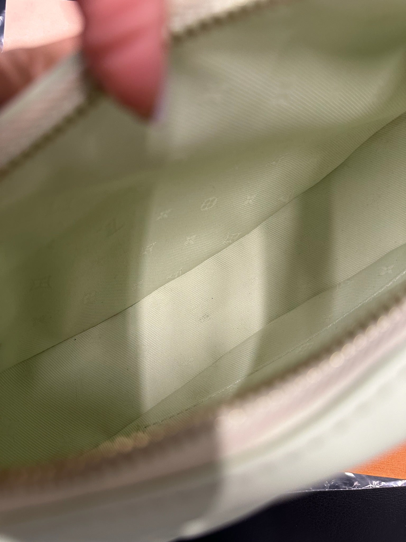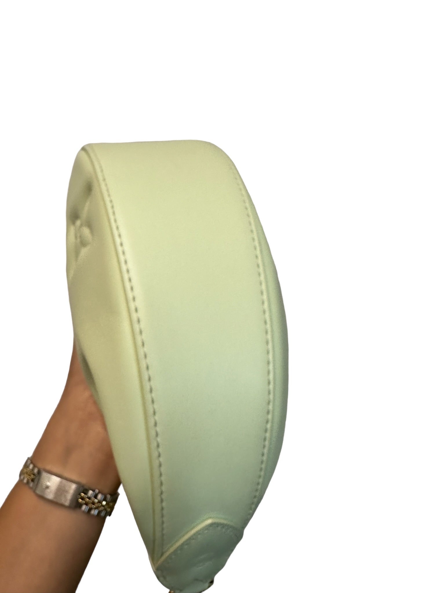 Disfrute del lujo con el clutch Bubblegram Over The Moon de LOUIS VUITTON. Este bolso, confeccionado en piel de becerro verde claro, se encuentra en muy buenas condiciones y solo tiene pequeñas marcas de suciedad en el interior. Irradie confianza y estilo con esta pieza llamativa.
