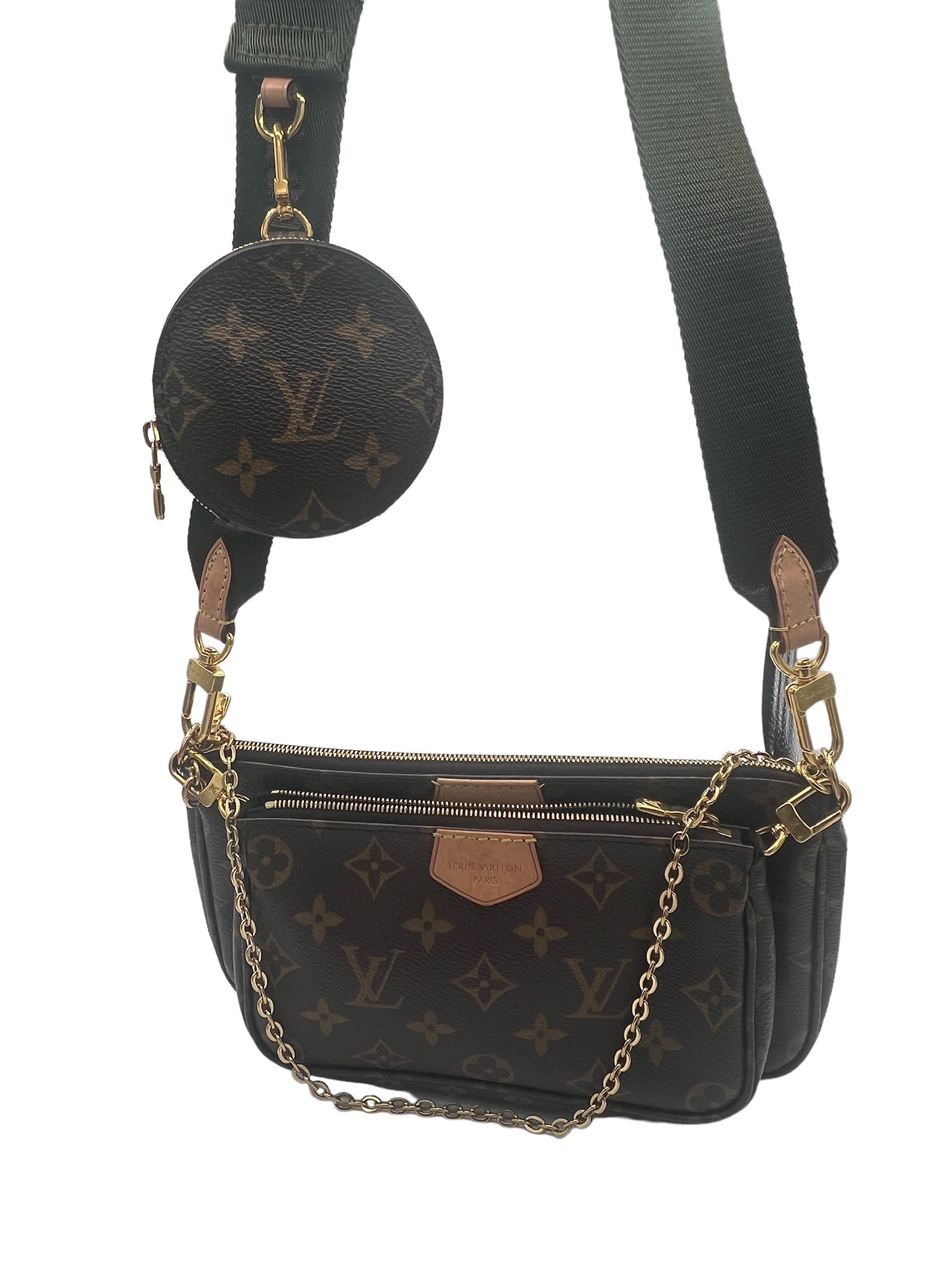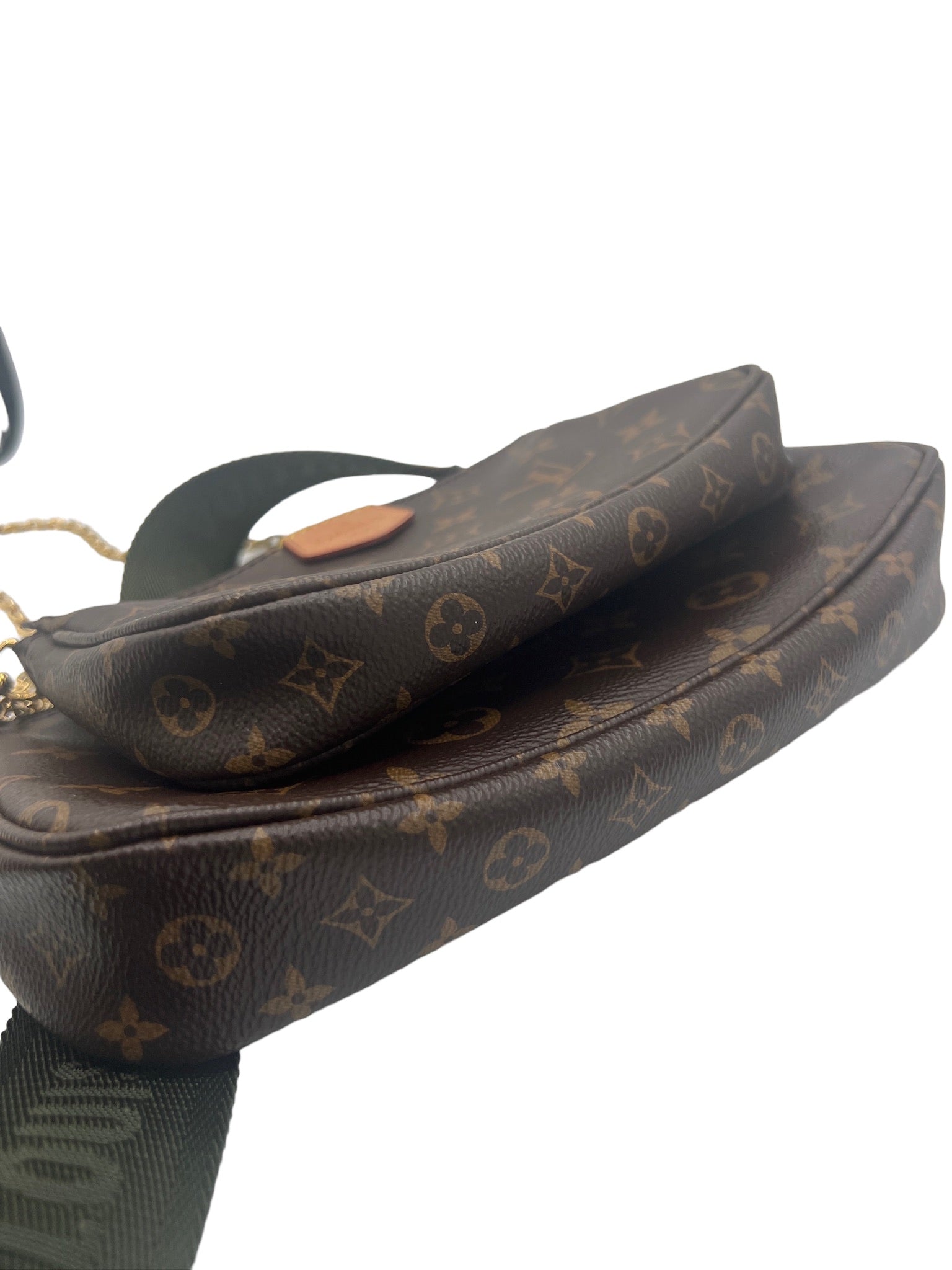 Este bolso Louis Vuitton Green Monogram Canvas Multipochette usado es un bolso bandolera perfecto para el uso diario. La silueta del bolso de este producto está diseñada para usarse cruzado para facilitar el movimiento y mantener las manos libres.
