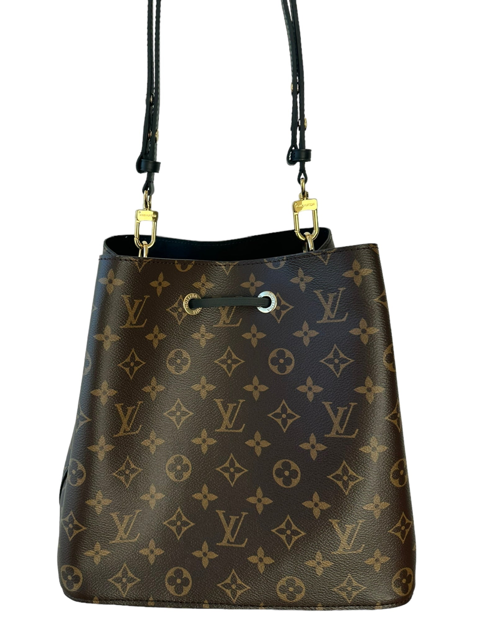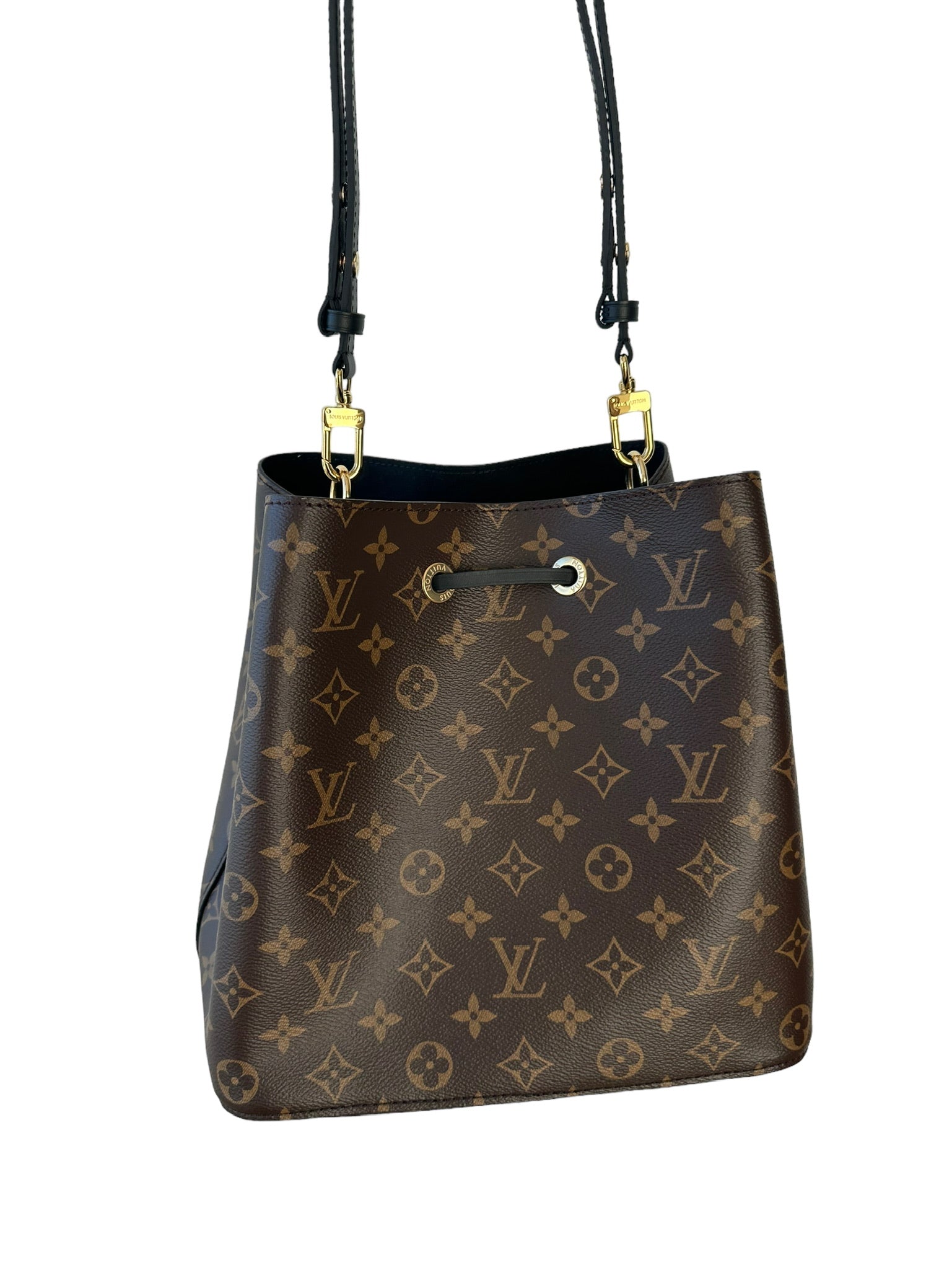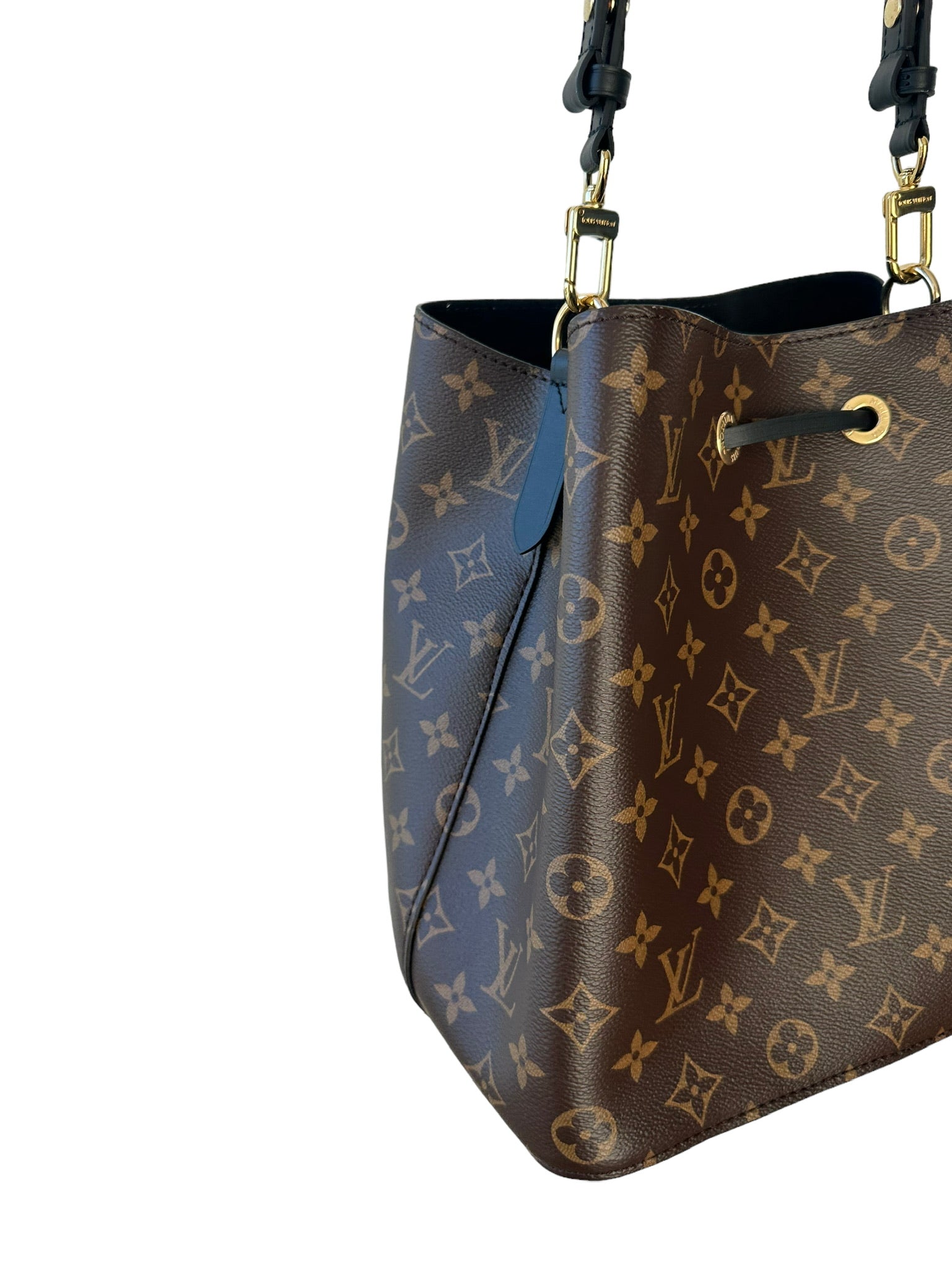 Este auténtico LOUIS VUITTON Neo Noe es un elegante bolso tipo cubo confeccionado en lona revestida con monograma negro. El bolso cuenta con una correa plana para el hombro, un cierre con cordón y herrajes en tono dorado. La amplia abertura facilita el acceso a los artículos desde el espacioso interior. Este es un bolso ideal para el uso diario.