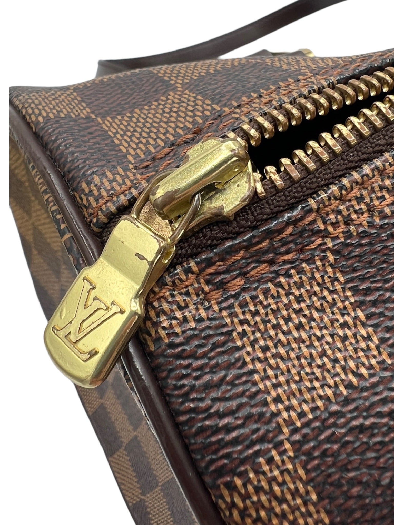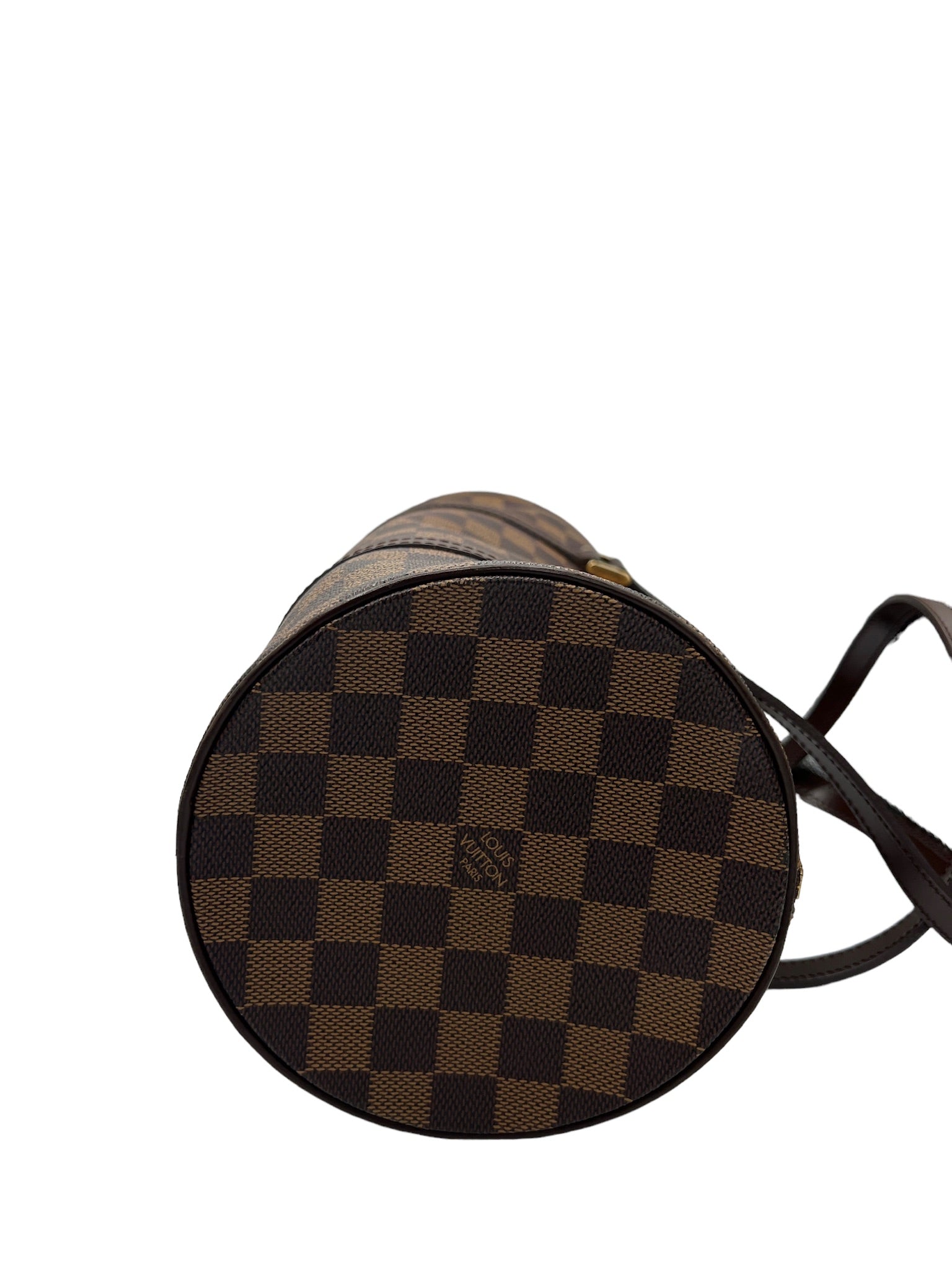 Este bolso de mano Papillon 30 Damier de LOUIS VUITTON usado es un bolso clásico con asa superior que realzará cualquier atuendo. Este bolso, confeccionado en lona Ebene Damier duradera, tiene un tono marrón que complementará perfectamente tu estilo.