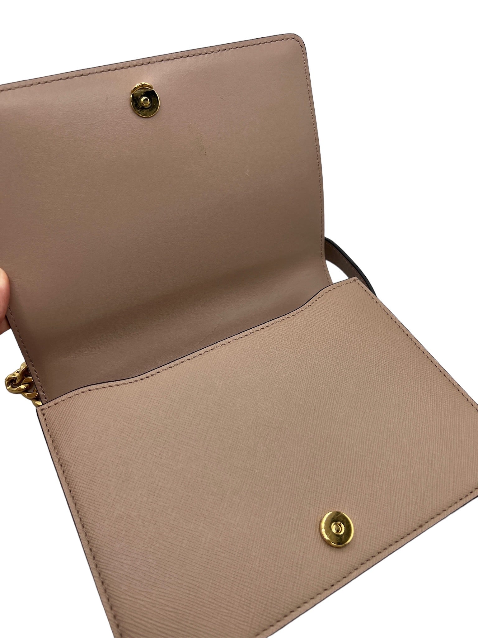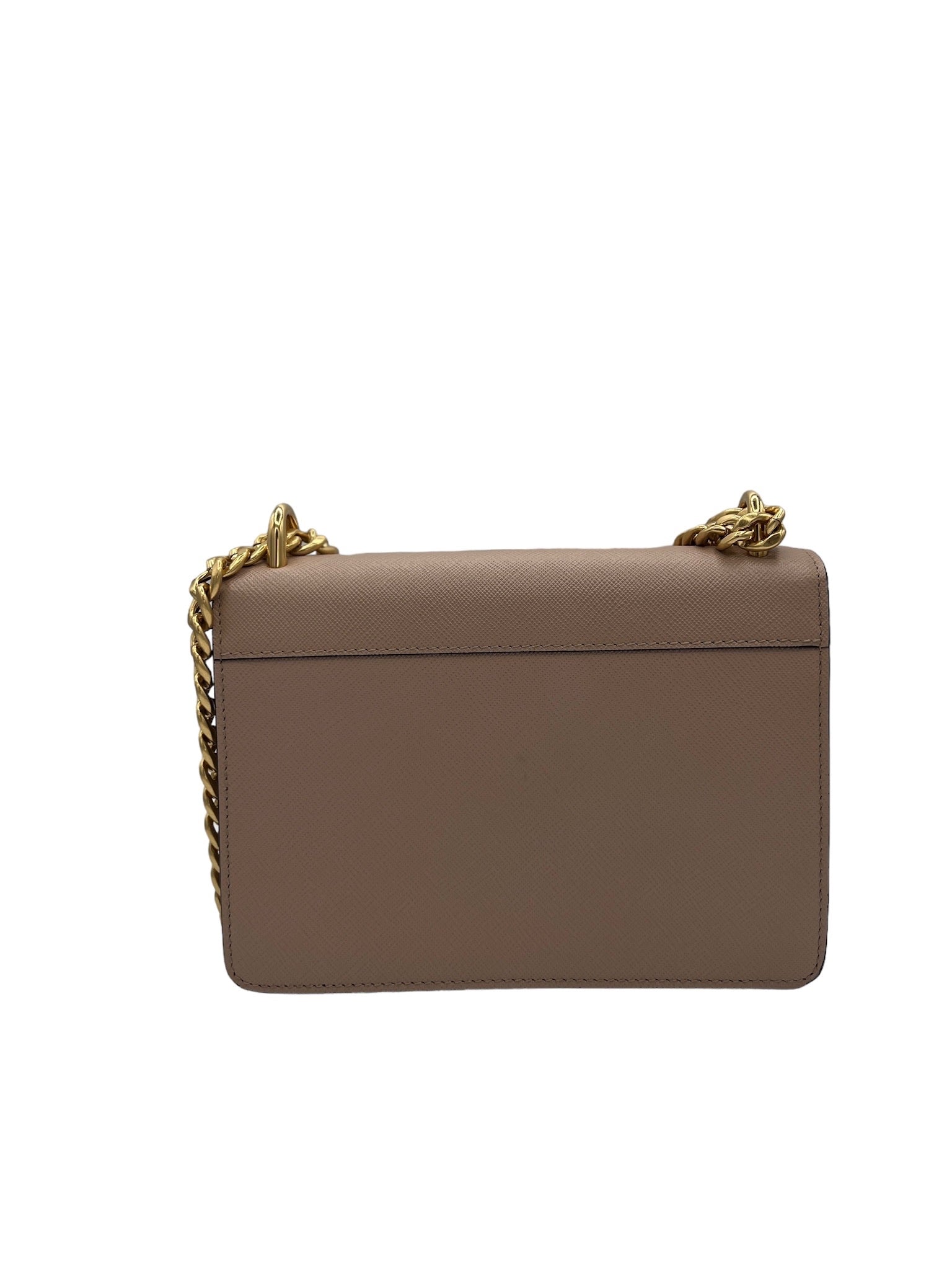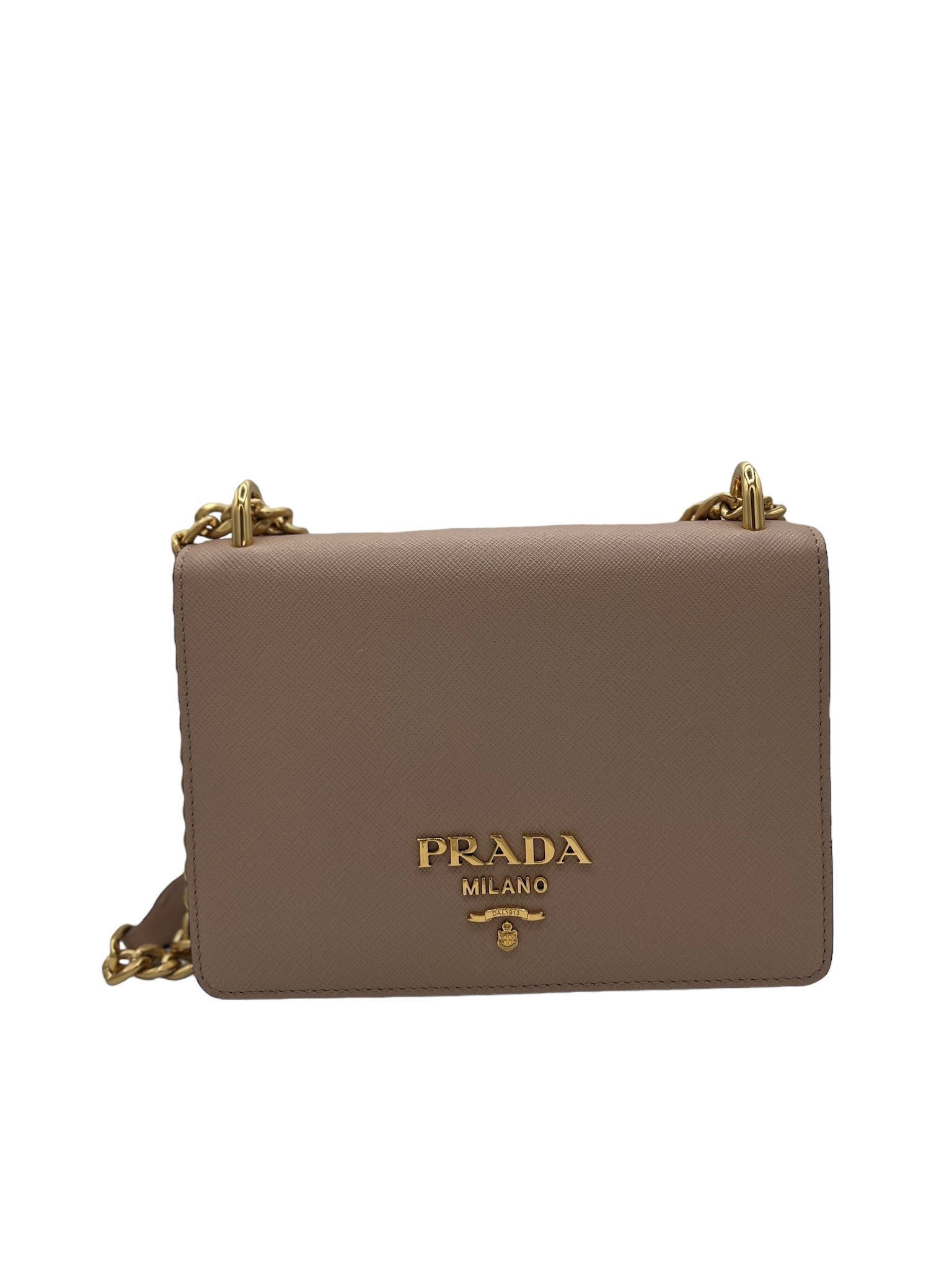 Este bolso de hombro PRADA usado en piel Saffiano beige es el complemento perfecto para cualquier guardarropa moderno.