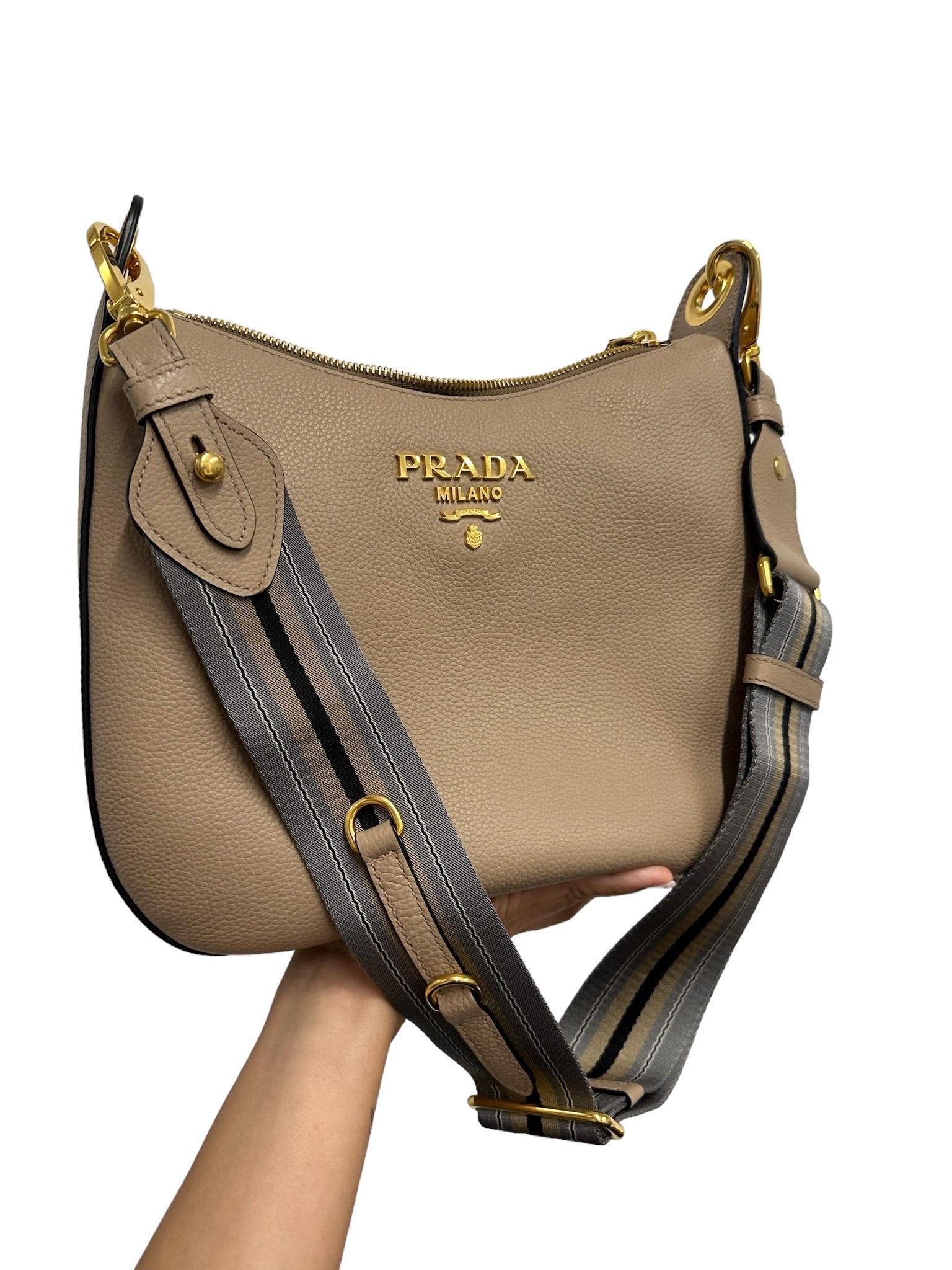 Realza tu estilo con el bolso bandolera con cremallera suave Vitello Danio en color beige de PRADA. Con sus lujosos herrajes en tonos dorados, este bolso bandolera es la pieza perfecta para cualquier atuendo. Experimenta el encanto de PRADA y agrega un toque de sofisticación a tu guardarropa.