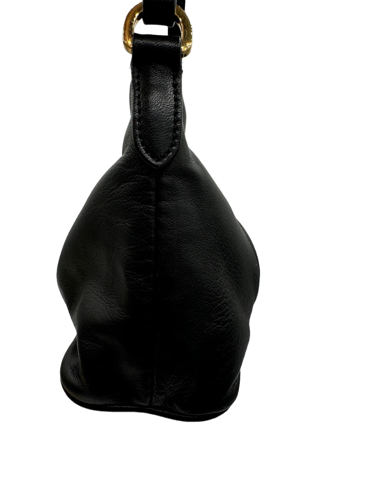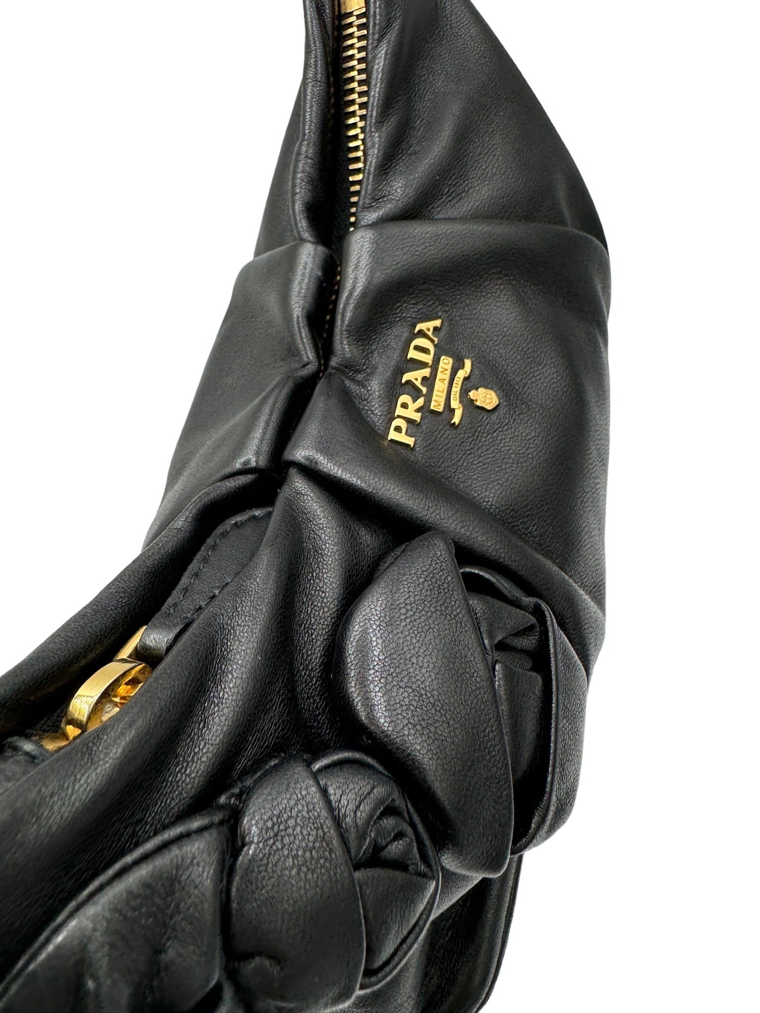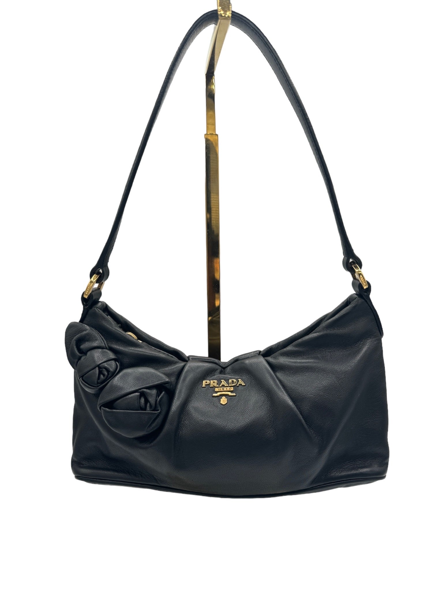 Este bolso de hombro PRADA de piel Glace en color negro con rosas usado es una incorporación sorprendente a la colección de cualquier amante de la moda. Los detalles en tono dorado le añaden un toque de elegancia a este bolso ya de por sí hermoso.