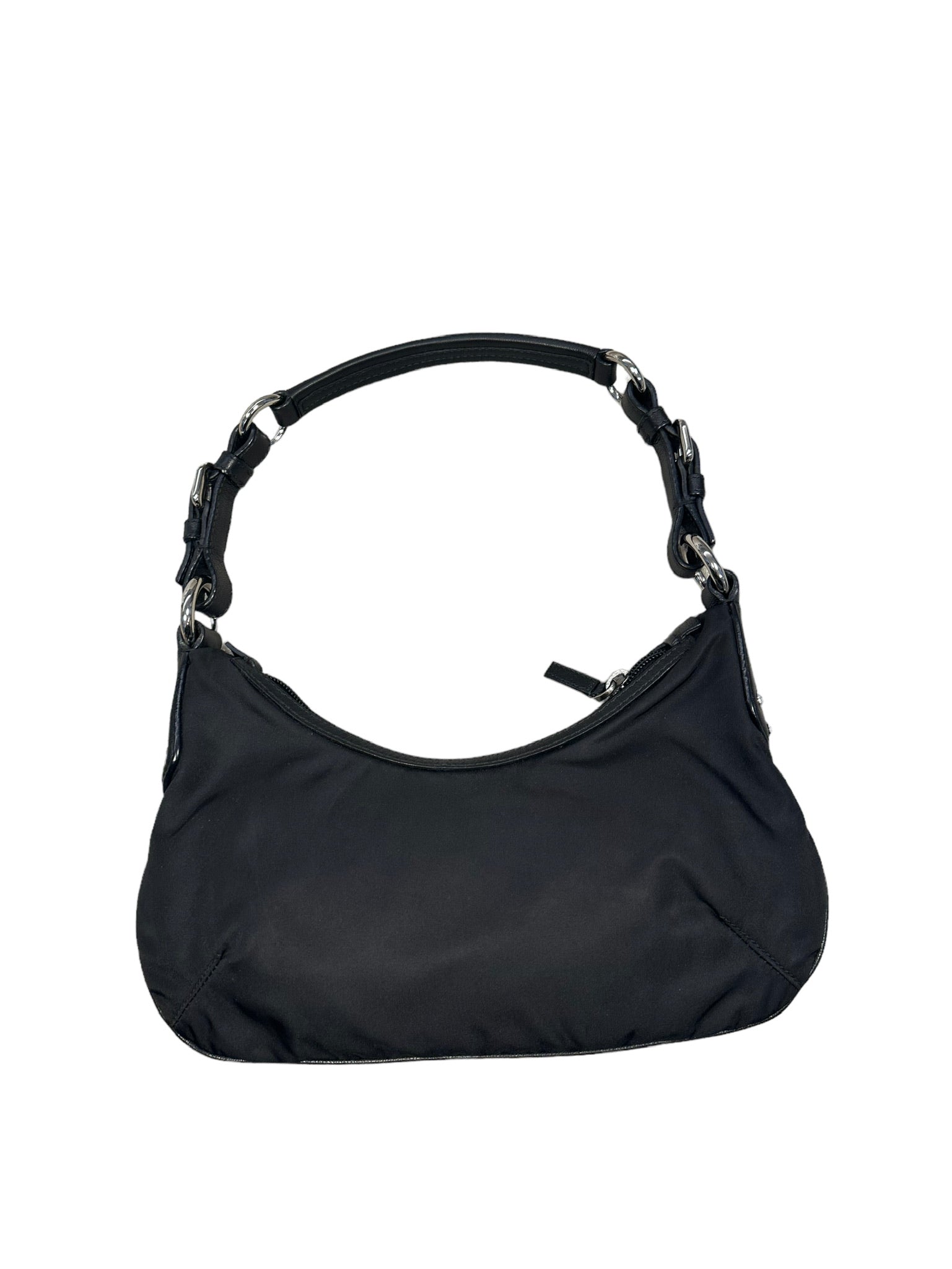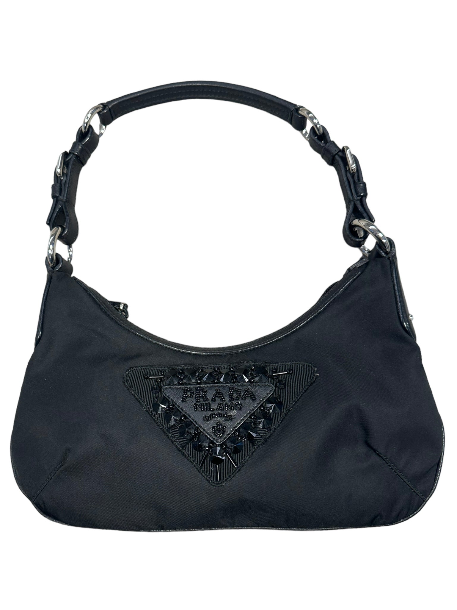Este bolso de mano PRADA de nailon negro con cuentas y logotipo, elaborado por expertos con herrajes plateados, realza cualquier look con su diseño elegante y sofisticado. Esta pochette, la combinación perfecta de estilo y funcionalidad, es un accesorio imprescindible para cualquier persona a la moda.