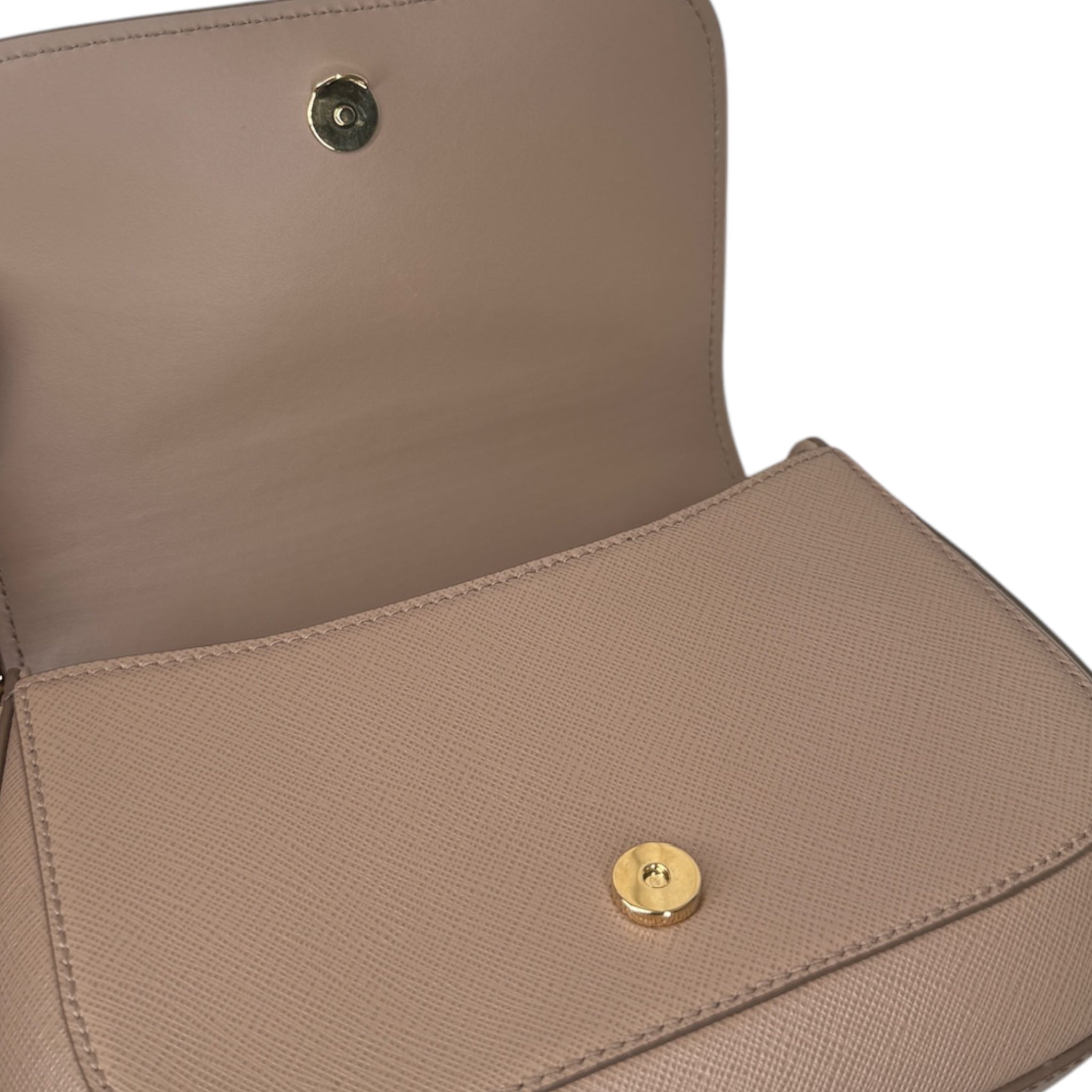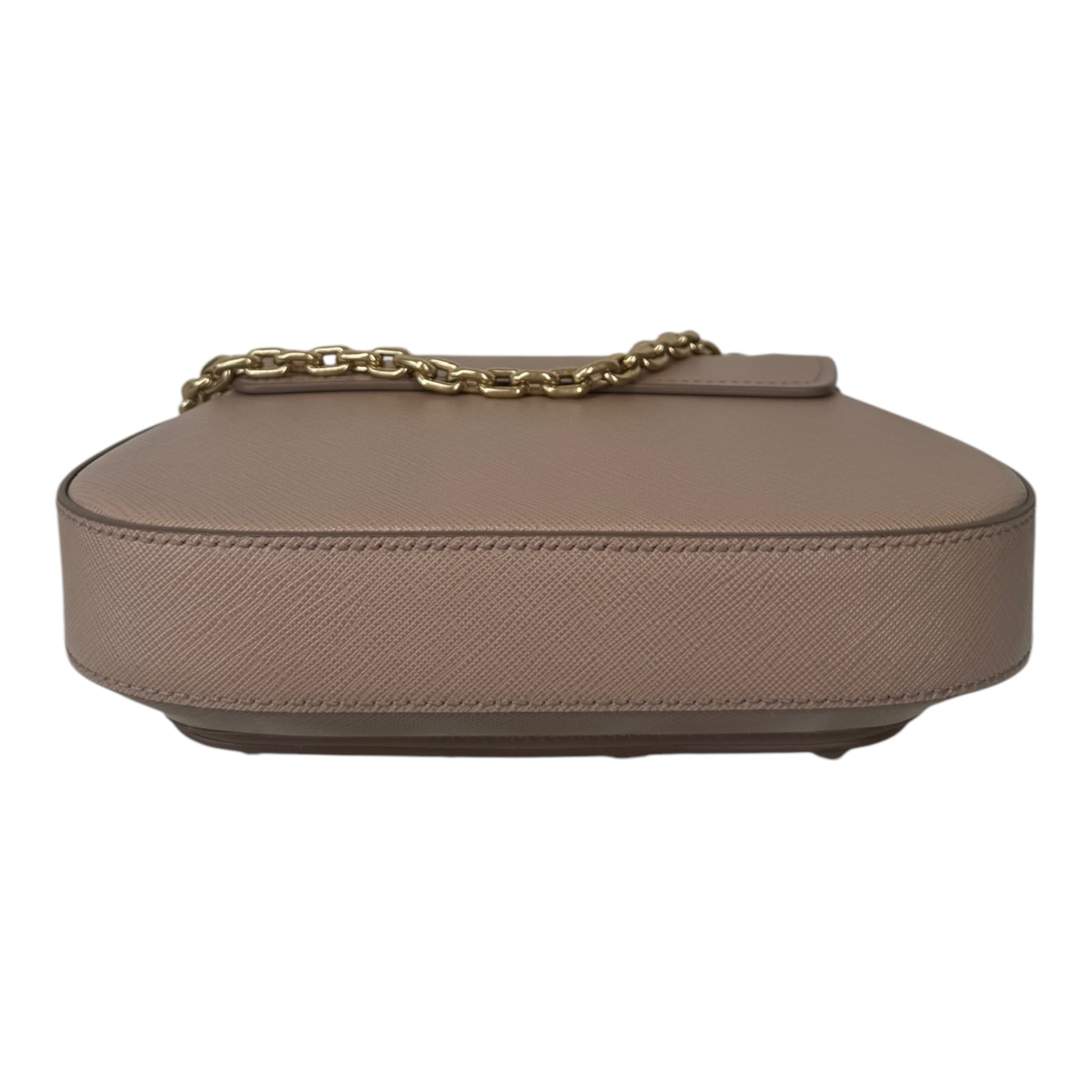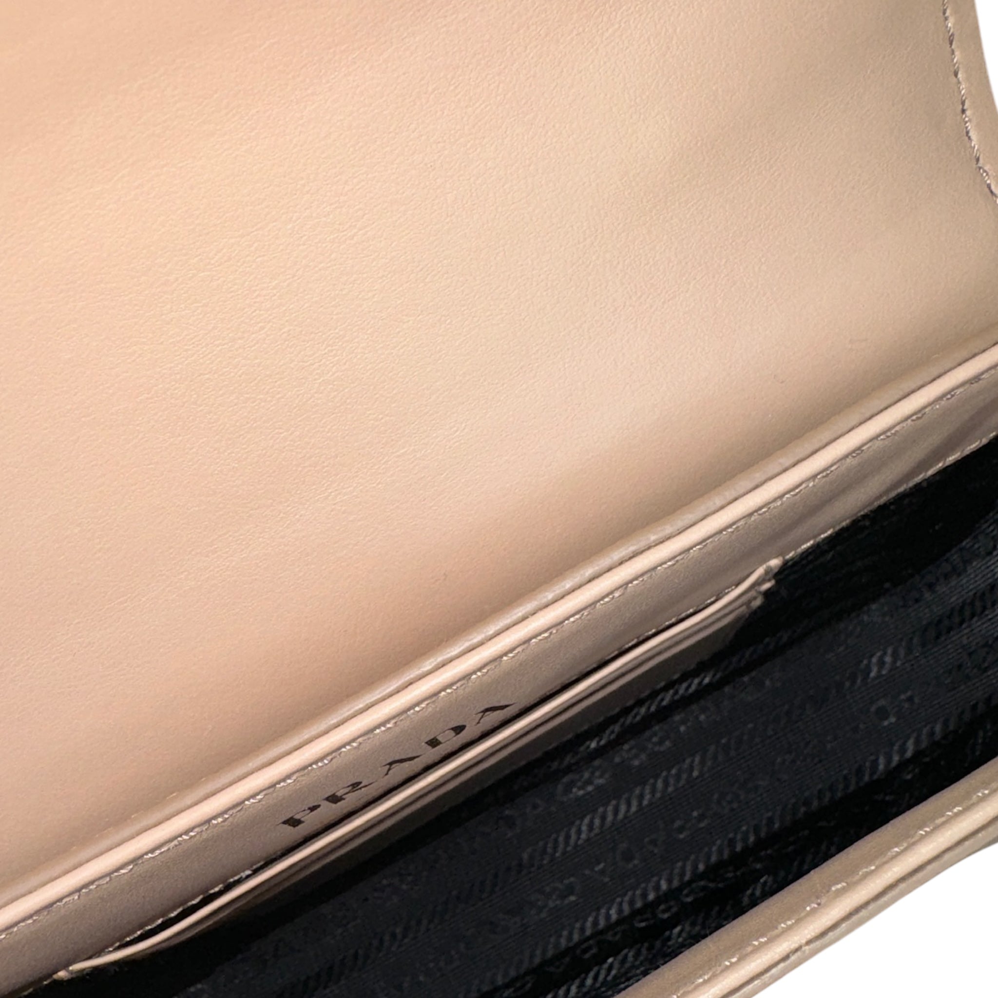 Descubra la elegancia del bolso de hombro de piel saffiano beige de PRADA, un accesorio elegante que combina a la perfección sofisticación y practicidad.