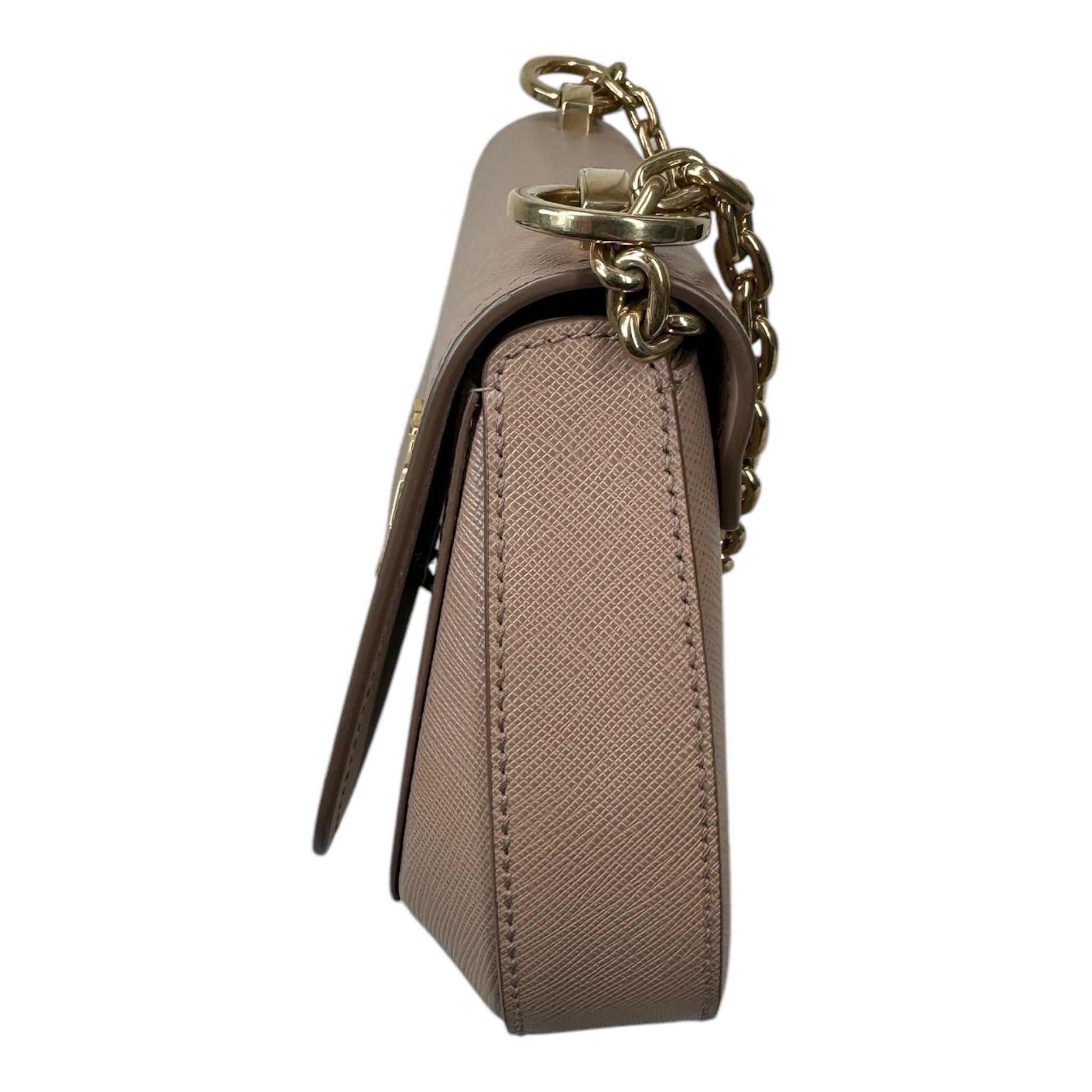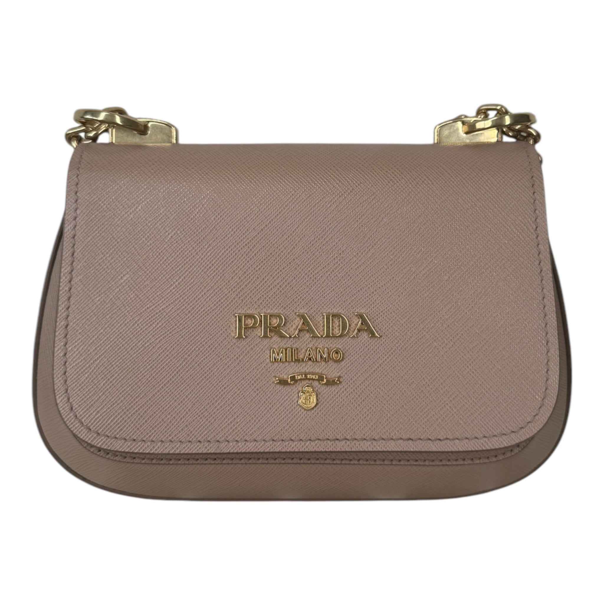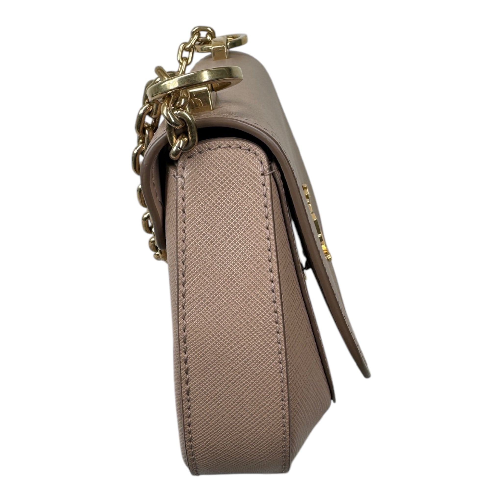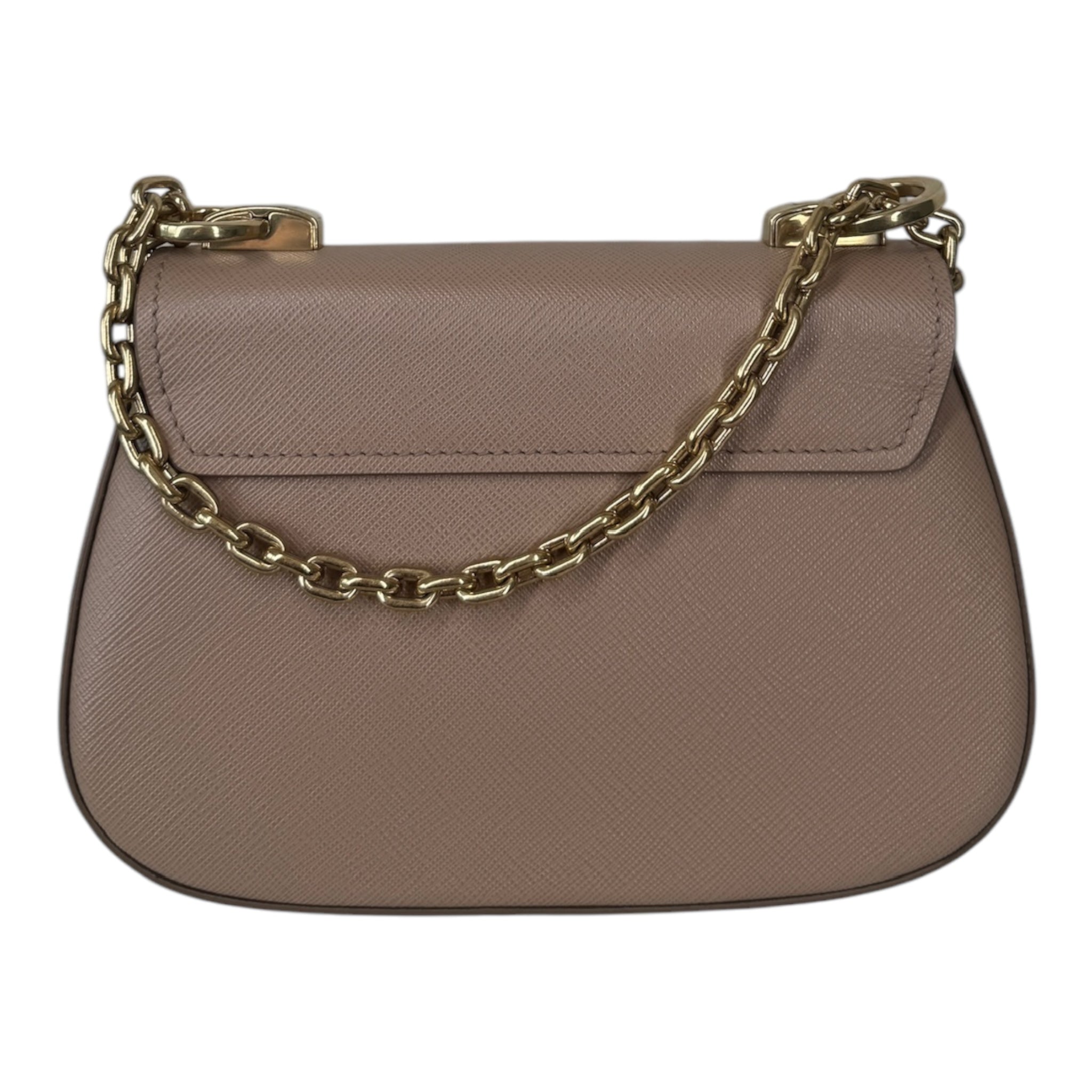 Mejora tu juego de accesorios con el bolso de hombro de piel saffiano beige de PRADA, una incorporación imprescindible a tu colección.