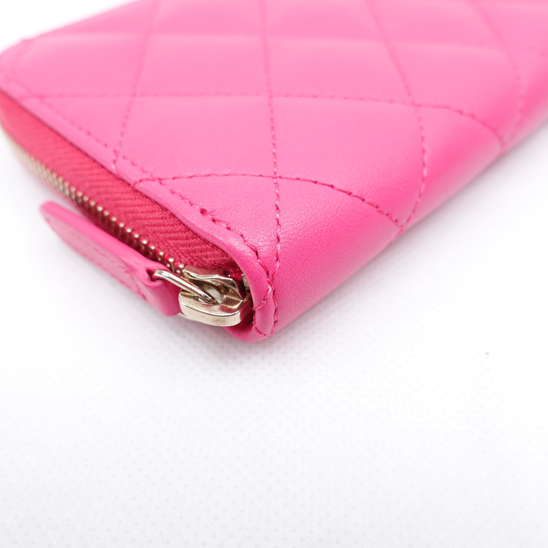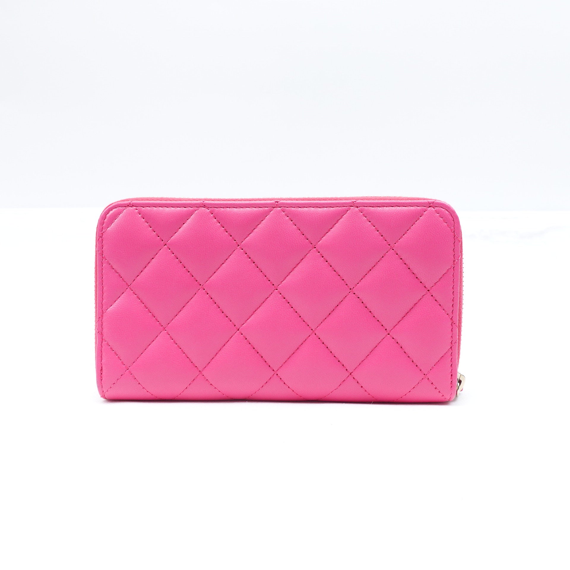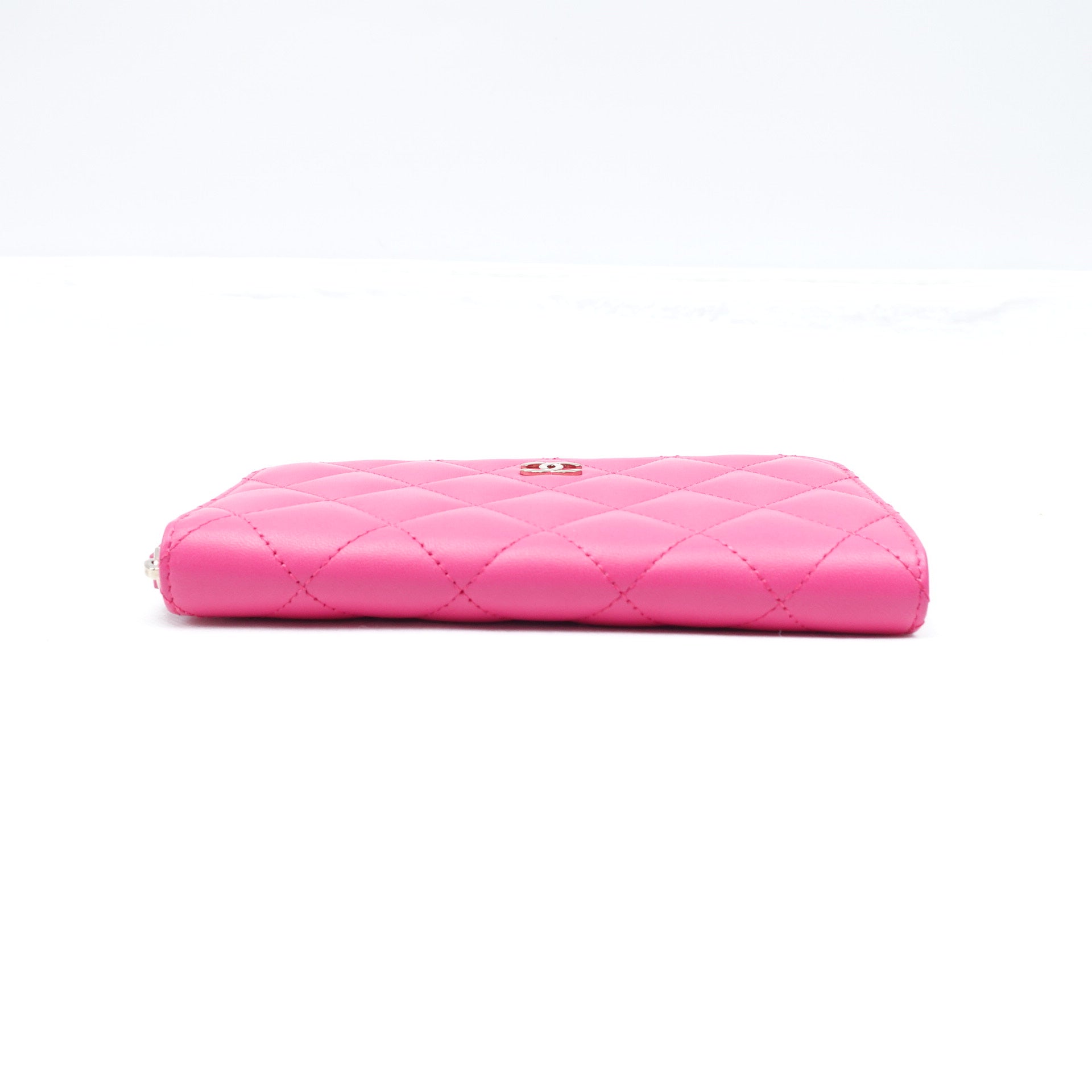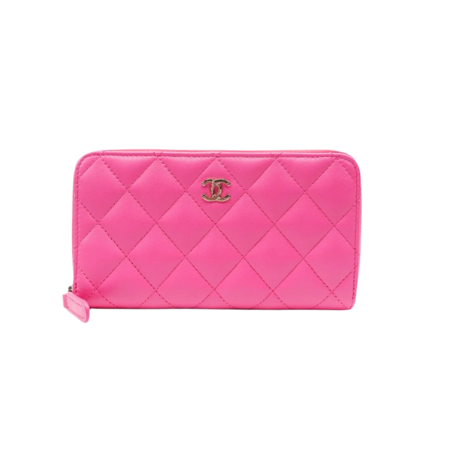 Mejora tu juego de accesorios con la cartera grande con cremallera y fuelle acolchado de piel de cordero rosa de CHANEL, una combinación perfecta de estilo y funcionalidad.