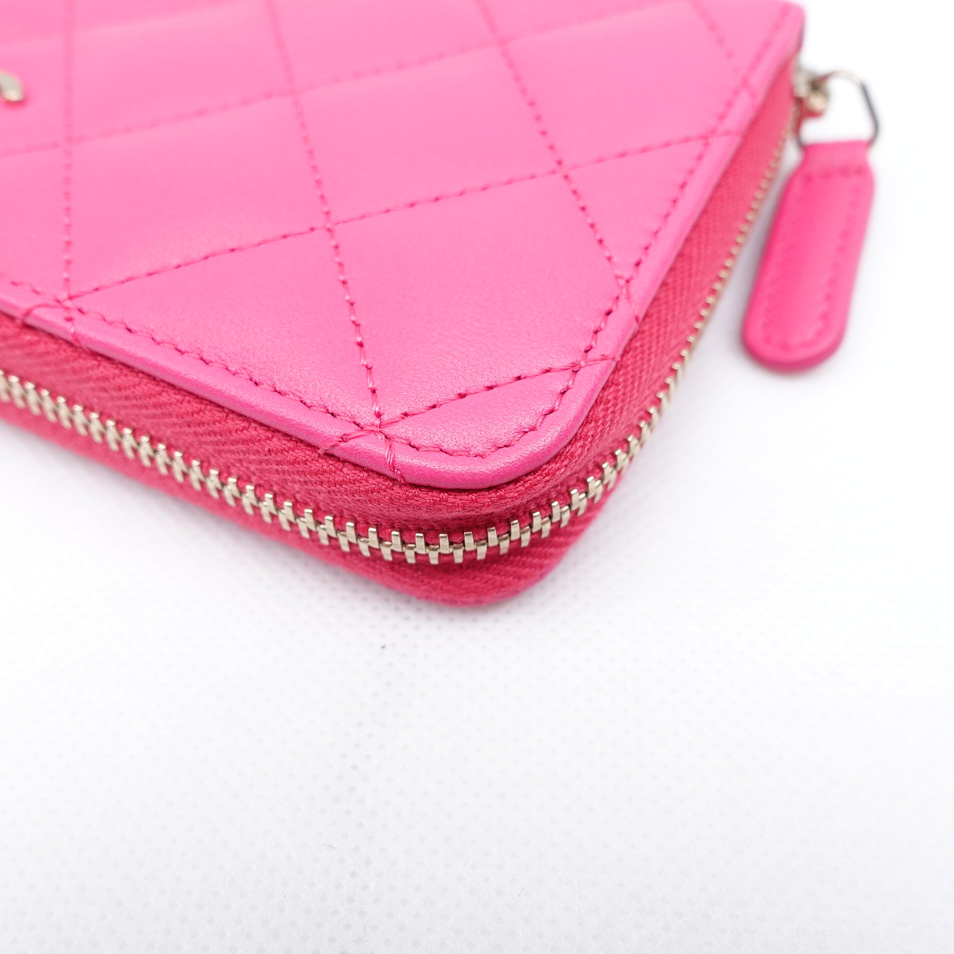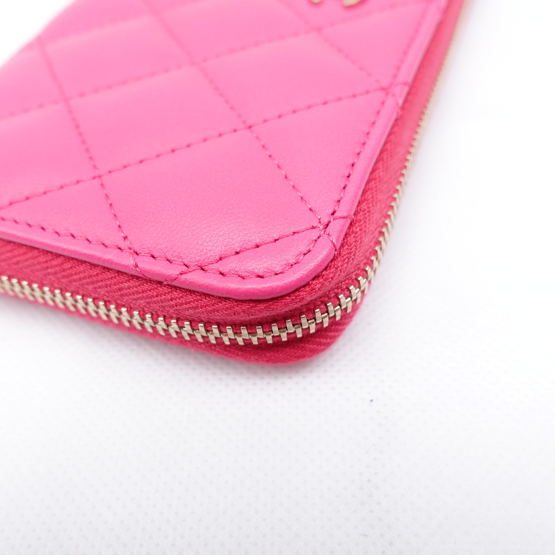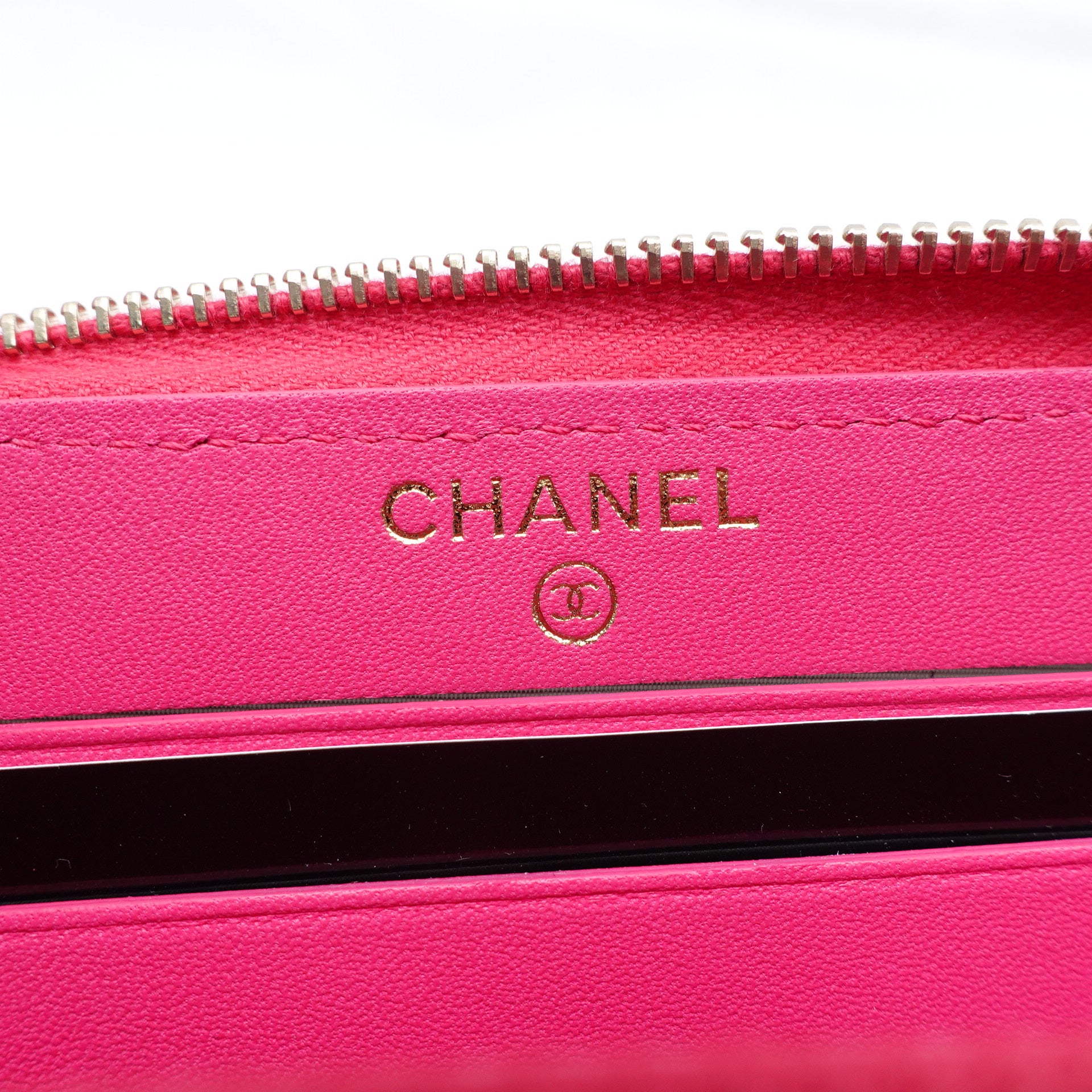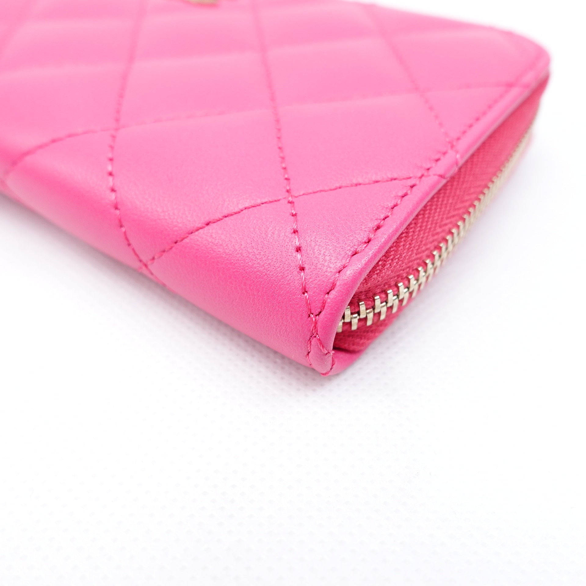 Mejora tu juego de accesorios con la cartera grande con cremallera y fuelle acolchado de piel de cordero rosa de CHANEL, una combinación perfecta de estilo y funcionalidad.