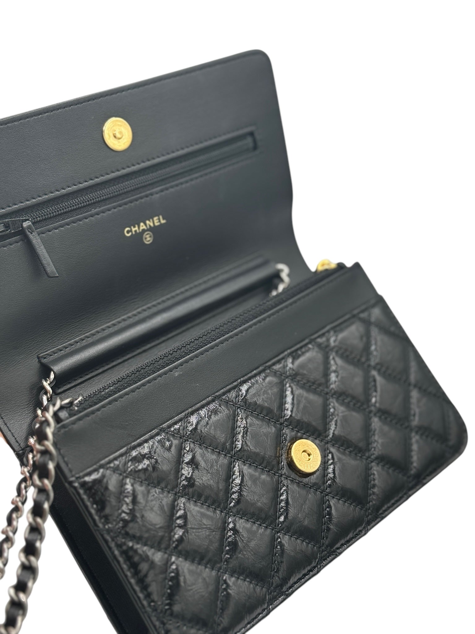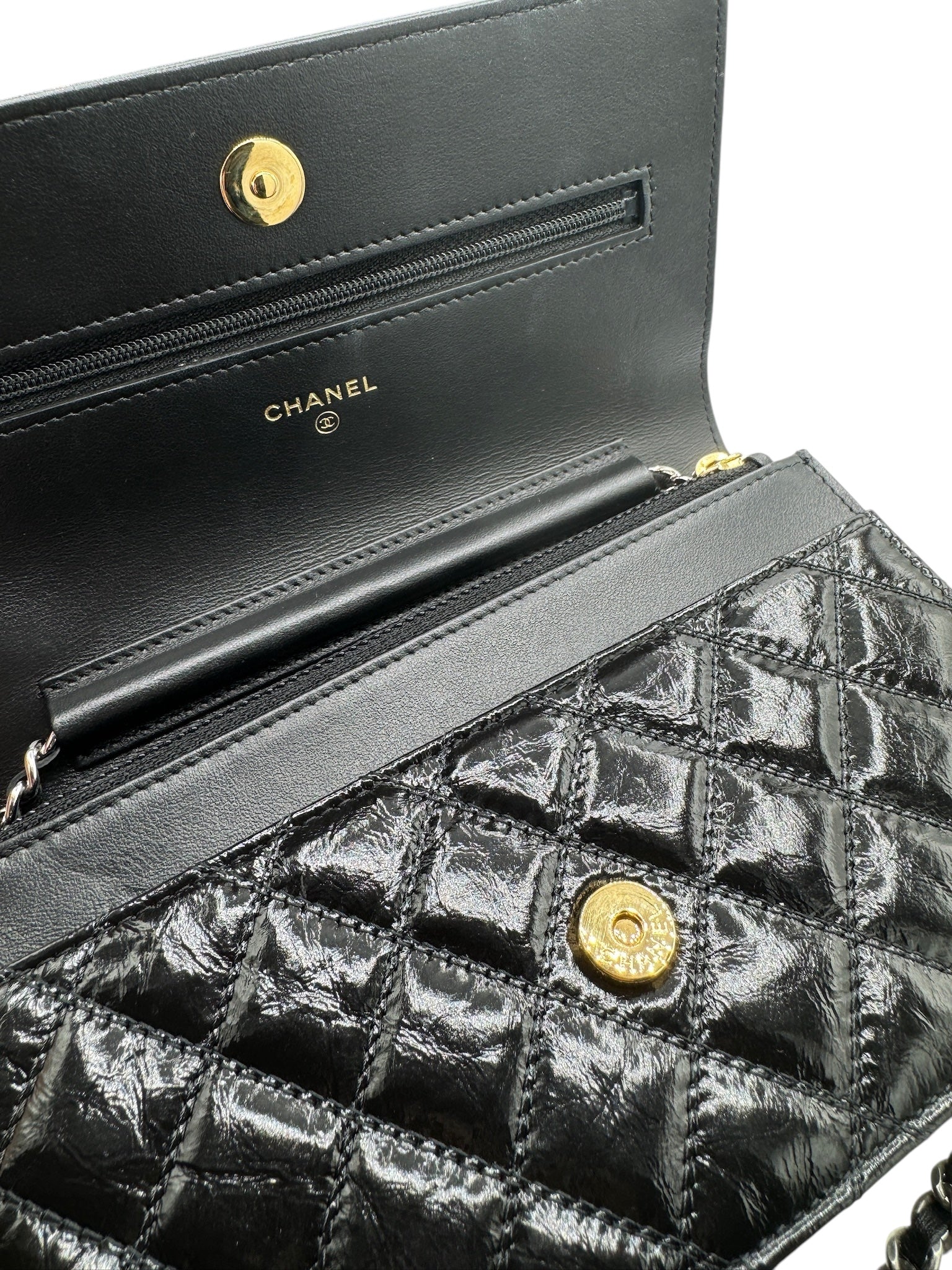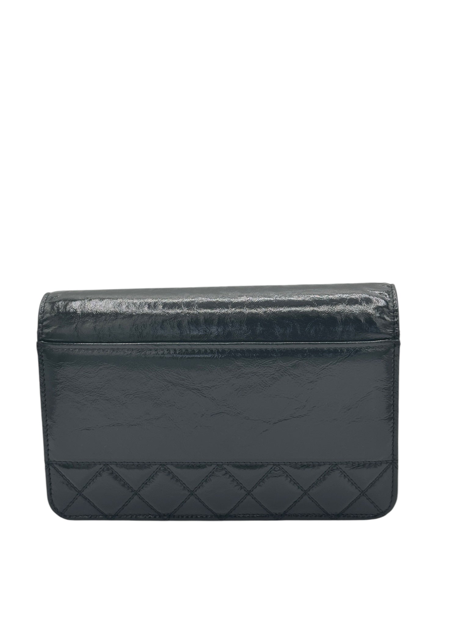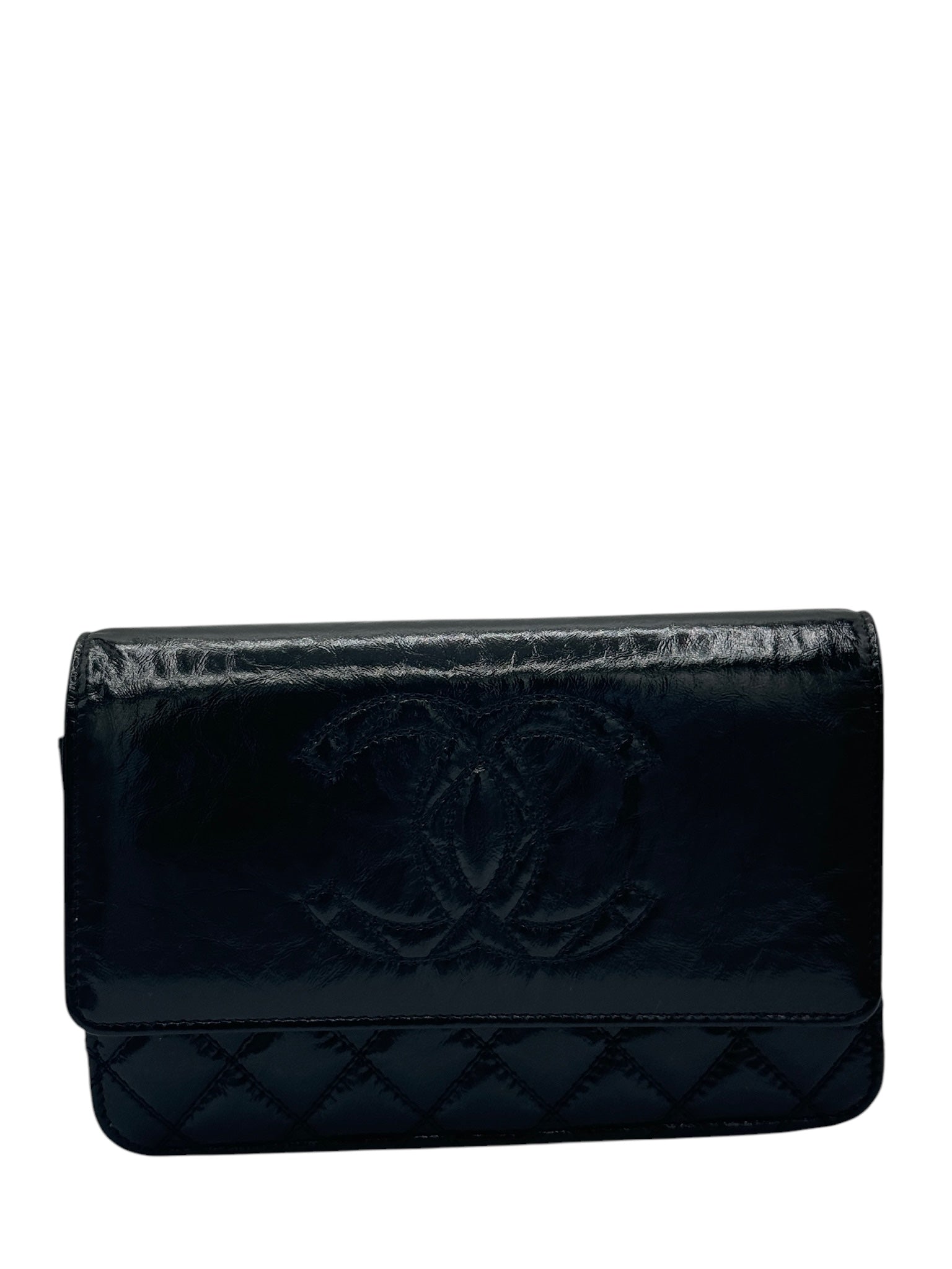 Cartera con cadena y bandolera de piel de becerro envejecida brillante y acolchada negra Timeless de CC USADA